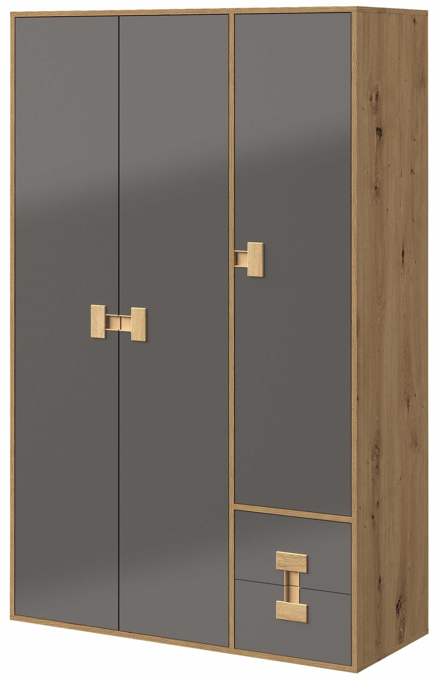 Garderobni ormar Index 04 marke Domel kombinira moderan izgled s praktičnim dizajnom koji osigurava uredan i estetski dovršen prostor. Precizno izrađen od kvalitetne iveralne laminirane ploče debljine 16 mm, odlikuje se iznimnom stabilnošću i dugim vijekom trajanja. Kombinacija boja siva sjaj i artisan hrast sjaj stvara profinjen kontrast koji se odlično uklapa i u moderne i u klasične interijere.