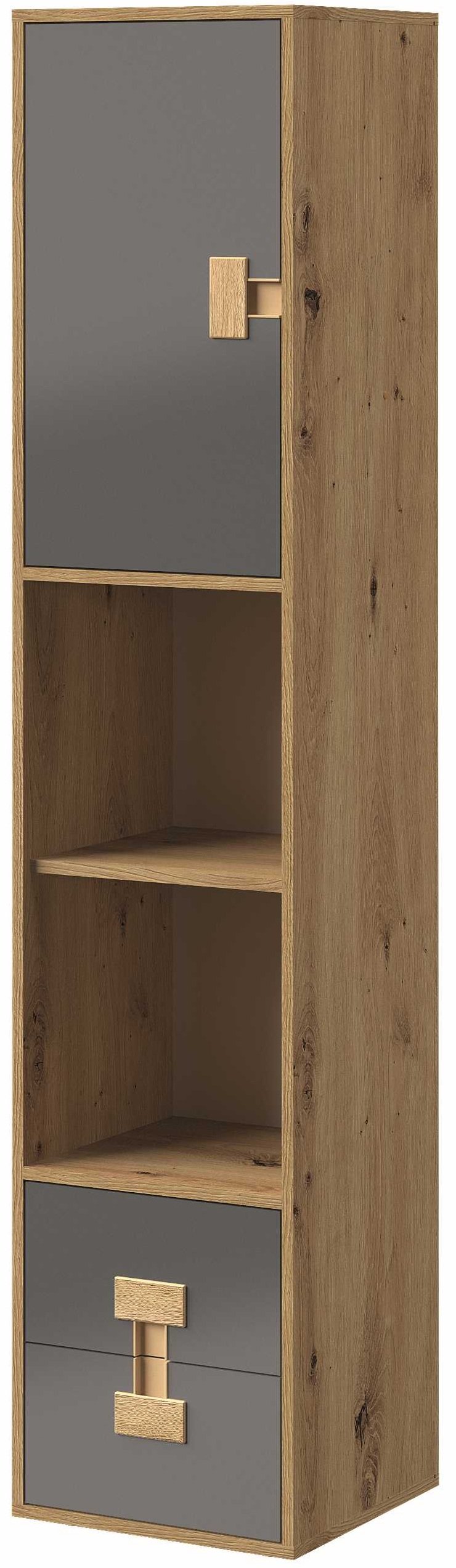 Posebnost regala Index 06 je njegov profinjen izgled koji spaja dvije popularne boje: sivu sjaj i artisan hrast sjaj. Siva boja sa sjajnom površinom izražava suvremenost i eleganciju, dok toplina hrasta dodaje prirodni karakter. Ova kombinacija omogućuje da se regal lako uklopi u različite unutarnje stilove – od minimalističkog i industrijskog do skandinavskog ili klasičnog.