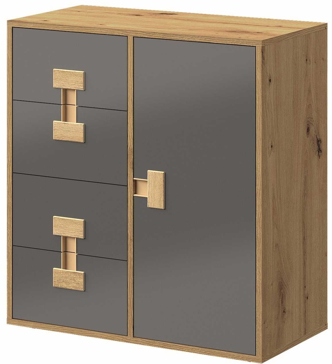Površina komode Index 07 oduševljava kontrastom između toplog tona artisanskog hrasta i hladnog sjaja sive boje. Takva kombinacija stvara uravnotežen i moderan izgled koji se bez poteškoća uklapa u različite stilove unutarnjeg uređenja – od minimalističkog do klasično domaćeg. Drveni dekor hrasta donosi osjećaj topline, dok siva sjajna površina dodaje dašak modernosti i elegancije.