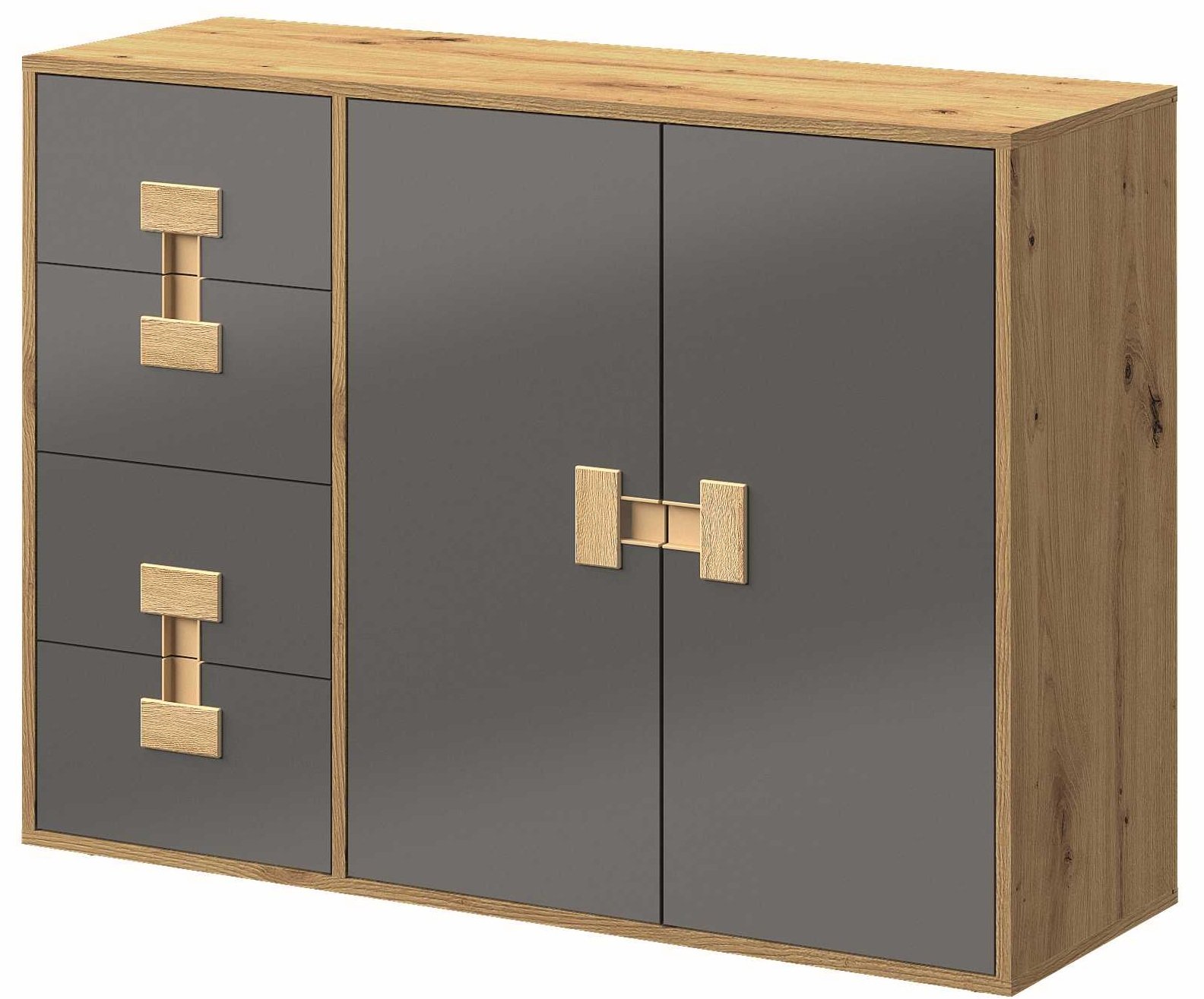 Komoda Index 08 svojom kombinacijom sive sjajne površine i artisan hrasta sjaja djeluje kao elegantan dodatak stambenom prostoru. Njezine ravne linije i uravnoteženi omjeri stvaraju moderan izgled koji se lako uklapa u postojeći namještaj. Bez obzira postavite li je u dnevnu sobu, spavaću sobu ili hodnik, komoda će uvijek izgledati uredno i profinjeno.