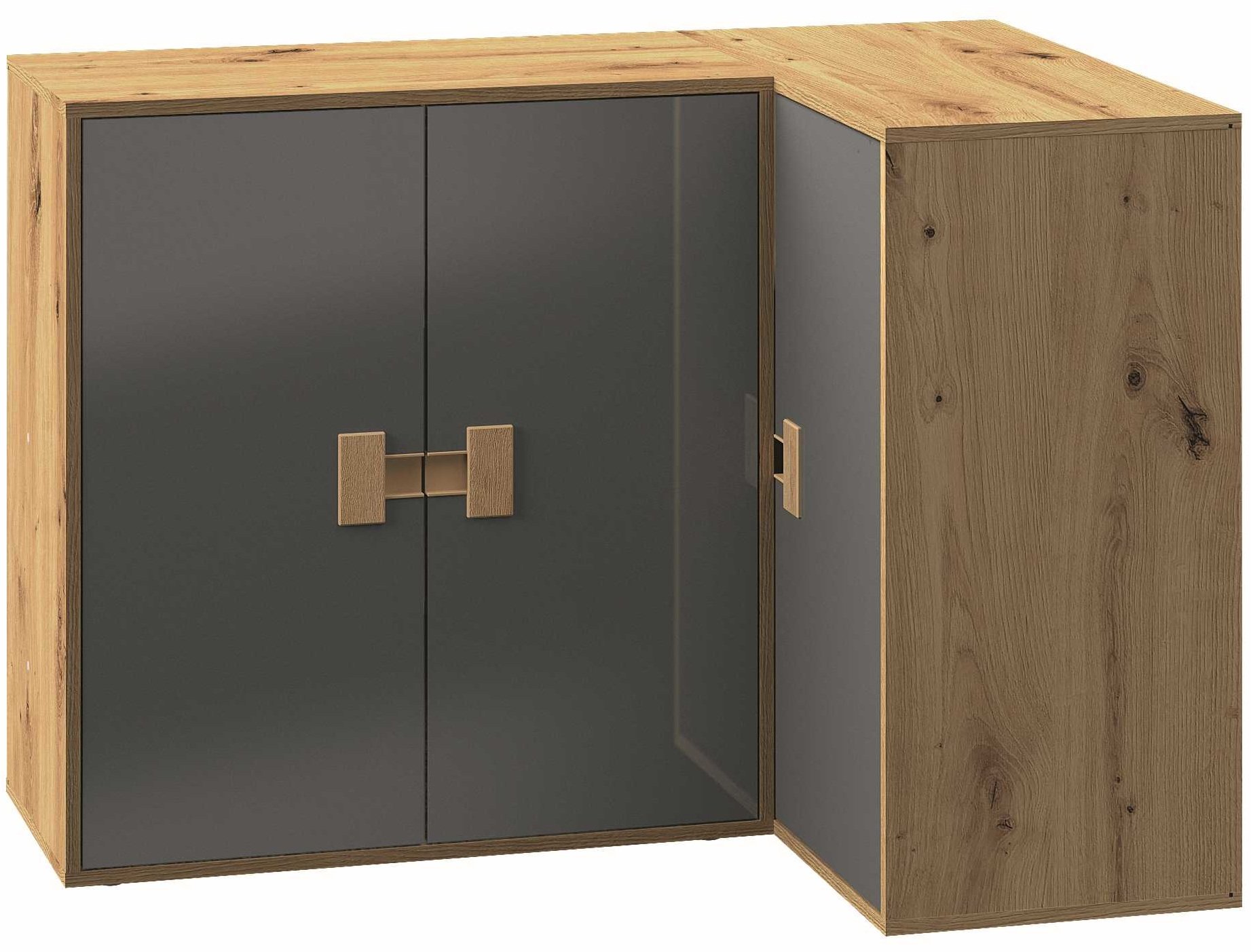 Kutna komoda Index 09 izvrsno se uklapa u minimalističke i skandinavske stilove, ali i u klasične prostore gdje je poželjan dašak suvremenosti. Sjajna siva površina lijepo ističe svijetle zidove, dok drvena nijansa artisan hrasta stvara toplinu i vizualnu dubinu. Komodu možete kombinirati s ostalim elementima serije Index, poput visećih vitrina, TV-ormarića ili regalnih sustava u istoj kombinaciji boja. Na gornju površinu komode možete postaviti dekorativne predmete, svjetiljke ili biljke, što dodatno oplemenjuje prostor.