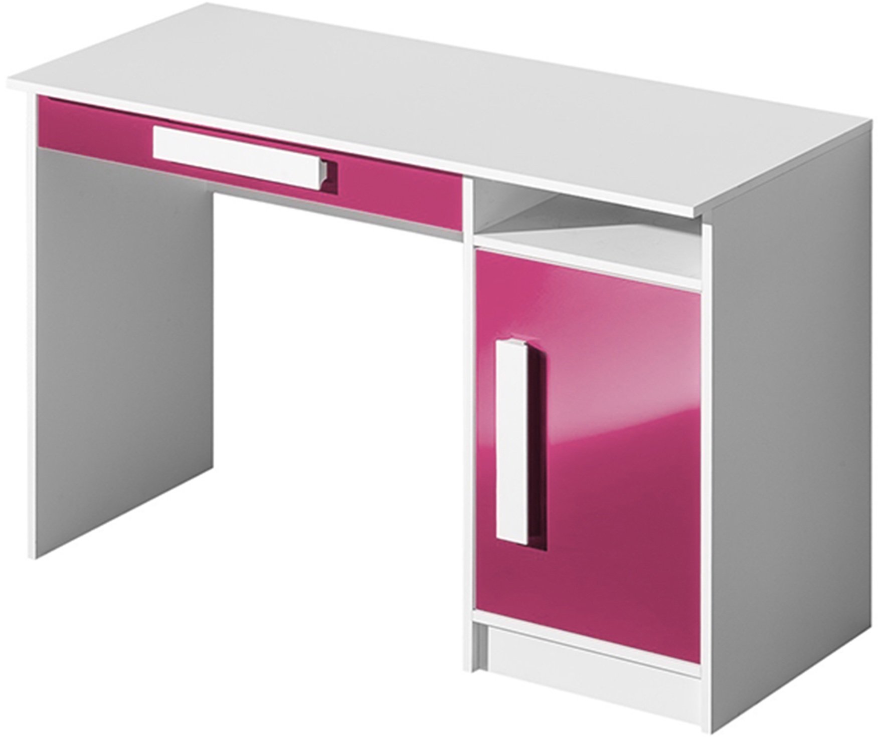 Kombinacija bijele i ružičaste boje stvara svijetao i ugodan ambijent koji potiče kreativnost i dobro raspoloženje. Fronte ladica ili vrata su u nježnoj ružičastoj nijansi, koja se lijepo nadopunjuje s neutralnom bijelom bojom korpusa. Poseban detalj predstavljaju šarene ručke, koje su dostupne u različitim bojama – bijeloj, zelenoj, crvenoj, plavoj, ljubičastoj i sivoj. Tako je moguće stol prilagoditi osobnom ukusu ili dekoru prostora, a istovremeno unijeti dašak razigranosti i individualnosti.