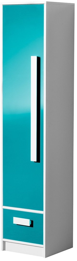 Posebnost modela Guliver 04 je njegova mogućnost prilagodbe boja. Fronte u tirkiznoj boji djeluju živahno i energično, dok korpus u bijeloj boji osigurava vizualnu ravnotežu. Kombinacija ove dvije boje stvara ugodan kontrast koji se lijepo uklapa u omladinske sobe, moderne dnevne boravke ili svijetle hodnike. Ručke su dostupne u više boja – bijeloj, zelenoj, crvenoj, plavoj, ljubičastoj i sivoj – što omogućuje da regal prilagodite osobnom ukusu ili koloritu prostora. Ručke su izrađene od izdržljive plastike, što osigurava lagano korištenje i dugotrajnost bez trošenja.
