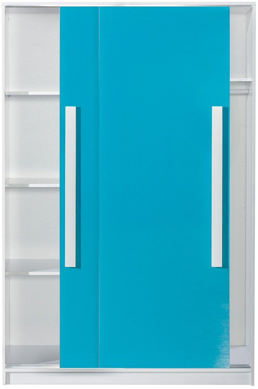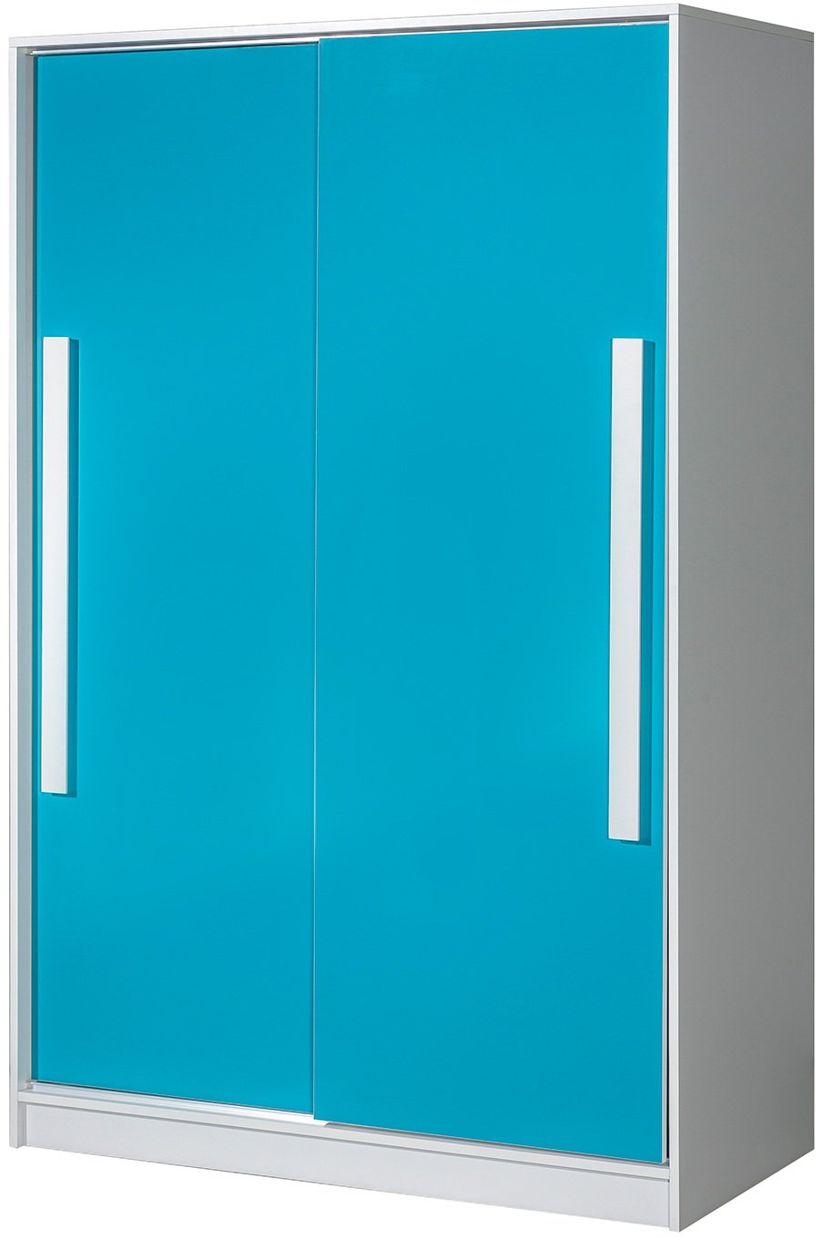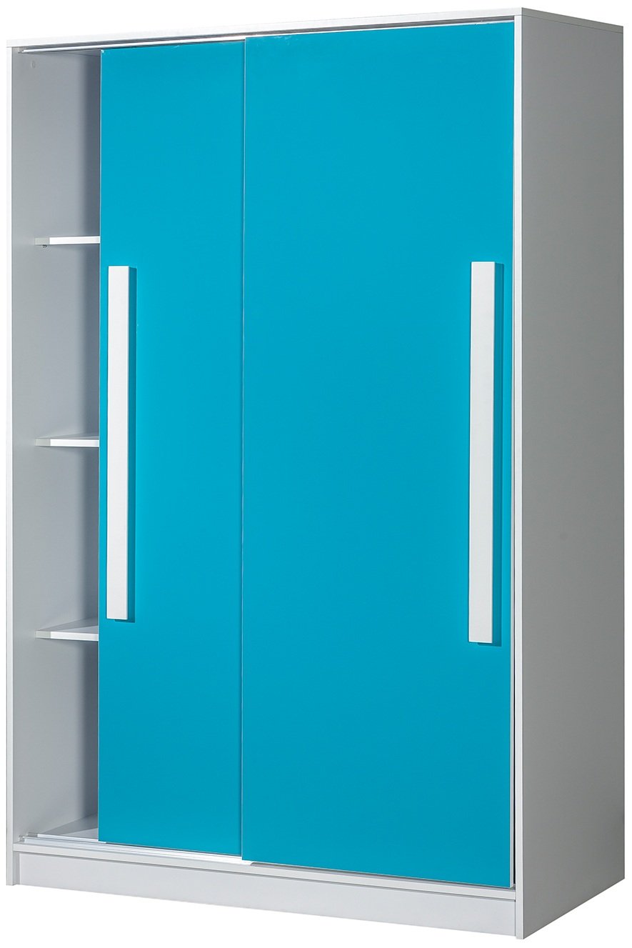 Garderobni ormar s kliznim vratima Guliver 12 – Domel spaja kvalitetne materijale, promišljenu funkcionalnost i suvremeni dizajn. Svojom tirkiznom frontom unosi u prostor svježinu i svjetlost, a klizna vrata omogućuju praktičnu upotrebu i u manjim prostorima. Zbog izdržljive izrade, raznolikosti boja ručkica i provjerene kvalitete izrade, ovo je komad namještaja koji spaja estetiku i uporabnost u savršenu cjelinu.