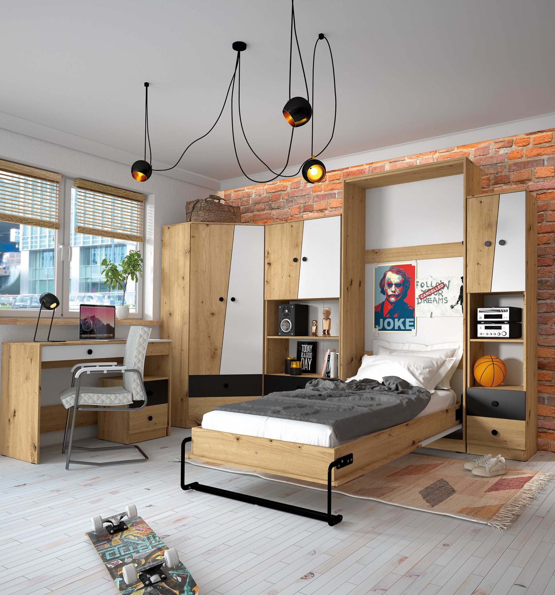 Dječja soba Nero dizajnirana je tako da omogućuje optimalno iskorištavanje prostora. Pojedini komadi namještaja – od ormara i polica do pisaćeg stola – logično su oblikovani za jednostavan raspored u manjim ili većim sobama. Kombinacija otvorenih i zatvorenih prostora za pohranu omogućuje preglednost i urednost, a istodobno osigurava dovoljno prostora za odjeću, školski pribor i osobne predmete. Zbog jedinstvene linije elemenata soba se može postupno nadopunjavati prema potrebama djeteta, što omogućuje dugotrajnu uporabnost namještaja i tijekom razdoblja odrastanja.