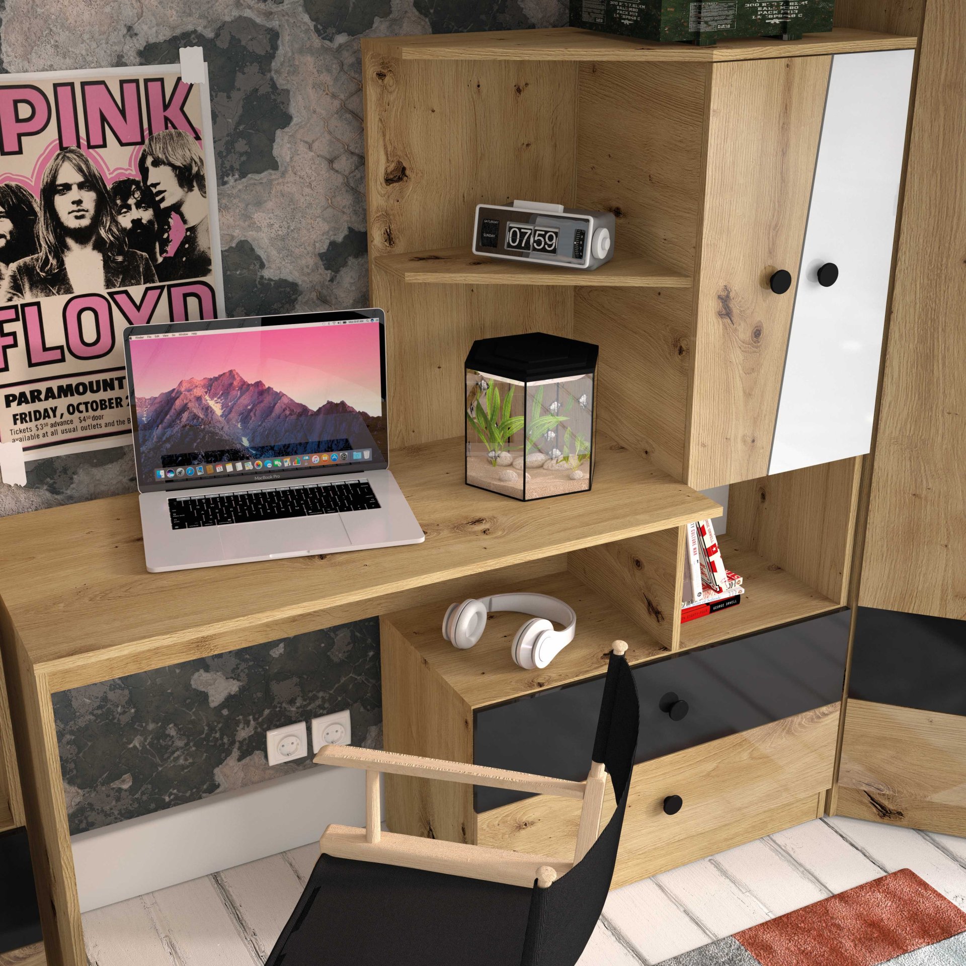 Osnova korpusa u potpunosti je izvedena u boji artisan hrast, koja oponaša prirodnu teksturu drva i stvara osjećaj topline. Fronte su dostupne u više varijanti: artisan hrast/bijela mat, artisan hrast/bijela/crna mat te artisan hrast/bijela/siva mat. Takve kombinacije omogućuju da se soba Nero skladno uklopi u različite unutarnje stilove – od skandinavske jednostavnosti do modernog urbanog izgleda. Ručke u tri boje – bijeloj, crnoj ili sivoj – dopunjuju odabranu kolorističku shemu i omogućuju suptilnu personalizaciju elemenata namještaja.