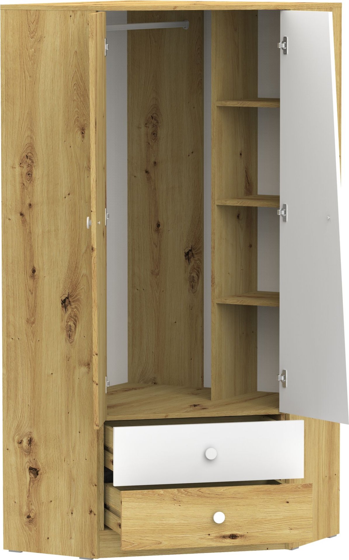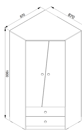 Kutni koncept ormara omogućuje optimalno iskorištavanje prostora. Iako točan raspored može ovisiti o modelu, osnovna je prednost u tome što se unutrašnjost proteže u dva smjera zida, što nudi veću dubinu za vješanje odjeće ili pohranu većih predmeta. Vrata omogućuju dobar pristup unutrašnjosti, što olakšava organizaciju garderobe.