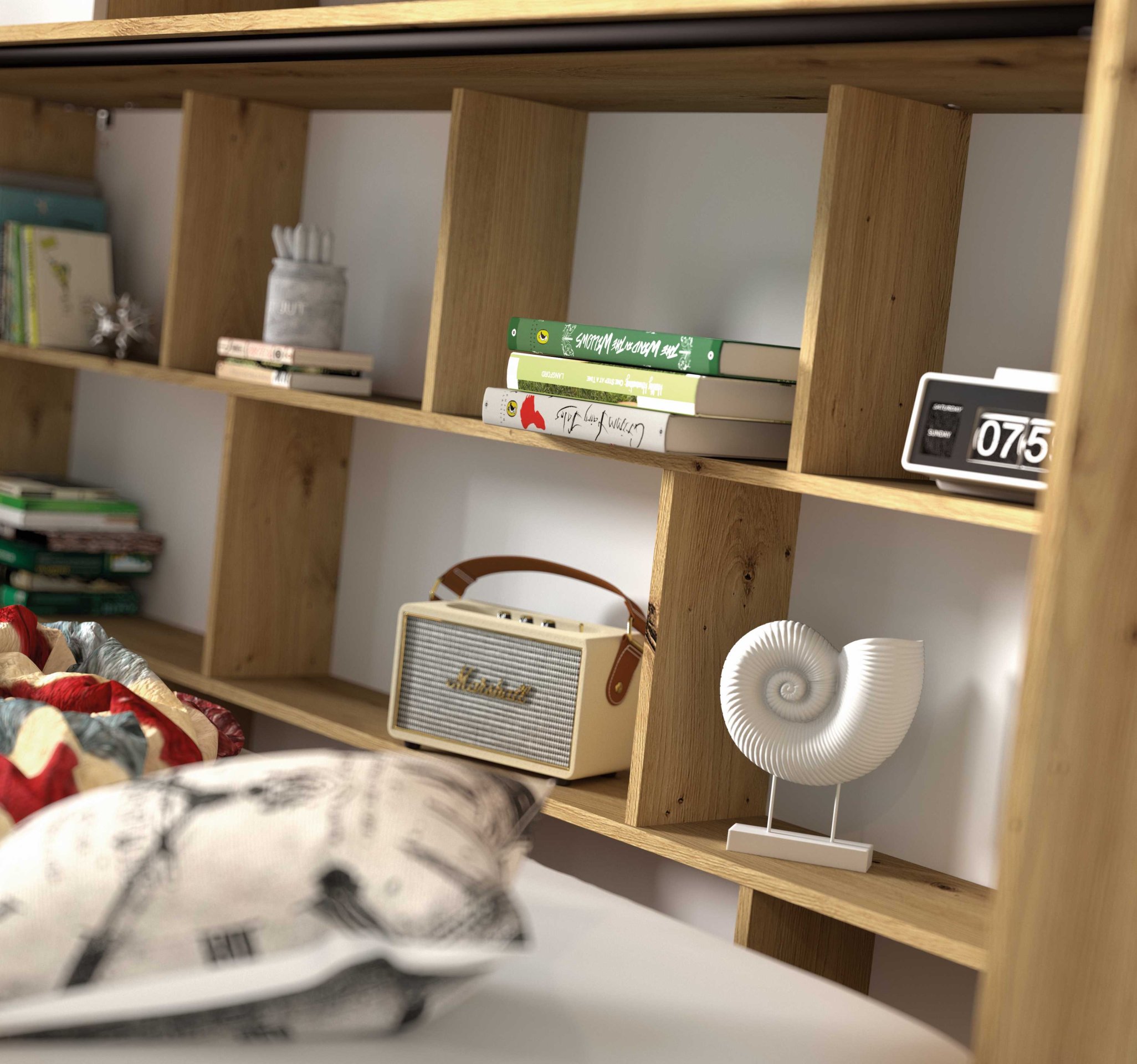Nadogradnja Nero 17 najljepše se uklapa s vodoravnim krevetom iz iste kolekcije, no zbog neutralnih boja lako se kombinira i s drugim elementima u sličnim tonovima drveta ili bijele boje. Prikladna je za sobe za mlade, manje spavaće sobe ili višenamjenske prostore, gdje je važno spojiti funkcionalnost i minimalizam. S dodatnim otvorenim policama ili zatvorenim ormarićima iz serije Nero možete stvoriti modularno rješenje koje se prilagođava vašim potrebama.
