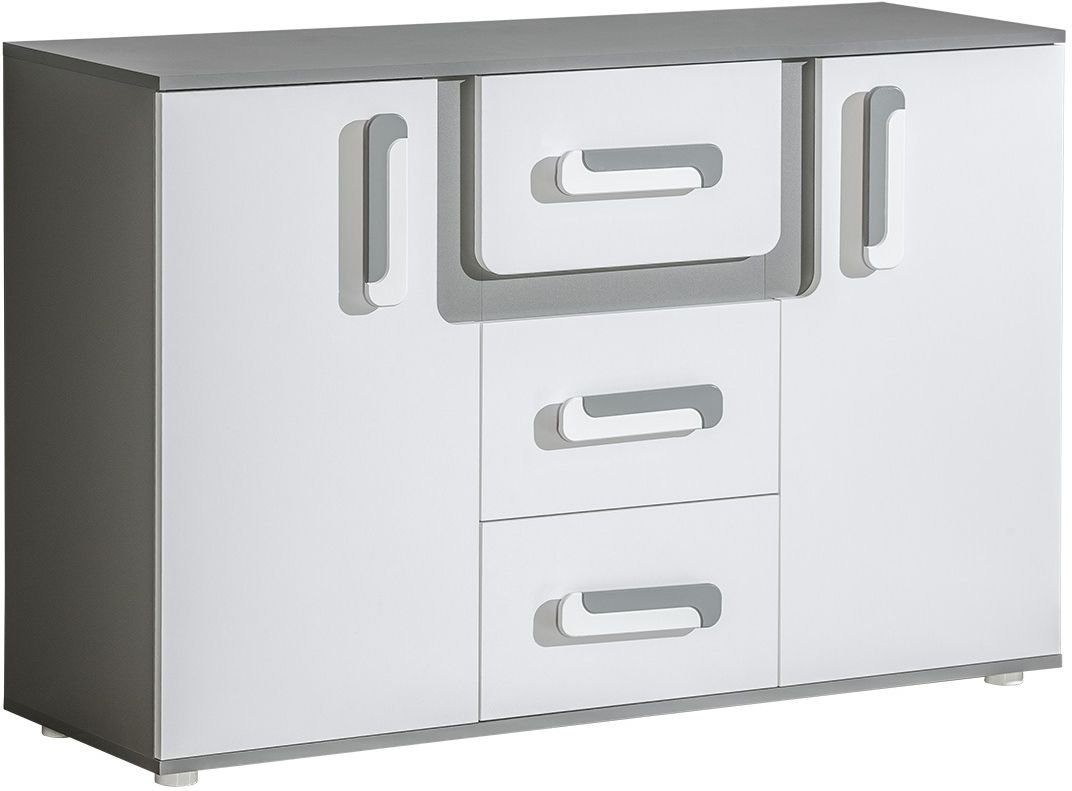Komoda Apetito 07 u elegantnoj kombinaciji boja antracita i bijele predstavlja moderan komad namještaja koji spaja funkcionalnost, estetiku i kvalitetnu izradu. Svojim profinjenim izgledom savršeno se uklapa u dnevne sobe, spavaće sobe ili predsoblja, gdje nudi dovoljno prostora za pohranu i istovremeno održava uredan izgled prostora. Proizvod je dizajniran i izrađen u tvornici Domel u Poljskoj, što jamči preciznost izrade i trajnu stabilnost.