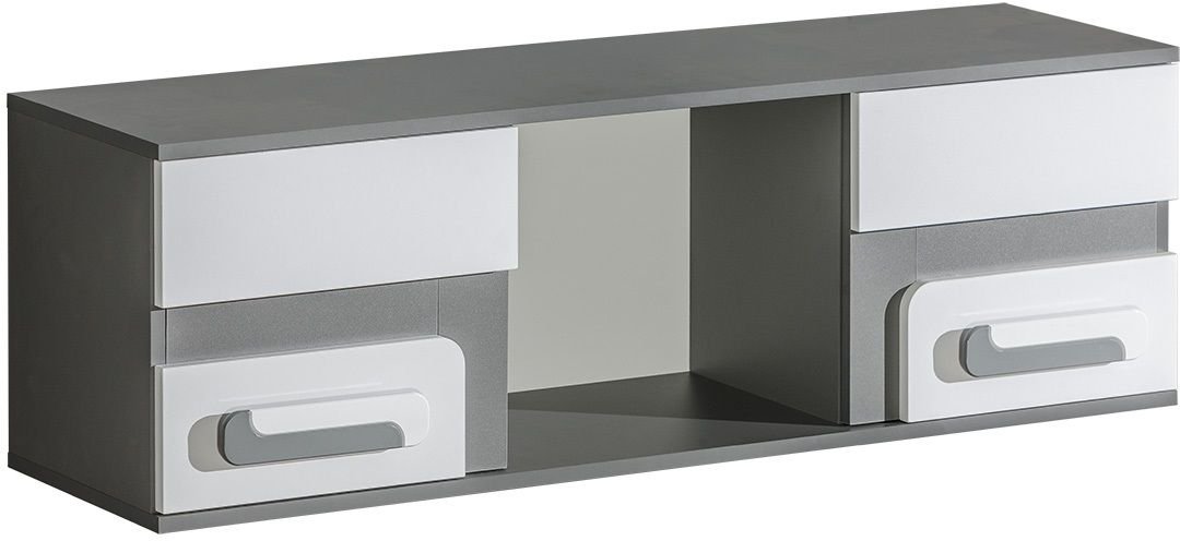 Korpus u boji antracita daje polici elegantan i suvremen izgled, dok je bijela fronta vizualno posvjetljuje i uravnotežuje. Takva kombinacija boja omogućuje jednostavno usklađivanje s različitim komadima namještaja i shemama boja u prostoru. Ručke su izrađene u dvije nijanse – bijeloj i antracitnoj – što dodaje suptilan, ali izražajan dekorativni naglasak.