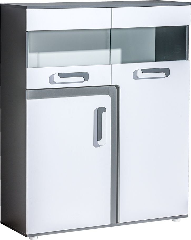 Kombinacija antracitnog korpusa i bijelih fronti stvara moderan, a istovremeno bezvremenski izgled. Takav dizajn lijepo se uklapa u minimalističke, skandinavske ili industrijske interijere. Zbog neutralnih tonova vitrina se lako uklapa i u dnevni boravak, blagovaonicu ili hodnik. Bijela boja fronti optički povećava prostor, dok antracit pruža kontrast i osjećaj stabilnosti.