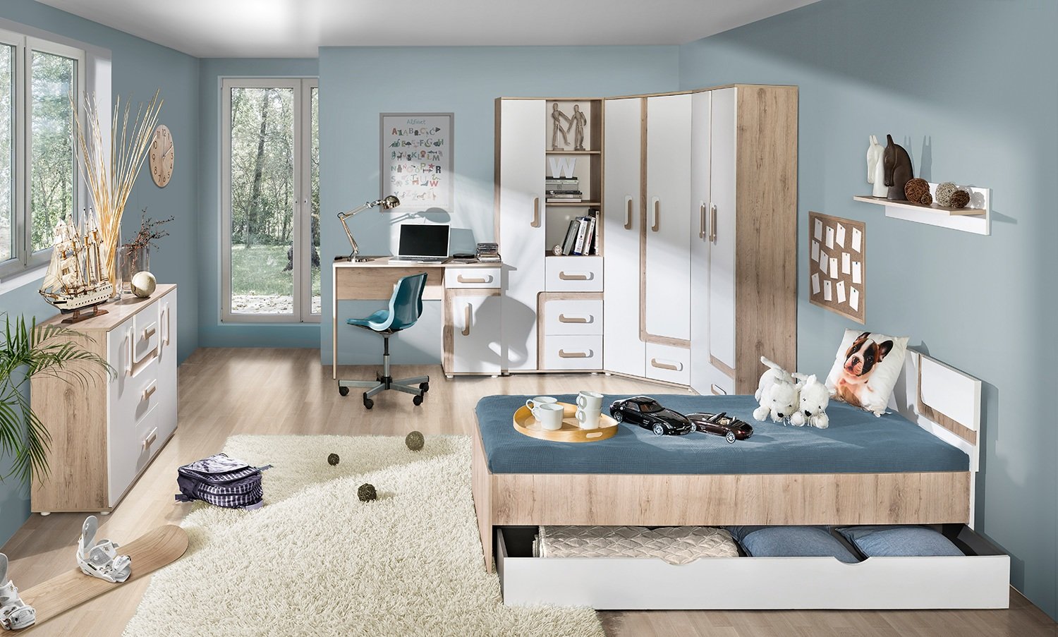 Dječja soba Apetito Domel osmišljena je za roditelje koji traže kvalitetan, funkcionalan i estetski dovršen namještaj za dječju sobu. Kombinacija svijetlog hrasta i bijele boje stvara svjež, ugodan i moderan izgled koji se lijepo uklapa s različitim interijerima. Izrađena je od 16 mm debele iveralne laminirane ploče, što osigurava stabilnost, dug vijek trajanja te jednostavno čišćenje površina. Precizna izrada u tvornici Domel u Poljskoj potvrđuje pouzdanu kvalitetu i točnost detalja koji su karakteristični za europsku proizvodnju.