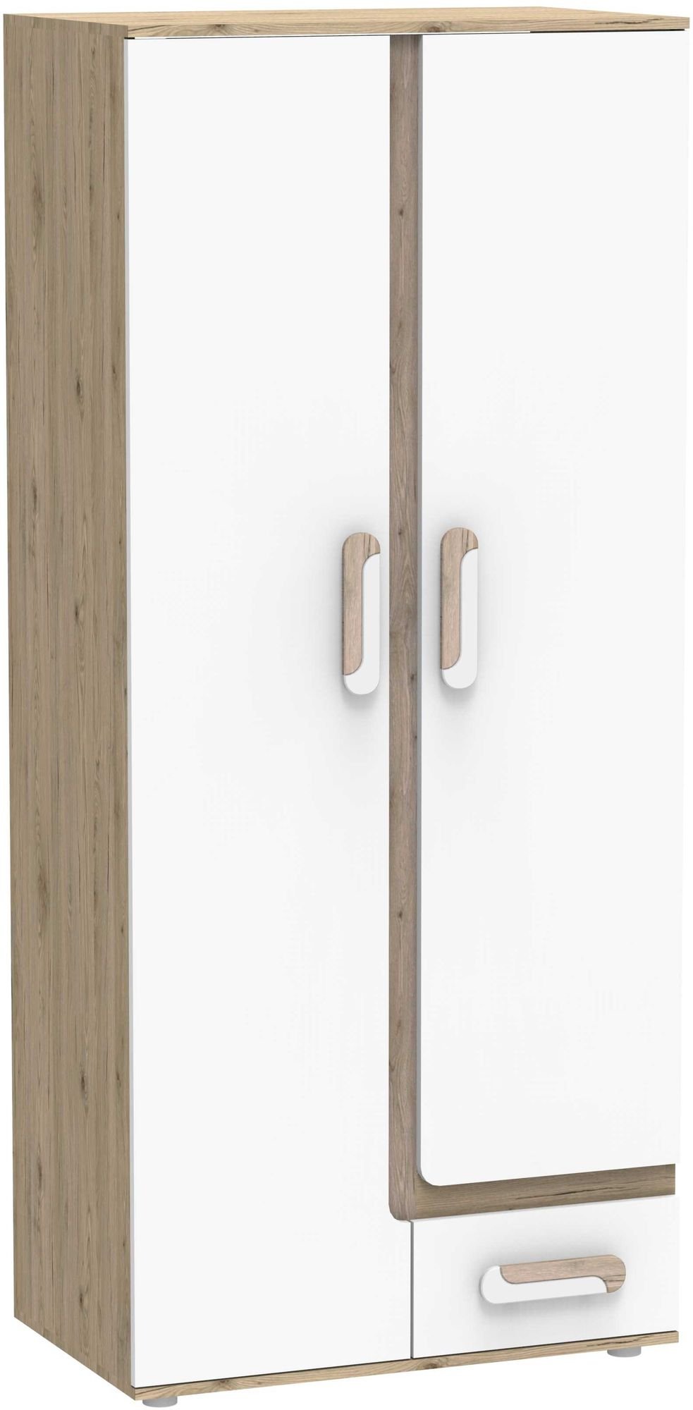 Garderobni ormar Apetito 01 robne marke Domel funkcionalan je i estetski dovršen komad namještaja koji se zbog svijetle kombinacije boja i jednostavnih linija izvrsno prilagođava suvremenim stambenim prostorima. Izrađen je od kvalitetnih laminiranih iverica debljine 16 mm, što osigurava stabilnost i dug vijek trajanja. Naglašen je bijelom frontom i korpusom u nijansi svijetlog hrasta, što stvara ugodan kontrast i osjećaj topline. Vanjska elegancija lijepo se uklapa s praktičnim unutarnjim rasporedom koji omogućuje učinkovito pohranjivanje odjeće i drugih predmeta.
