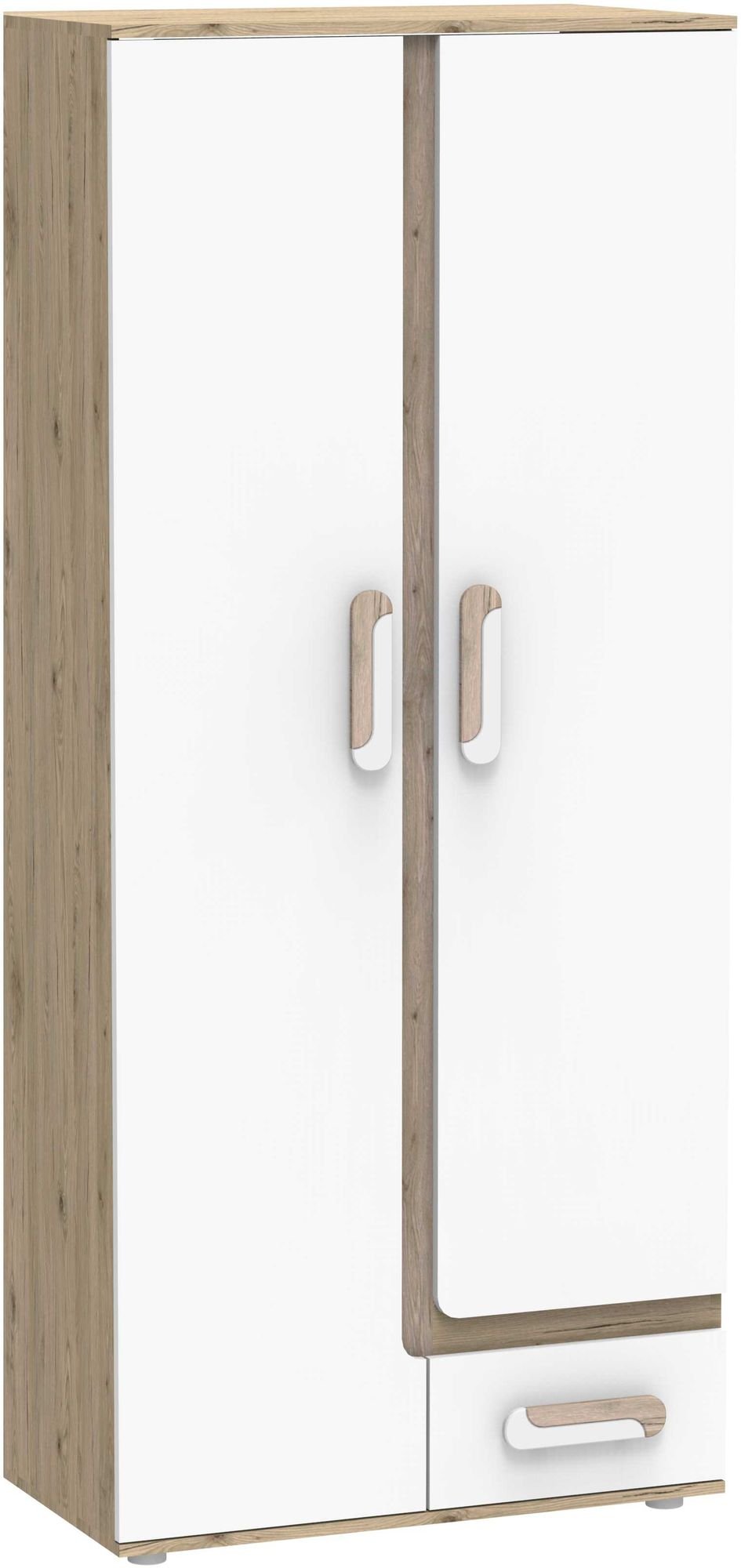 Korpus ormara je u nijansi svijetlog hrasta, što prostoru daje osjećaj topline i prirodnosti. Fronte u bijeloj boji stvaraju vizualni kontrast koji prostor optički povećava i daje mu svježinu. Ručke u kombinaciji bijele i svijetlog hrasta upotpunjuju cjelinu te se slažu s bojama korpusa i fronti. Zbog ovih tonova boja ormar je prikladan kako za dnevne sobe, tako i za spavaće sobe, predsoblja ili sobe za mlade.