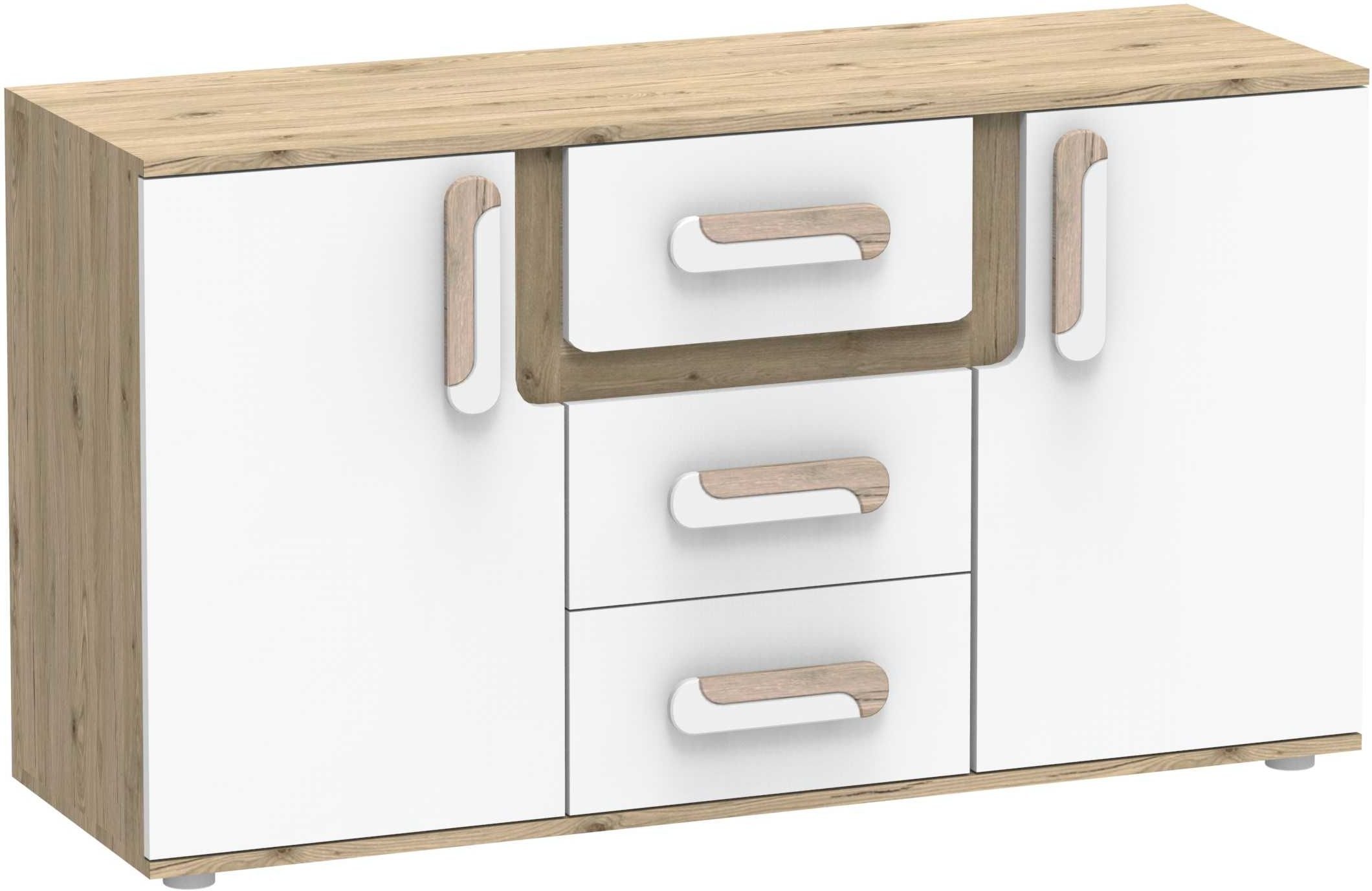 Komoda Apetito 07 Domel odličan je izbor za sve koji cijene kvalitetnu izradu, bezvremensku estetiku i funkcionalnost. Bez obzira na to hoćete li je postaviti u dnevni boravak, spavaću sobu ili predsoblje, ovaj komad namještaja osigurat će uredan izgled i ugodnu atmosferu. Kombinacijom svijetlog hrasta i bijele boje prostor će djelovati svjetlije, otvorenije i harmoničnije.