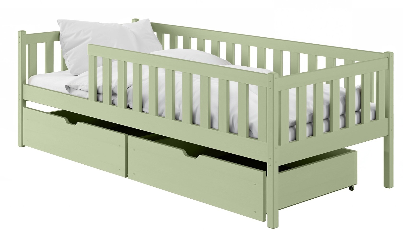 Krevet uključuje i ladicu za posteljinu, koja se praktično izvlači i omogućuje pohranu deka, jastuka ili igračaka. Tako prostor ostaje uredan, što je u dječjim sobama posebno važno.