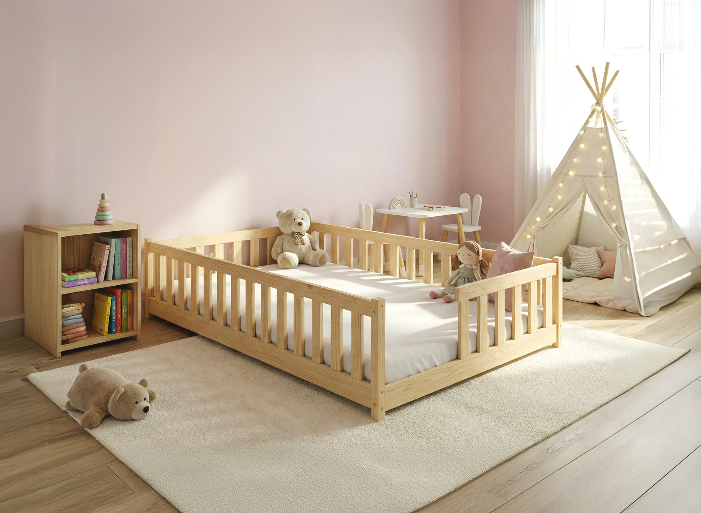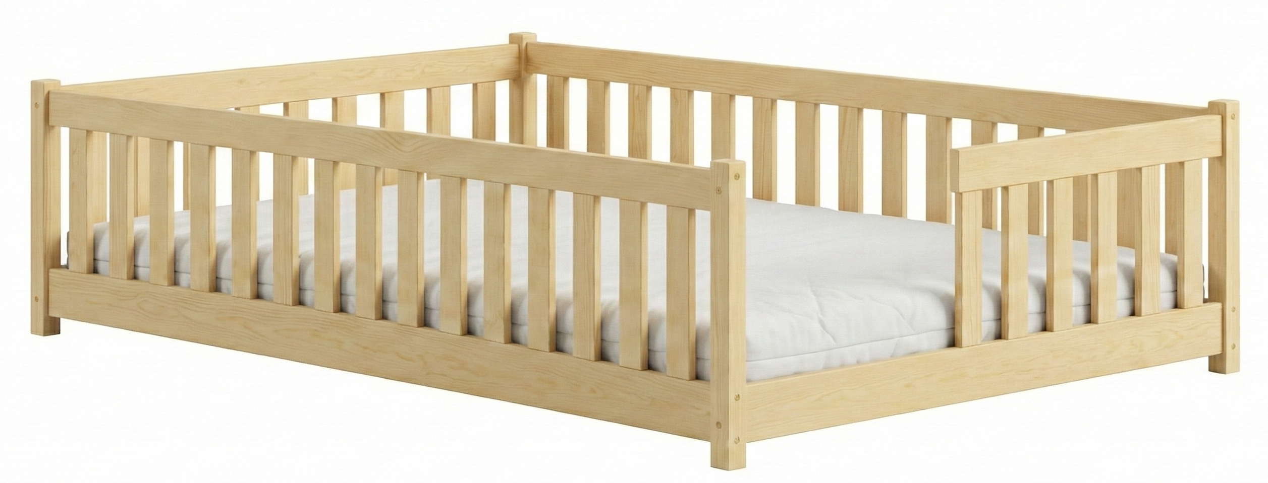 Njegove kompaktne dimenzije omogućuju postavljanje i u manje sobe, gdje je svaki centimetar važan. Zbog visine od 45 cm ležište je lako dostupno i mlađoj djeci, što potiče samostalnost u svakodnevnoj upotrebi. Prirodno borovo drvo stvara ugodnu, toplu atmosferu koja djetetu pruža osjećaj sigurnosti i domaće udobnosti.