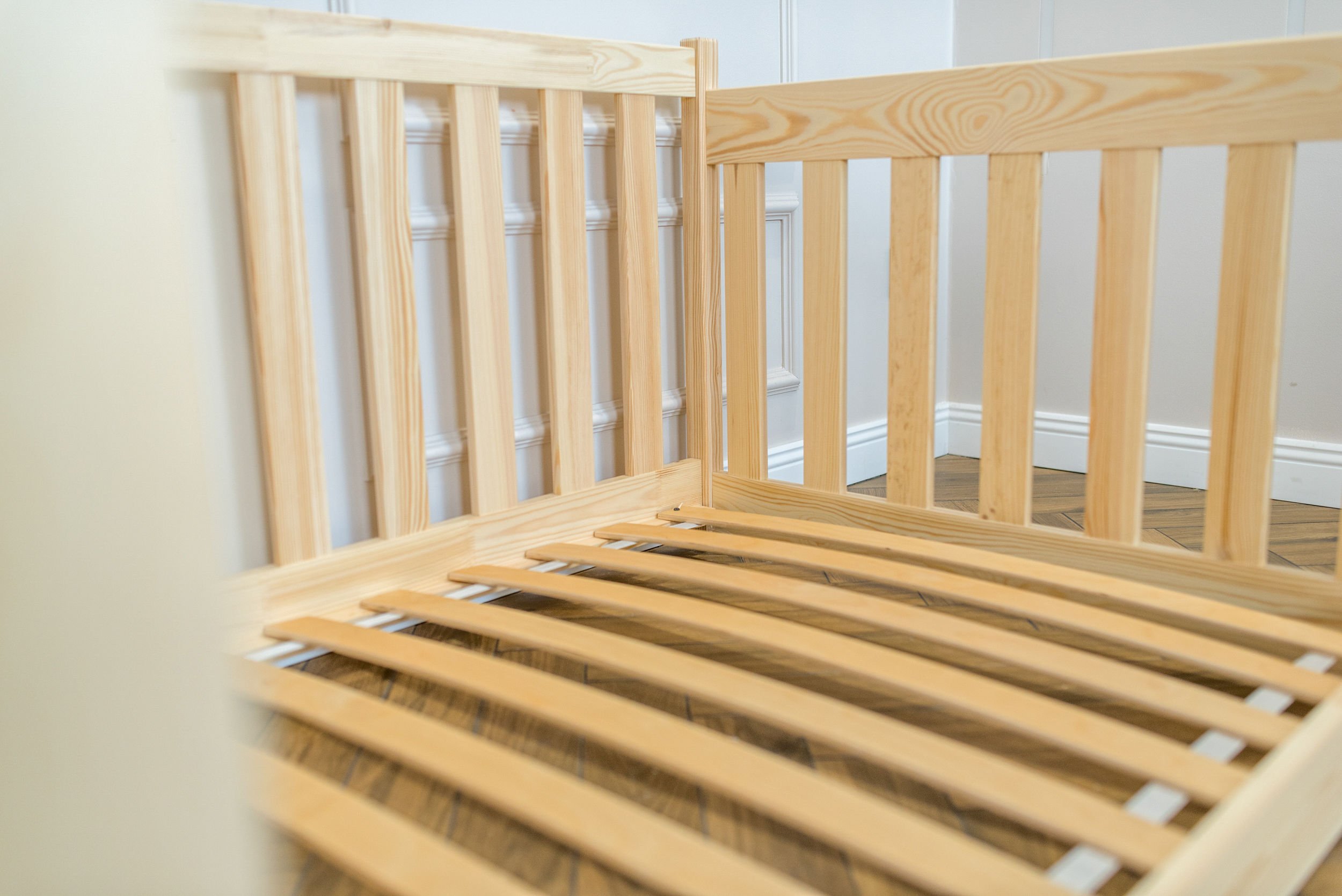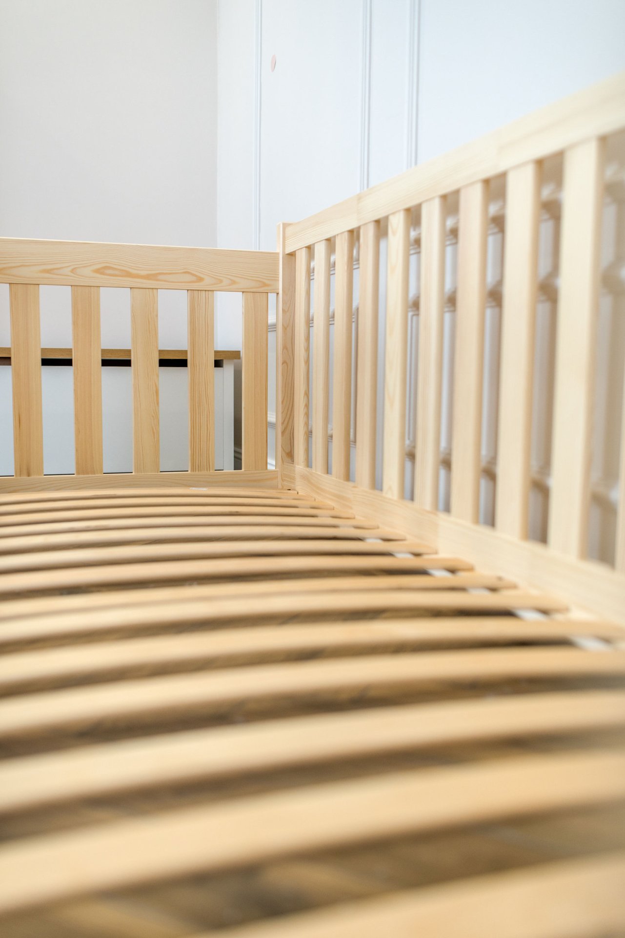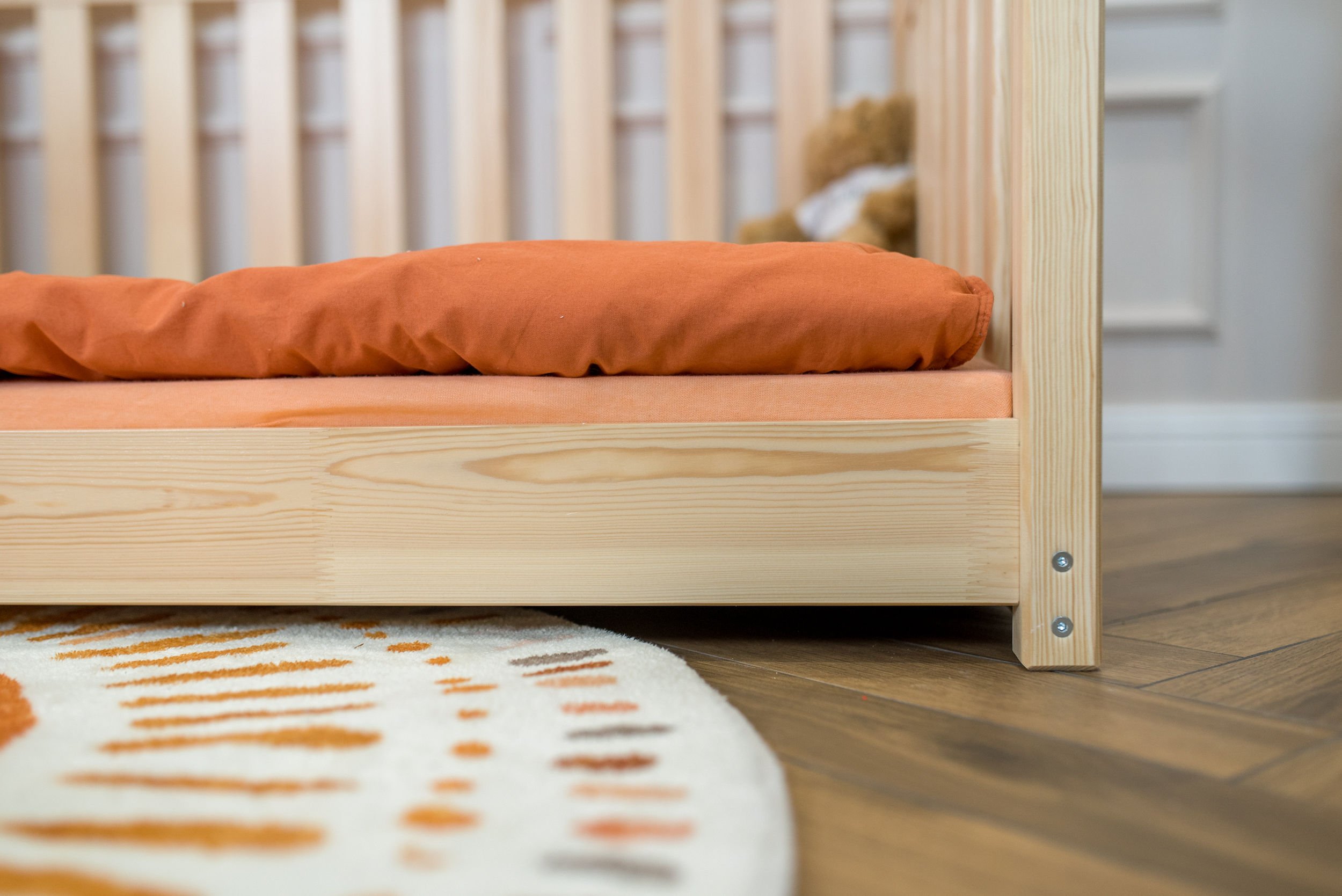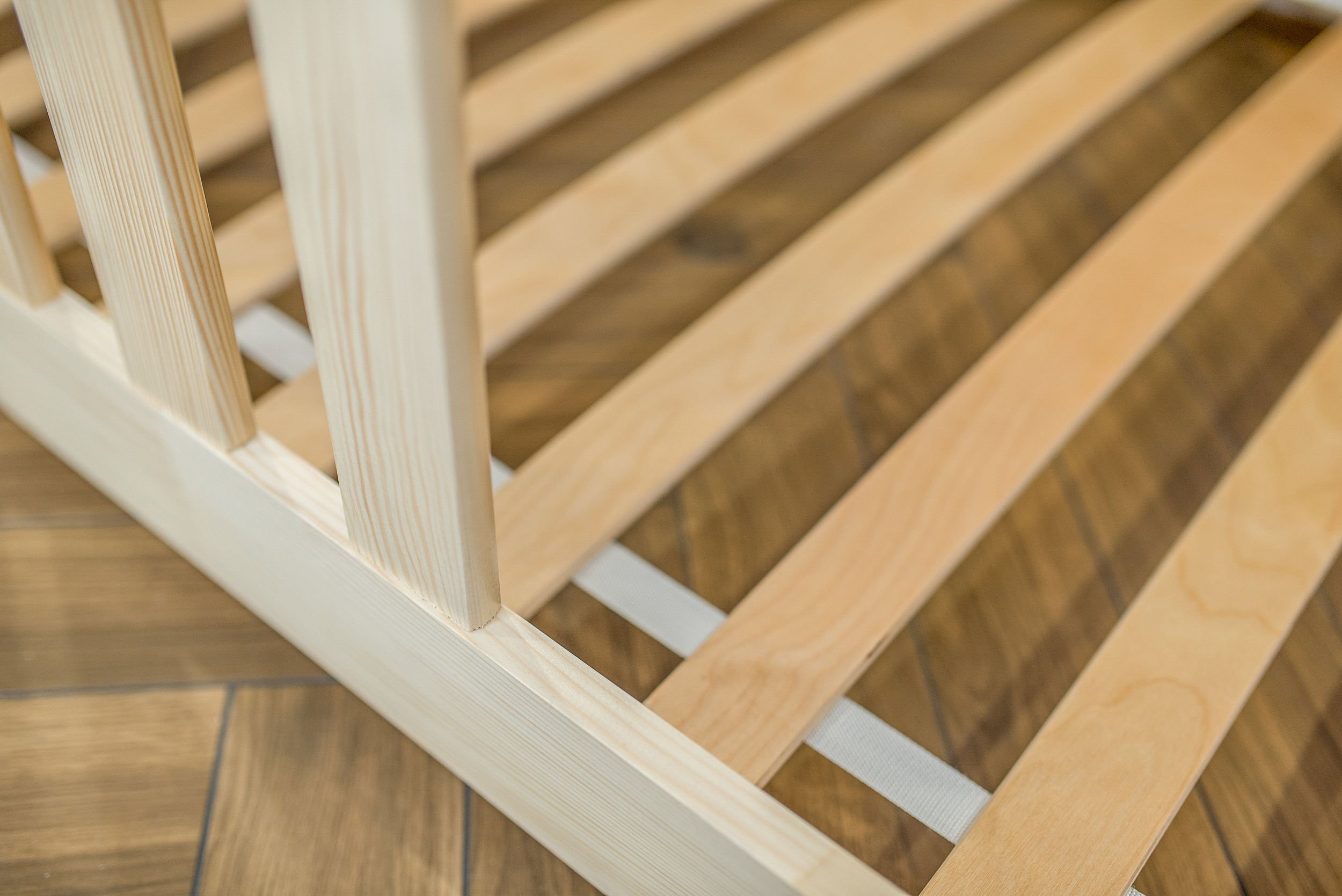 Masivni okvir od borovog drva osigurava iznimnu stabilnost i čvrstoću konstrukcije. Drvo je prirodno izdržljivo, a istovremeno dovoljno lagano da omogućuje jednostavno premještanje kreveta po prostoru. Površinska obrada vodenom bojom ne sadrži štetne tvari i omogućuje da drvo zadrži svoju prirodnu strukturu i toplinu. Svaki element je precizno obrađen, što osigurava glatke rubove i ugodan dodir.