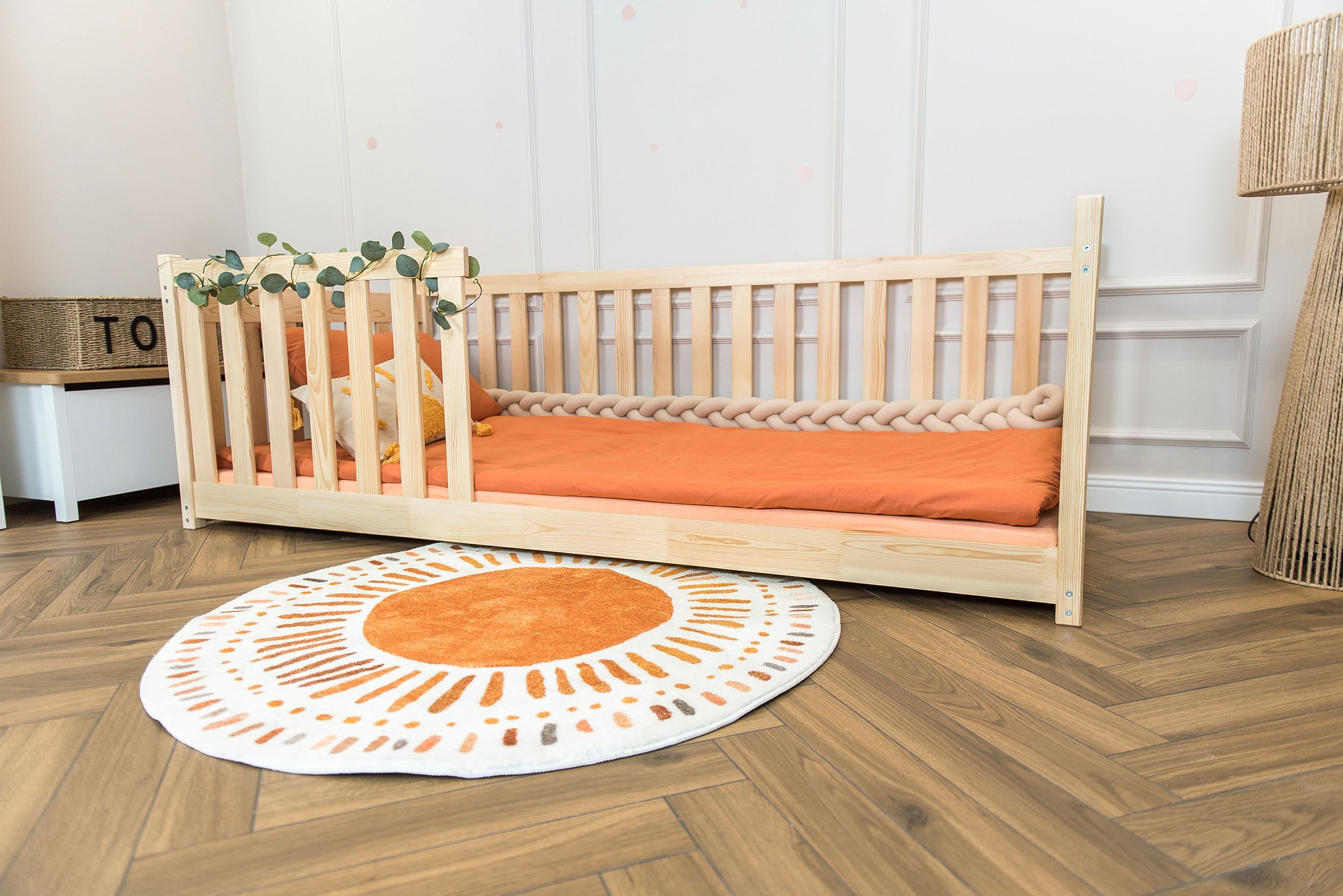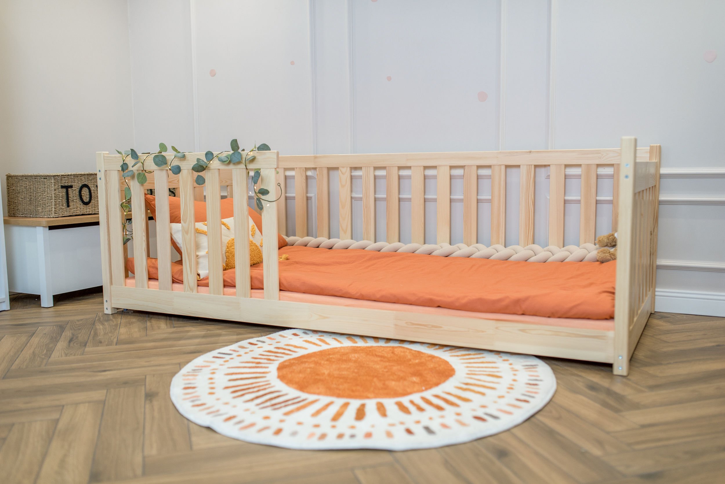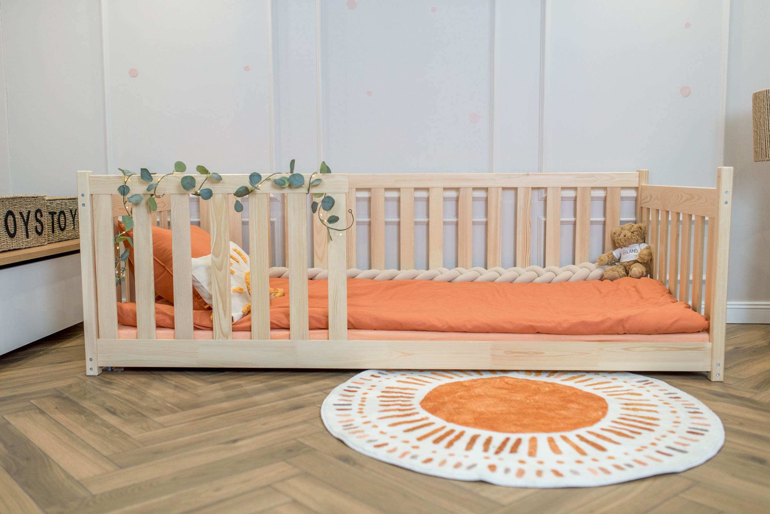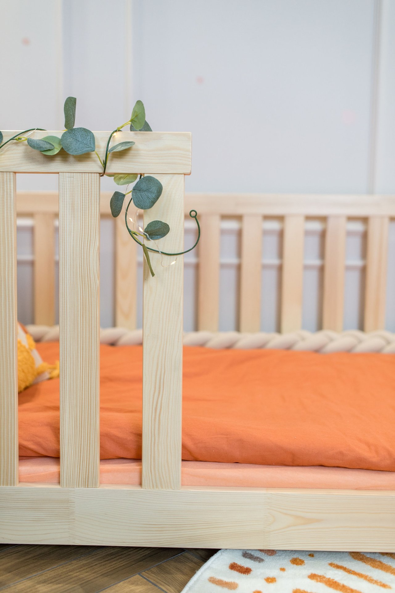 Masivni okvir od borovog drva osigurava iznimnu stabilnost i čvrstoću konstrukcije. Drvo je prirodno izdržljivo, a istovremeno dovoljno lagano da omogućuje jednostavno premještanje kreveta po prostoru. Površinska obrada vodenom bojom ne sadrži štetne tvari i omogućuje da drvo zadrži svoju prirodnu strukturu i toplinu. Svaki element je precizno obrađen, što osigurava glatke rubove i ugodan dodir.