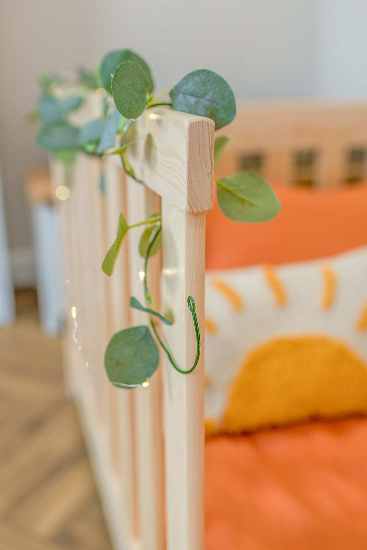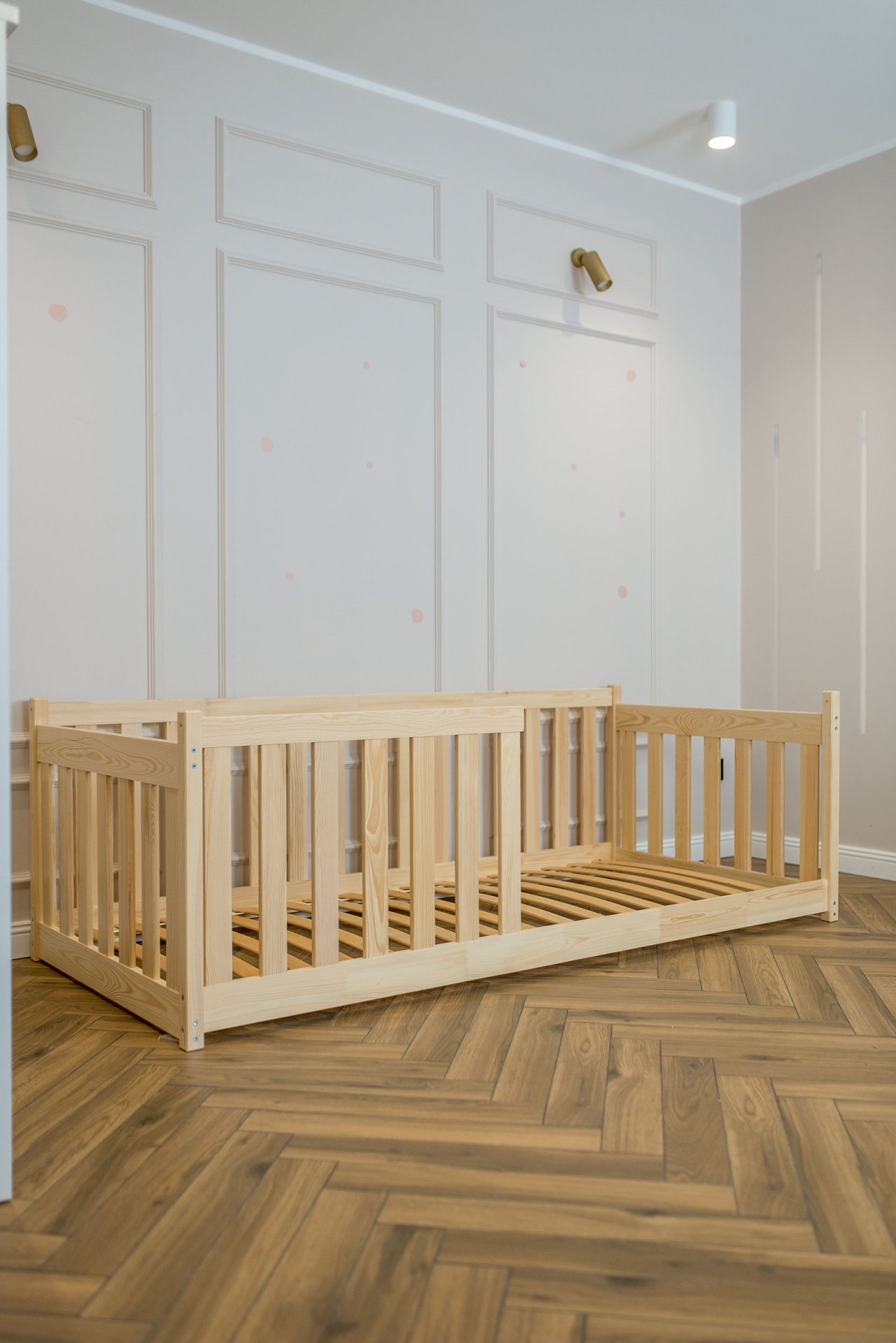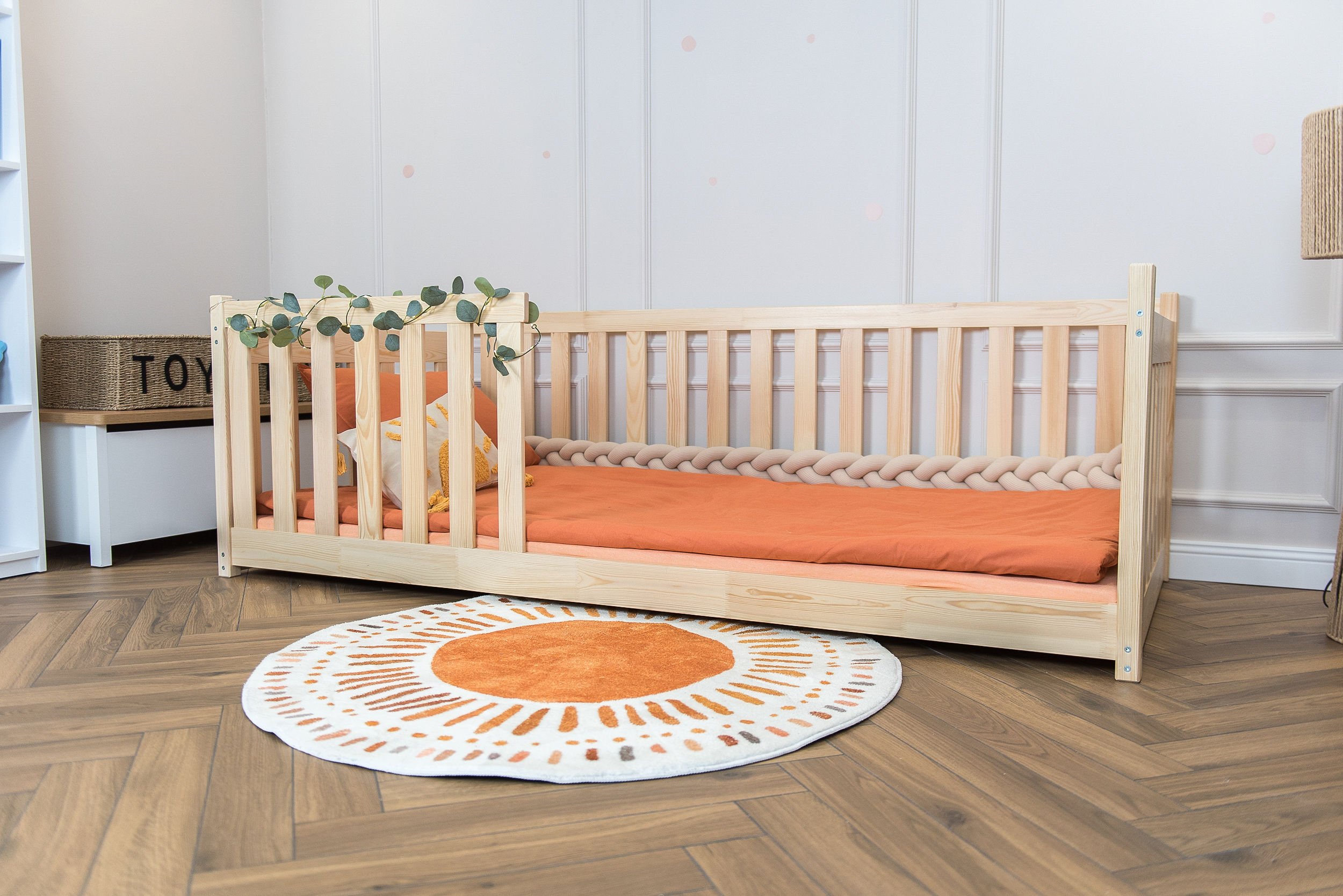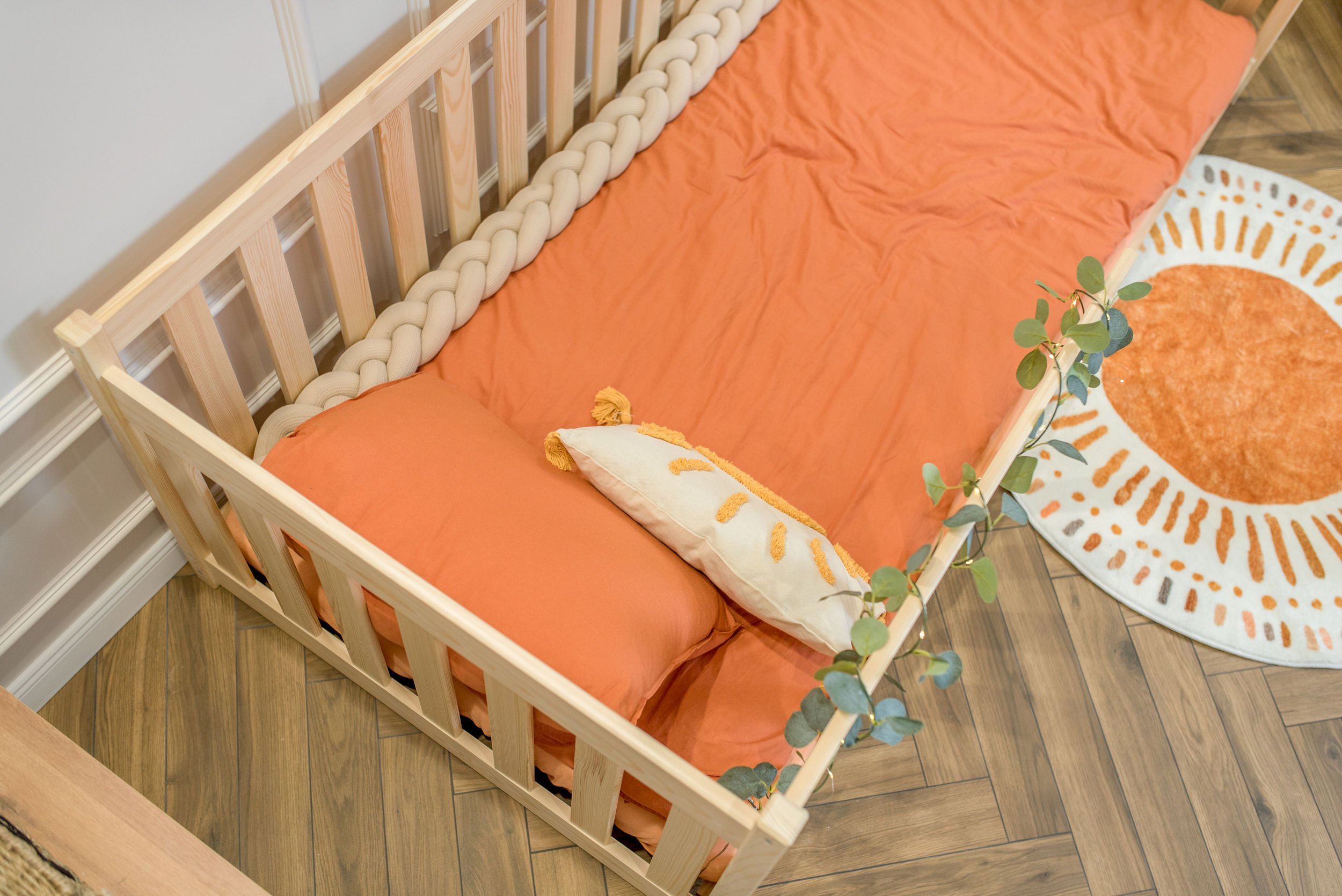 Masivni okvir od borovog drva osigurava iznimnu stabilnost i čvrstoću konstrukcije. Drvo je prirodno izdržljivo, a istovremeno dovoljno lagano da omogućuje jednostavno premještanje kreveta po prostoru. Površinska obrada vodenom bojom ne sadrži štetne tvari i omogućuje da drvo zadrži svoju prirodnu strukturu i toplinu. Svaki element je precizno obrađen, što osigurava glatke rubove i ugodan dodir.