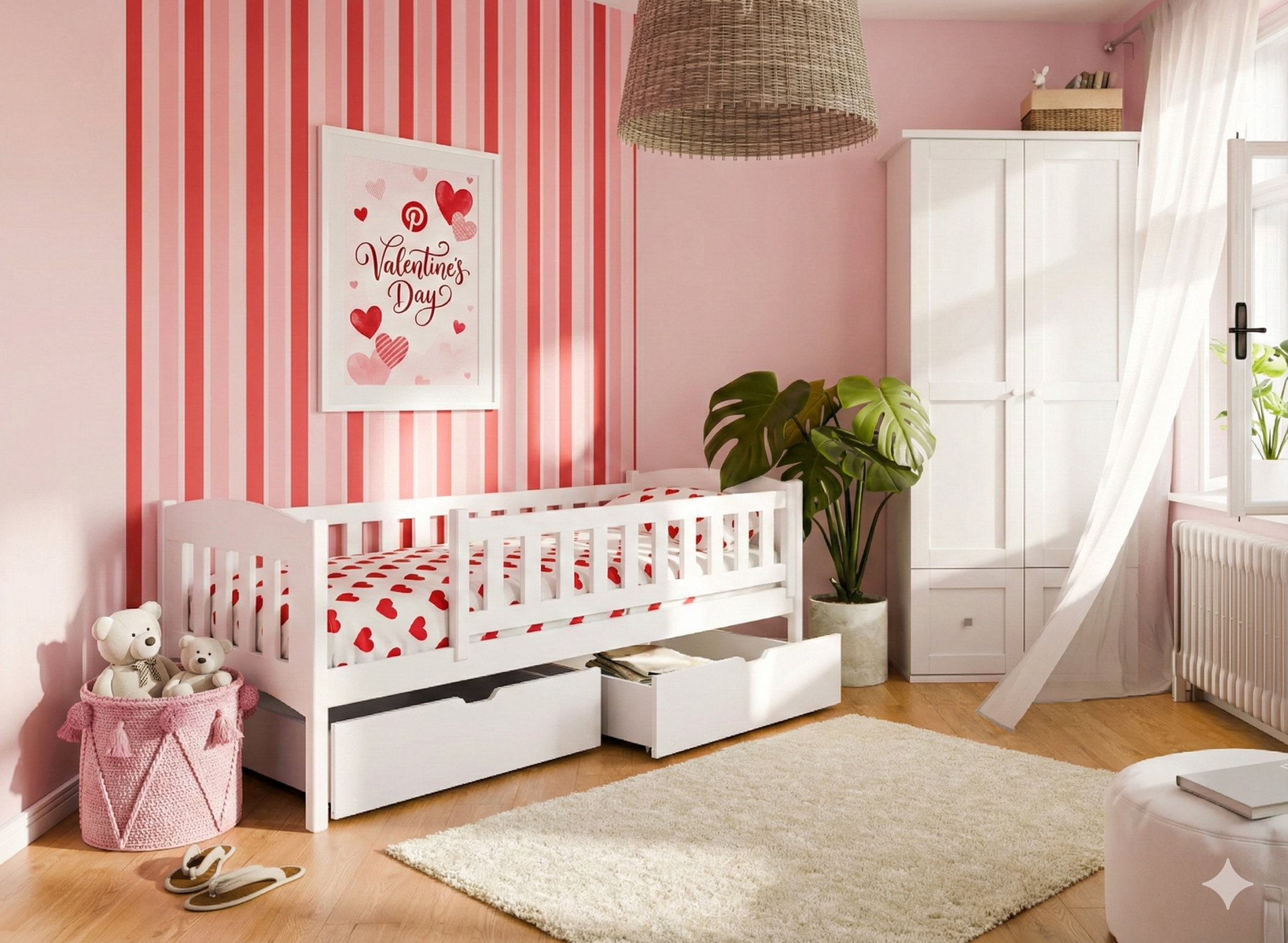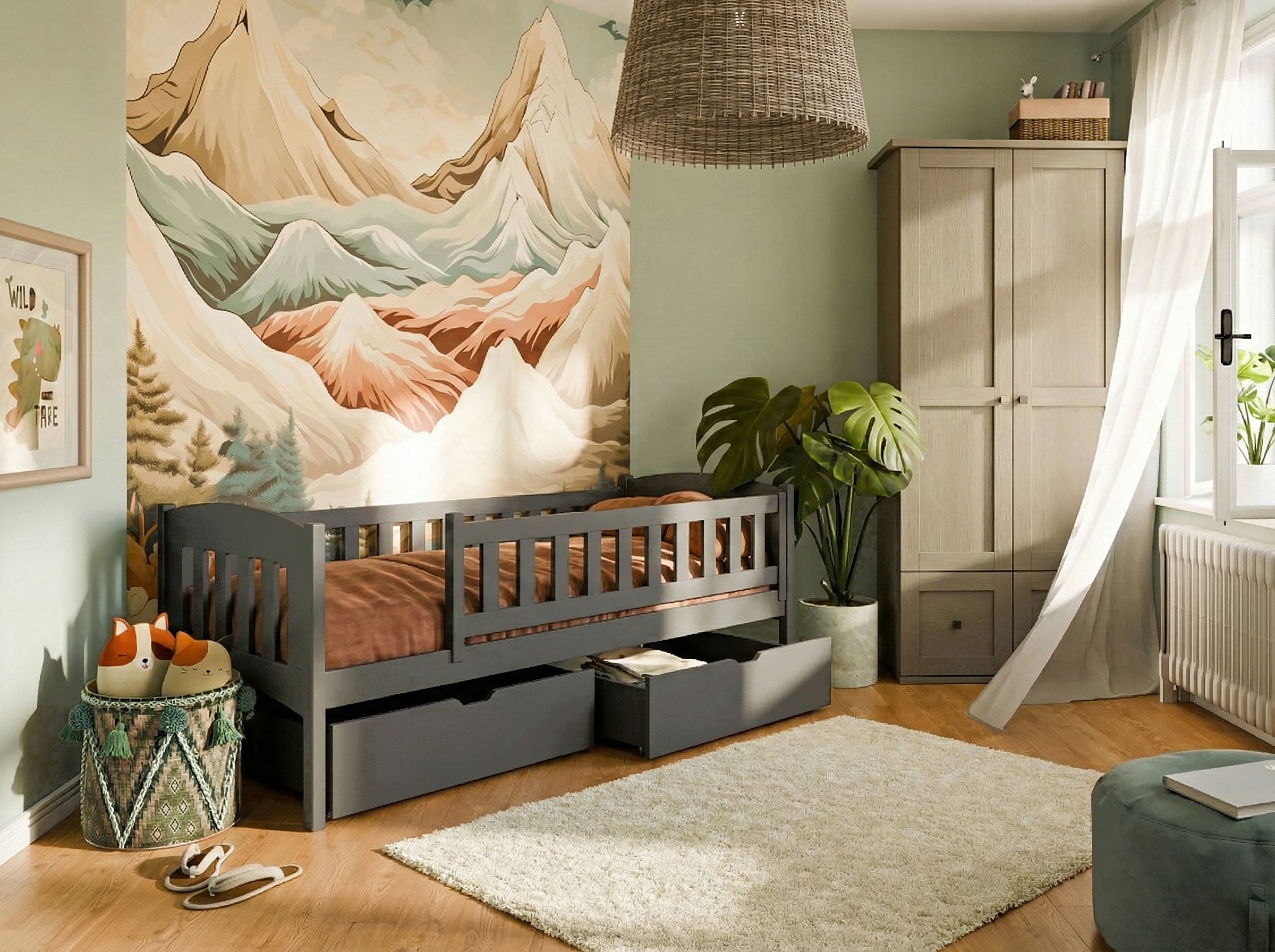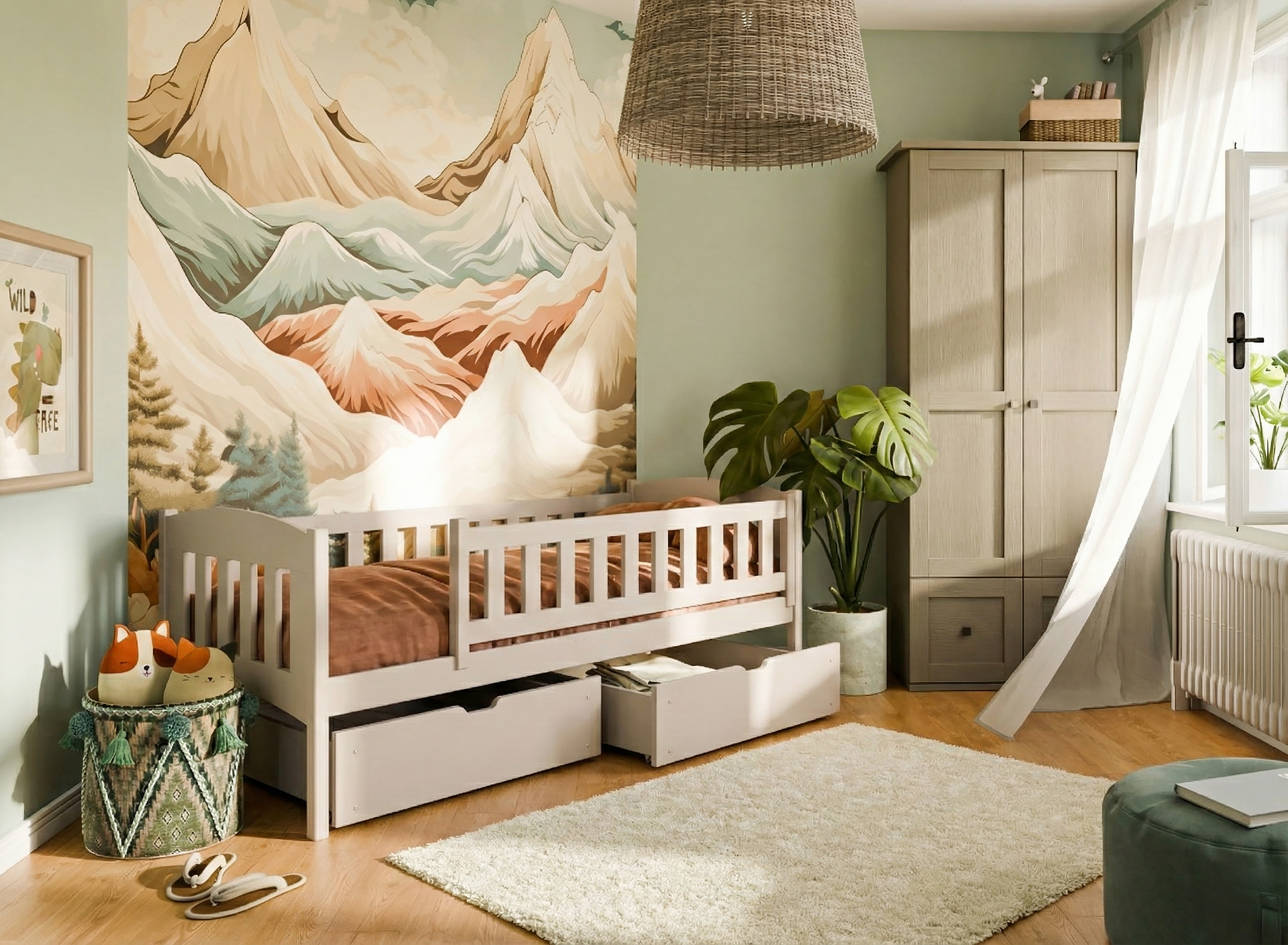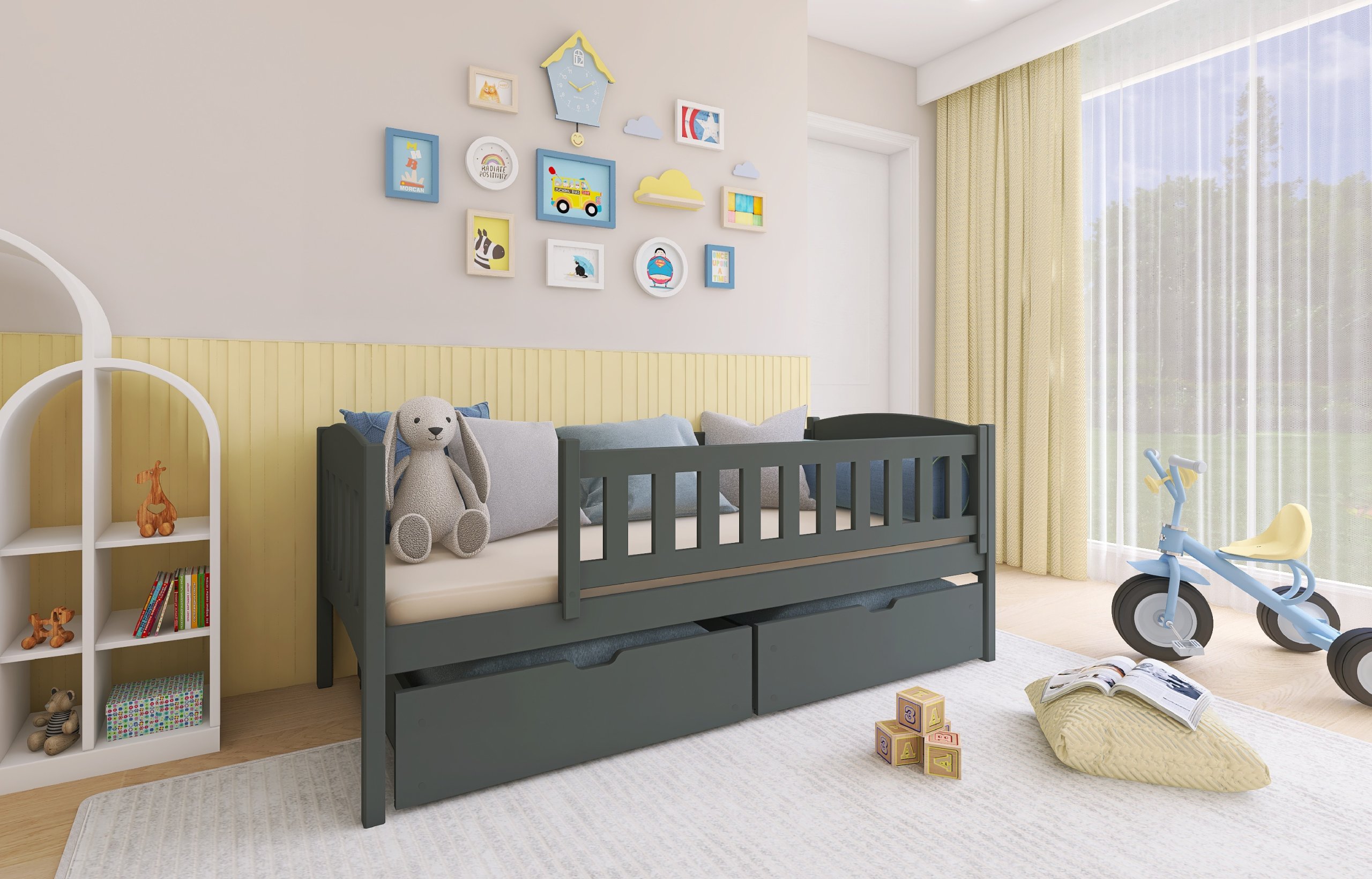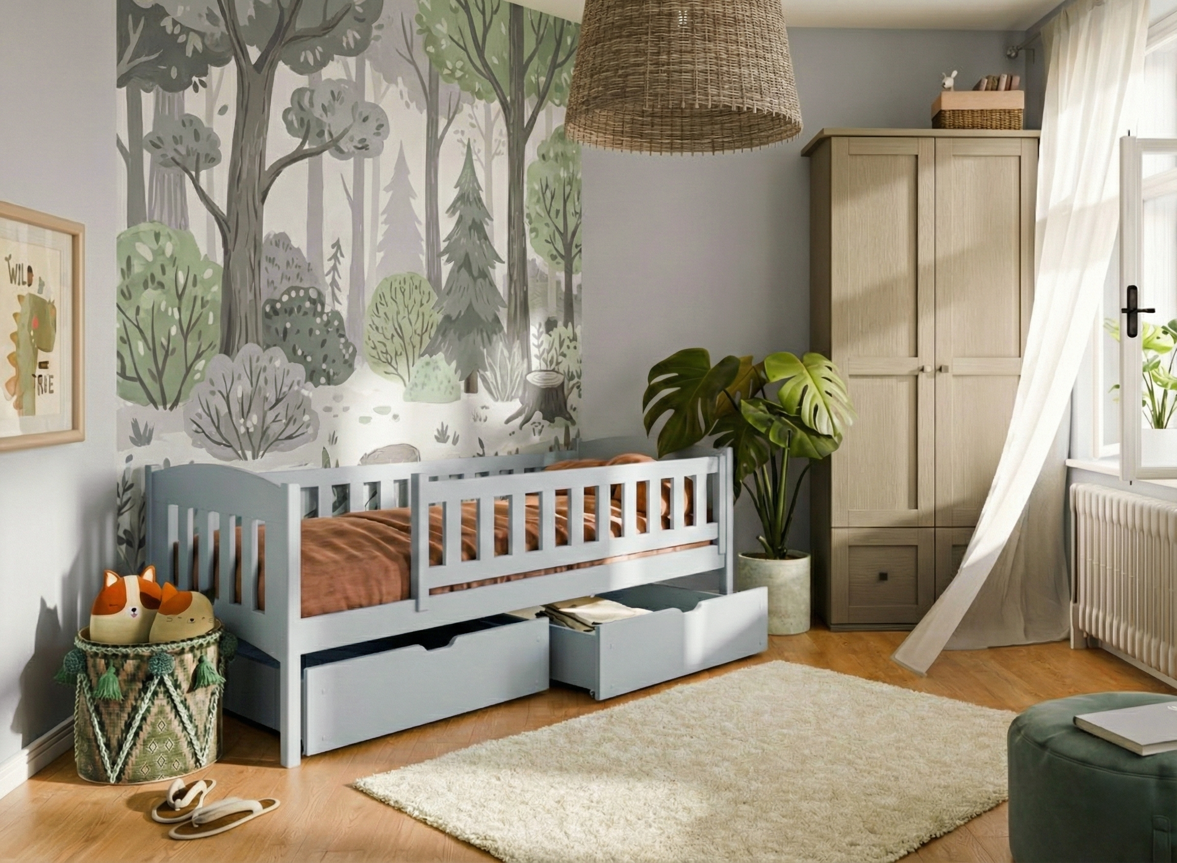 Kompaktna širina omogućuje postavljanje i u manje sobe, dok zadržava dovoljno prostora za udobno spavanje i igru. U priloženoj ladici ispod kreveta možete pohraniti posteljinu, igračke ili druge dodatke, što pomaže održati red i urednost prostora.