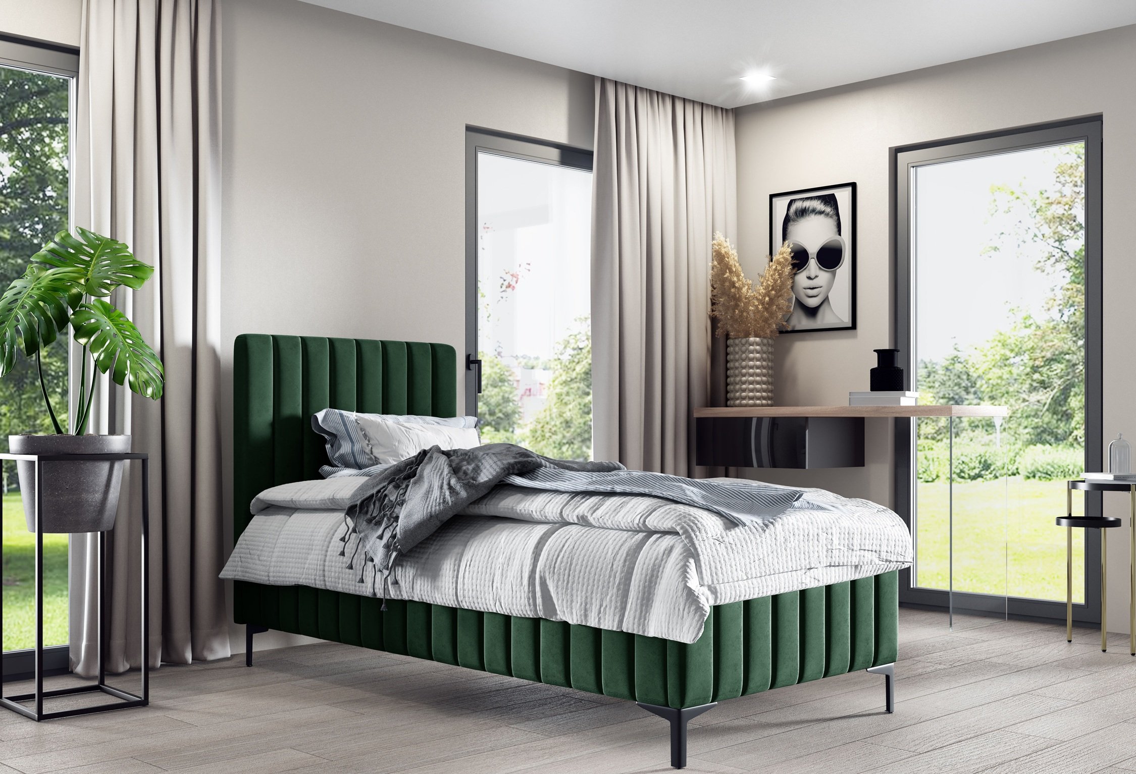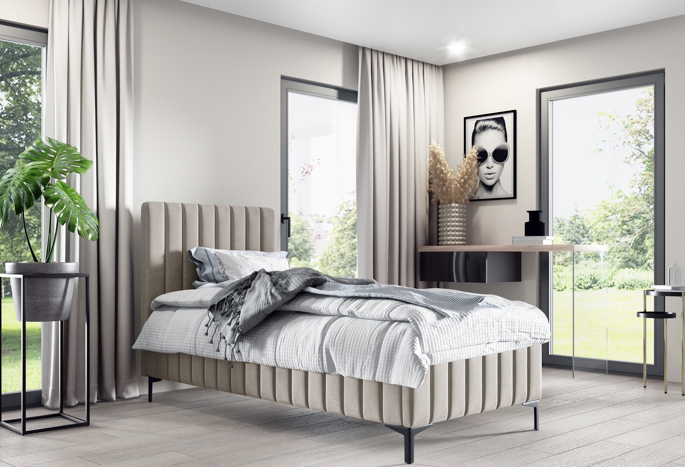Krevet je opremljen ukrasnim metalnim nogicama u crnoj boji, koje dodaju dašak elegancije i osiguravaju stabilnost konstrukcije. Zbog promišljenog dizajna čišćenje ispod kreveta je jednostavno, jer nogice omogućuju pristup i robotskom usisavaču.