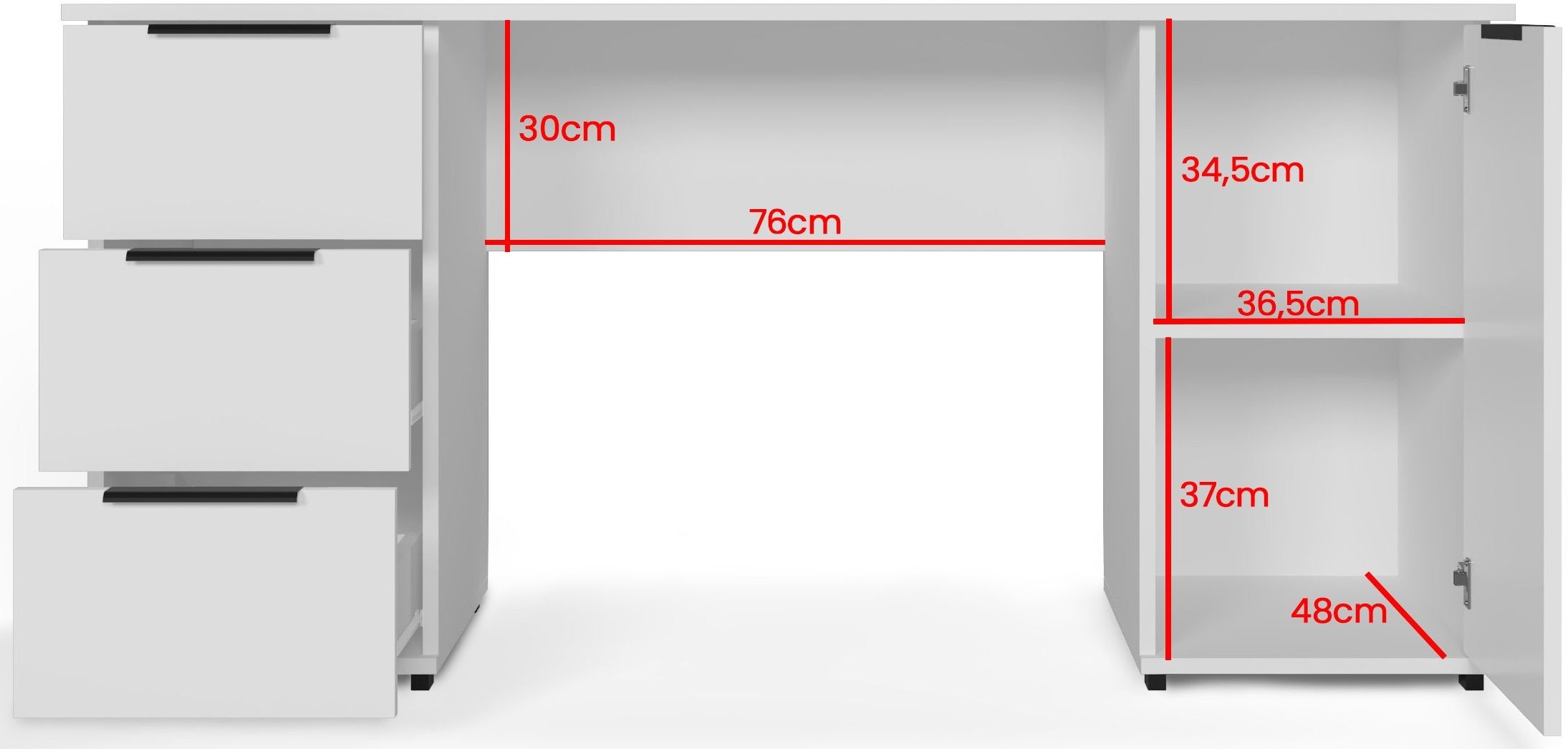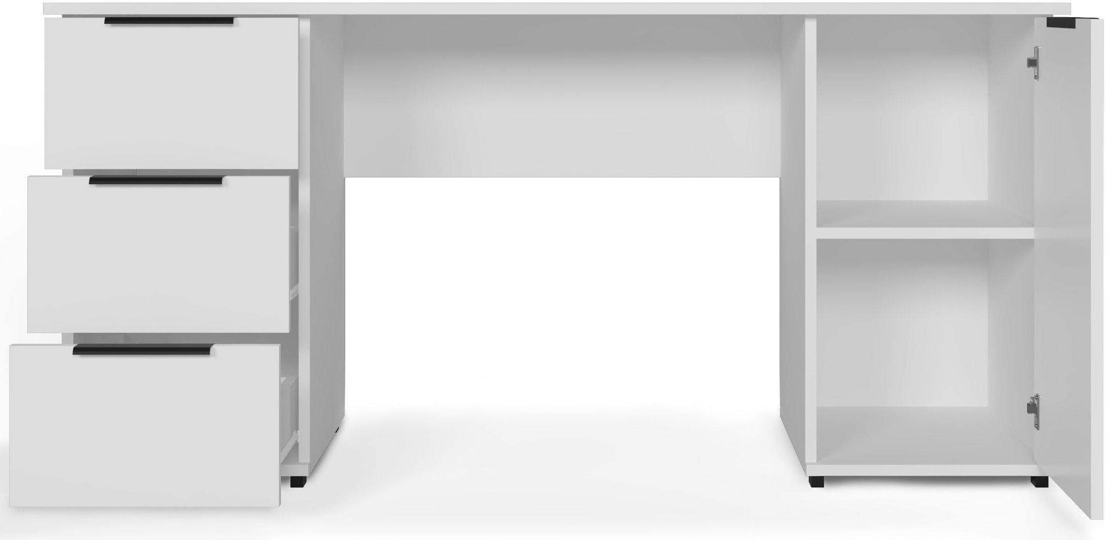 Stol je opremljen s tri prostrane ladice koje se otvaraju na pouzdanim kotačnim vodilicama. Ladice omogućuju pohranu uredskog materijala, dokumenata ili osobnih predmeta, što pomaže održavanju urednog i preglednog radnog prostora. Osim ladica, stol ima i dvije zatvorene police koje nude dodatnu mogućnost pohrane većih predmeta – poput knjiga, mapa ili tehničke opreme – te ih istodobno diskretno skrivaju od pogleda.
