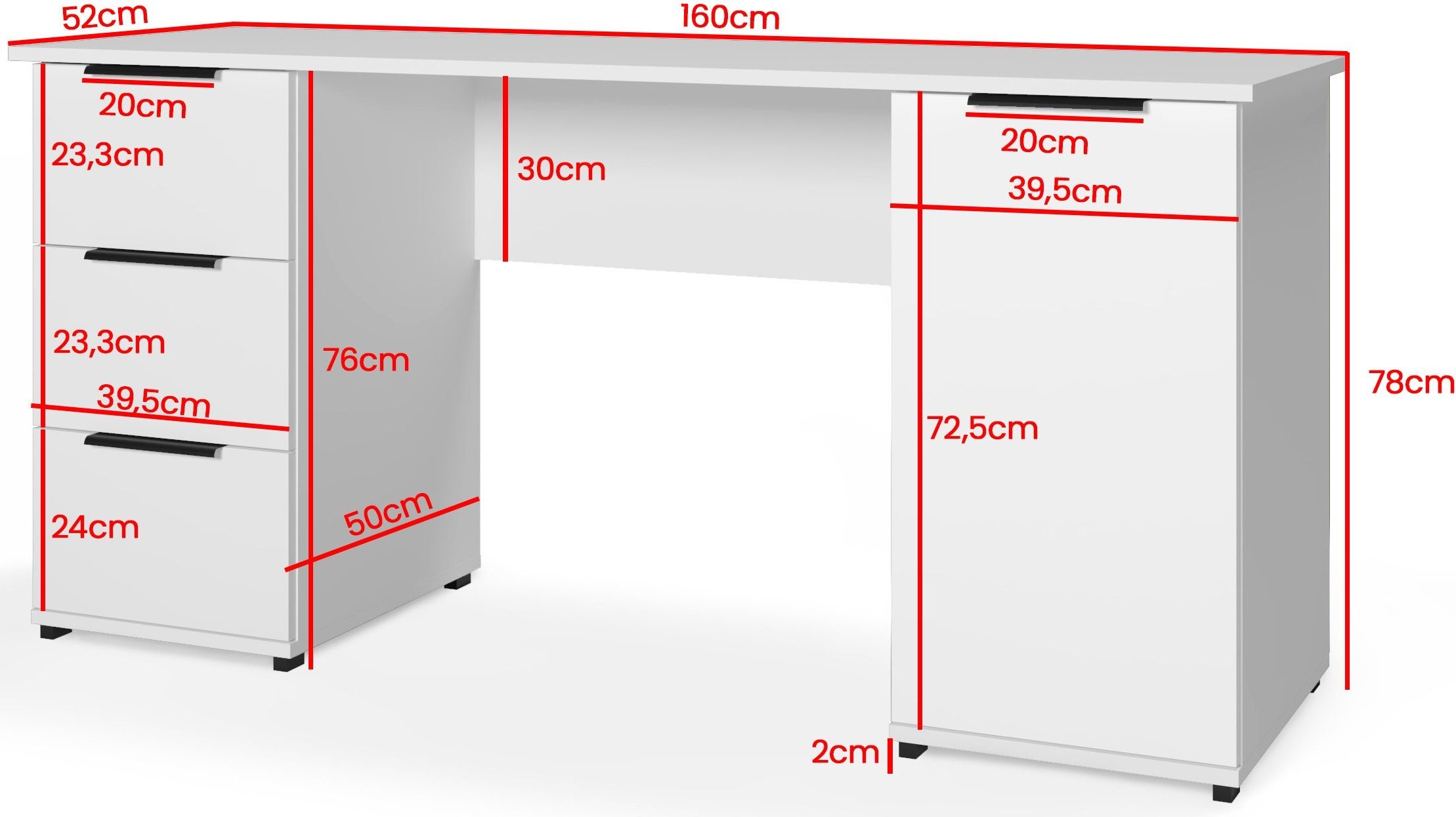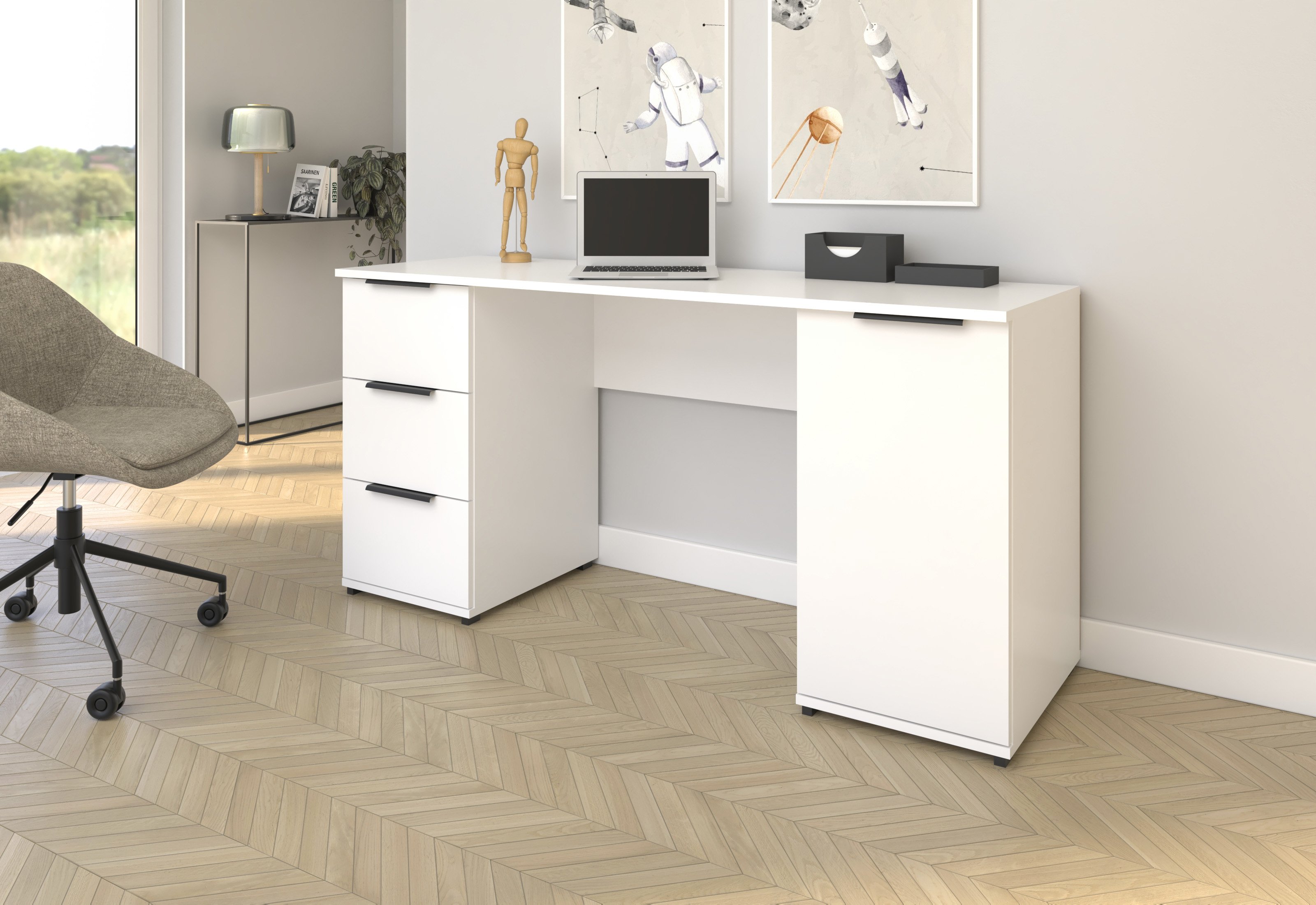 Estetsku vrijednost pisaćeg stola Tivo upotpunjuju elegantne crne metalne ručke duljine 20 cm. One ne služe samo kao praktičan element za otvaranje ladica, već i kao vizualni naglasak koji stvara kontrast s bijelom površinom i stolu daje dašak modernog industrijskog stila. Metalni detalji su izdržljivi i ugodni na dodir, što povećava udobnost korisnika pri svakodnevnoj upotrebi.