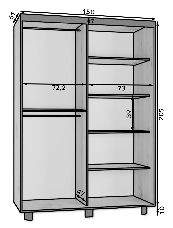 Ormar sadrži šipku za vješanje odjeće i velike police. Uputstva za sastavljanje su priložena.