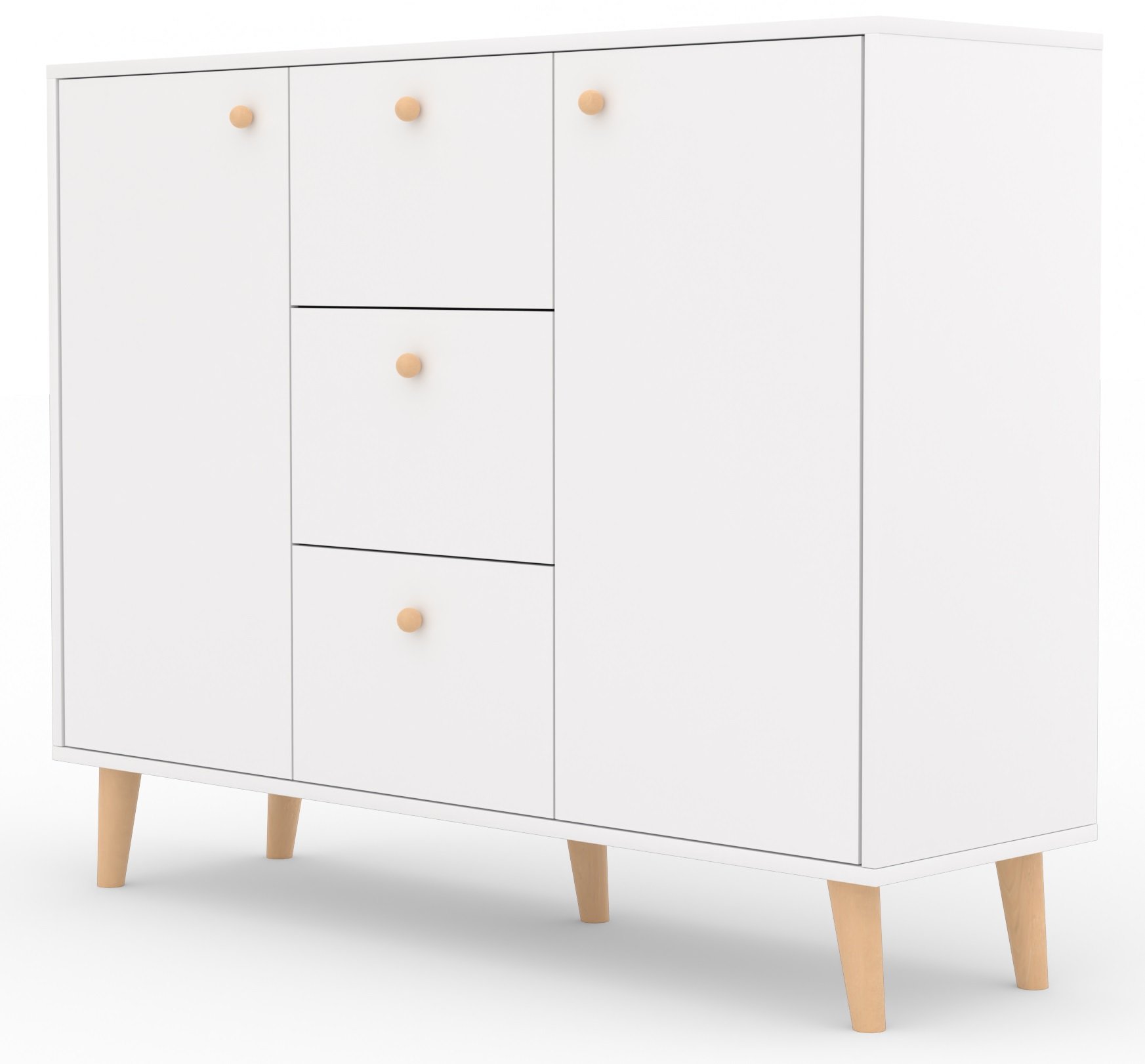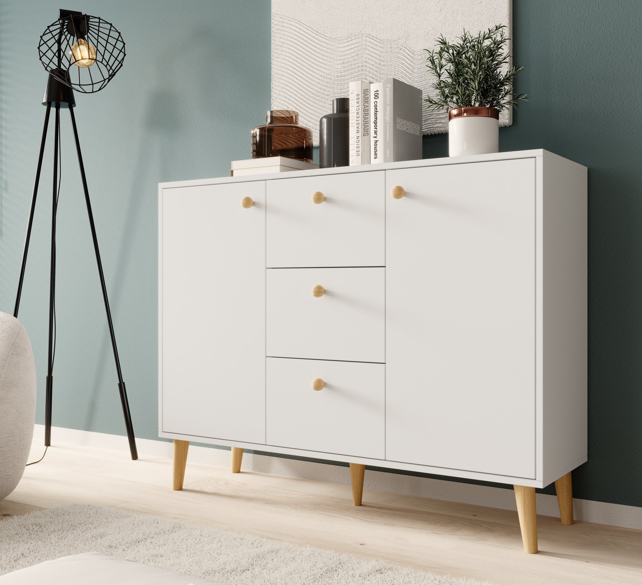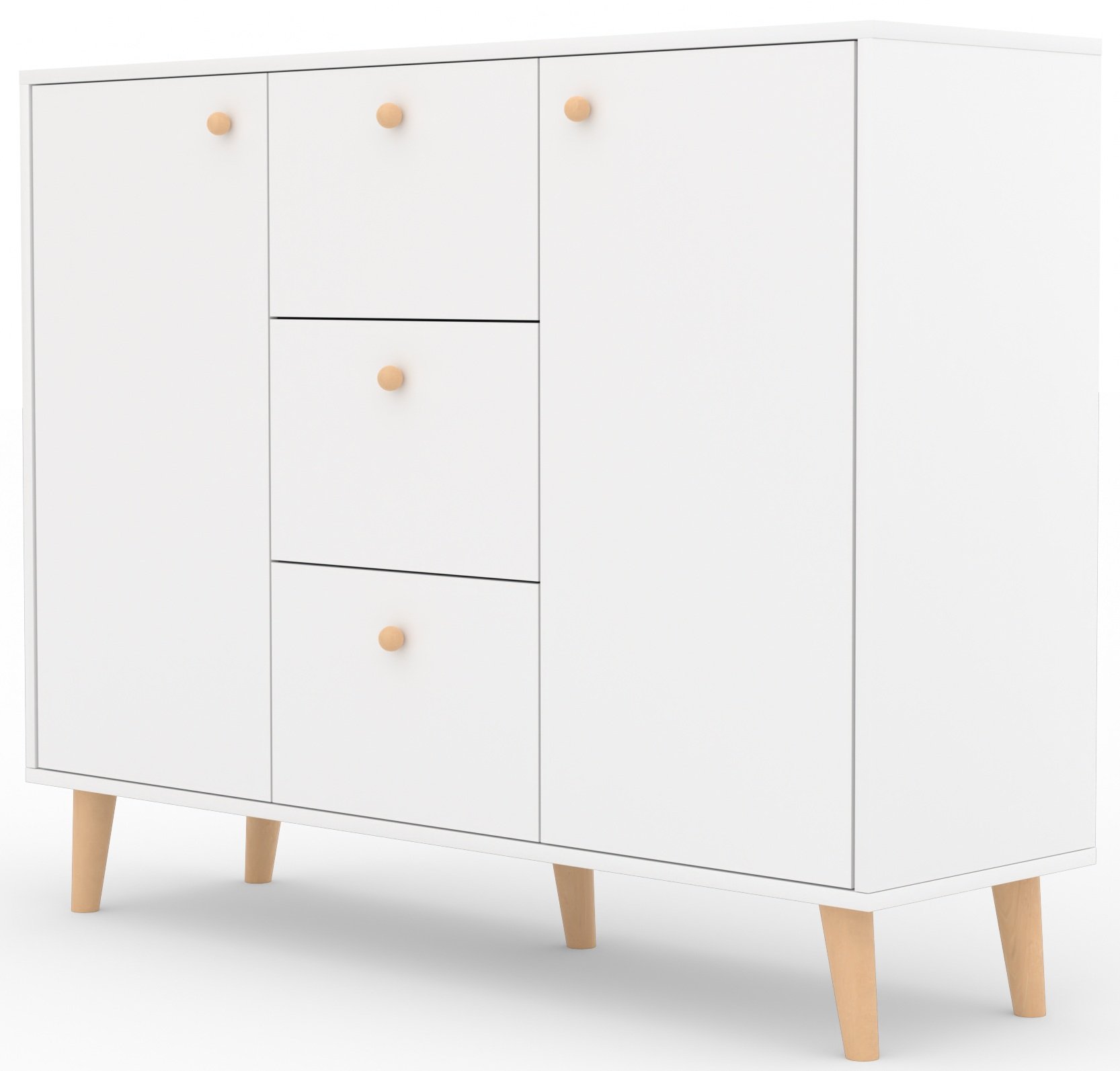 Komoda Besa je moderna komoda, ki vas bo v hipu očarala in prevzela. Odlikujeta jo vrhunska kakovost in dovršena oblikovanost. Komoda je izdelana iz obstojnih materialov. Kombinacija barv bela in bukev, poskrbi za sodobno noto. Komoda z predali in policami, ponuja ogromno prostora za vse vaše predmete.