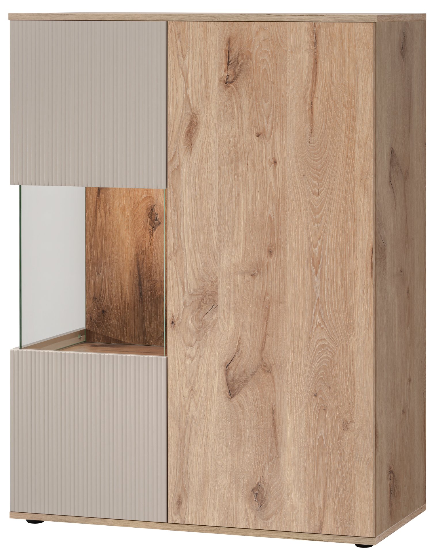 Dimenzije vitrine Catalina (90x40x119.7 cm) omogućuju optimalno korištenje prostora, a istovremeno nude velik kapacitet za pohranu. Djelomično staklena vrata u kombinaciji s kaljenim staklom osiguravaju sigurnost i izdržljivost, dok LED rasvjeta naglašava njezin moderan dizajn i stvara ugodnu atmosferu u prostoru. Osim toga, rebraste prednje stranice i tihi zatvarač dodatak su koji donosi dodatnu udobnost i eleganciju pri korištenju.