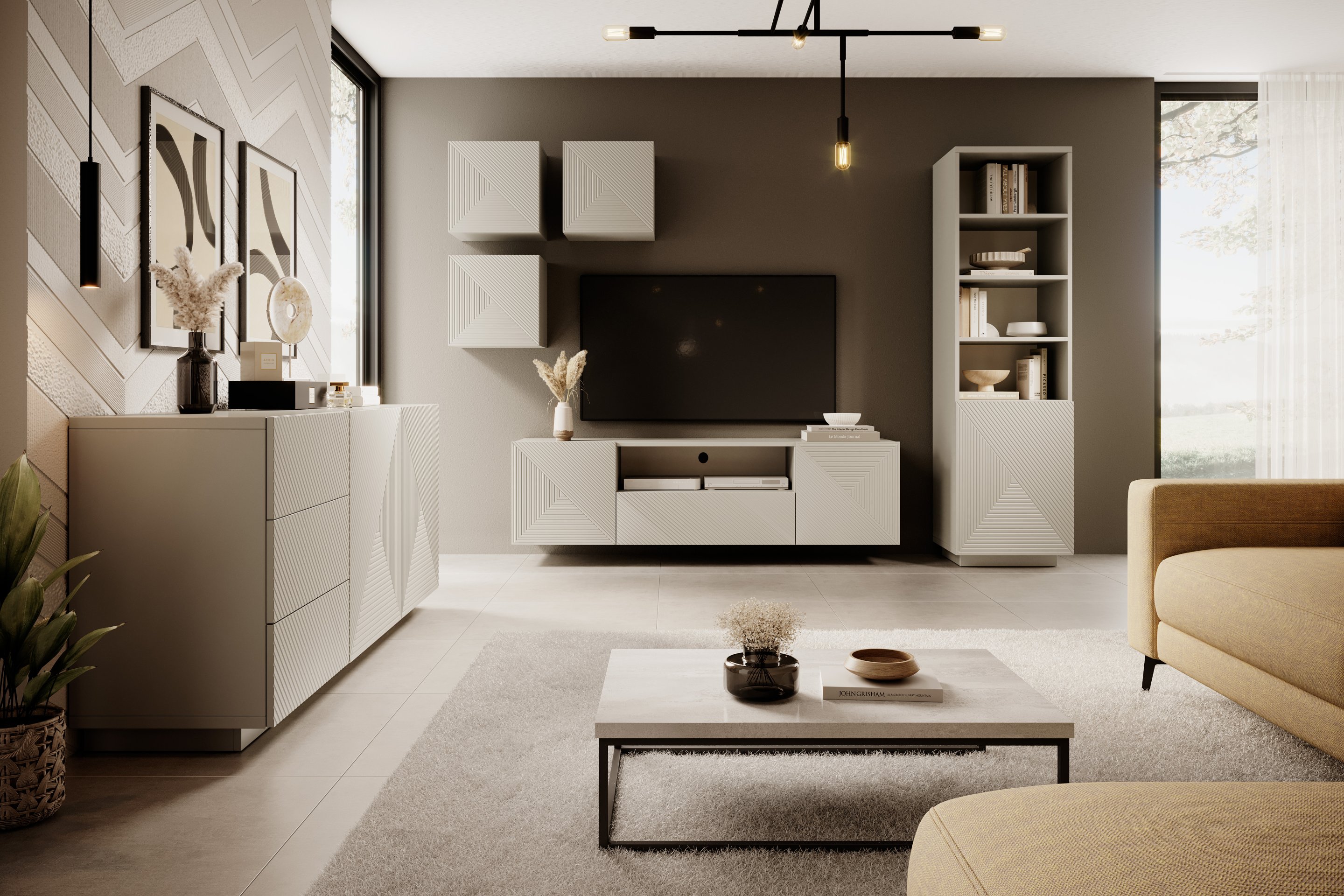 Komplet "Asha" nudi više od samog namještaja; donosi funkcionalnost i stil u vaš dom. S kašmir bojom, koja je sinonim za profinjenost, vaš dnevni boravak ili spavaća soba zračit će toplinom i elegancijom. Sustav otvaranja na pritisak i tiho zatvaranje osiguravaju jednostavnu i elegantnu upotrebu, što je ključno za suvremeni način života.
