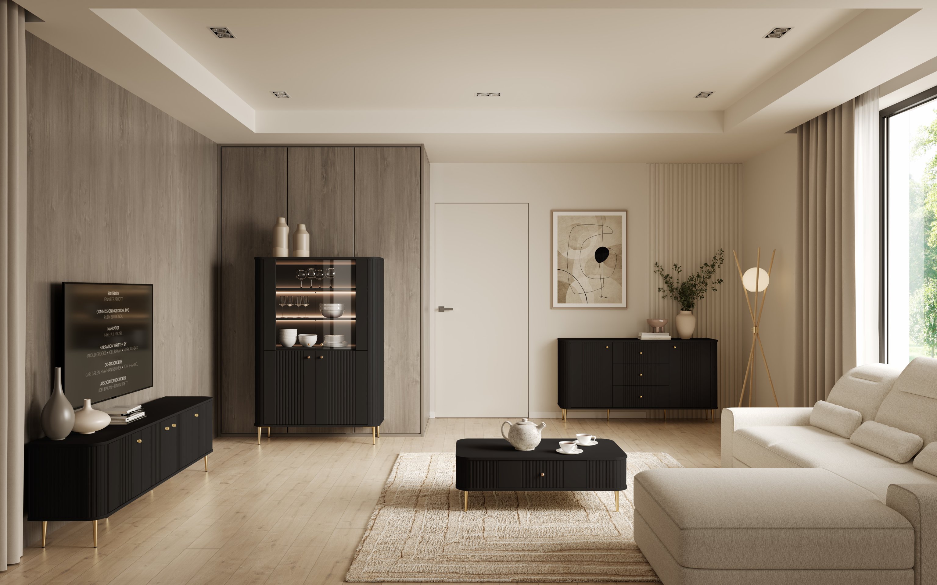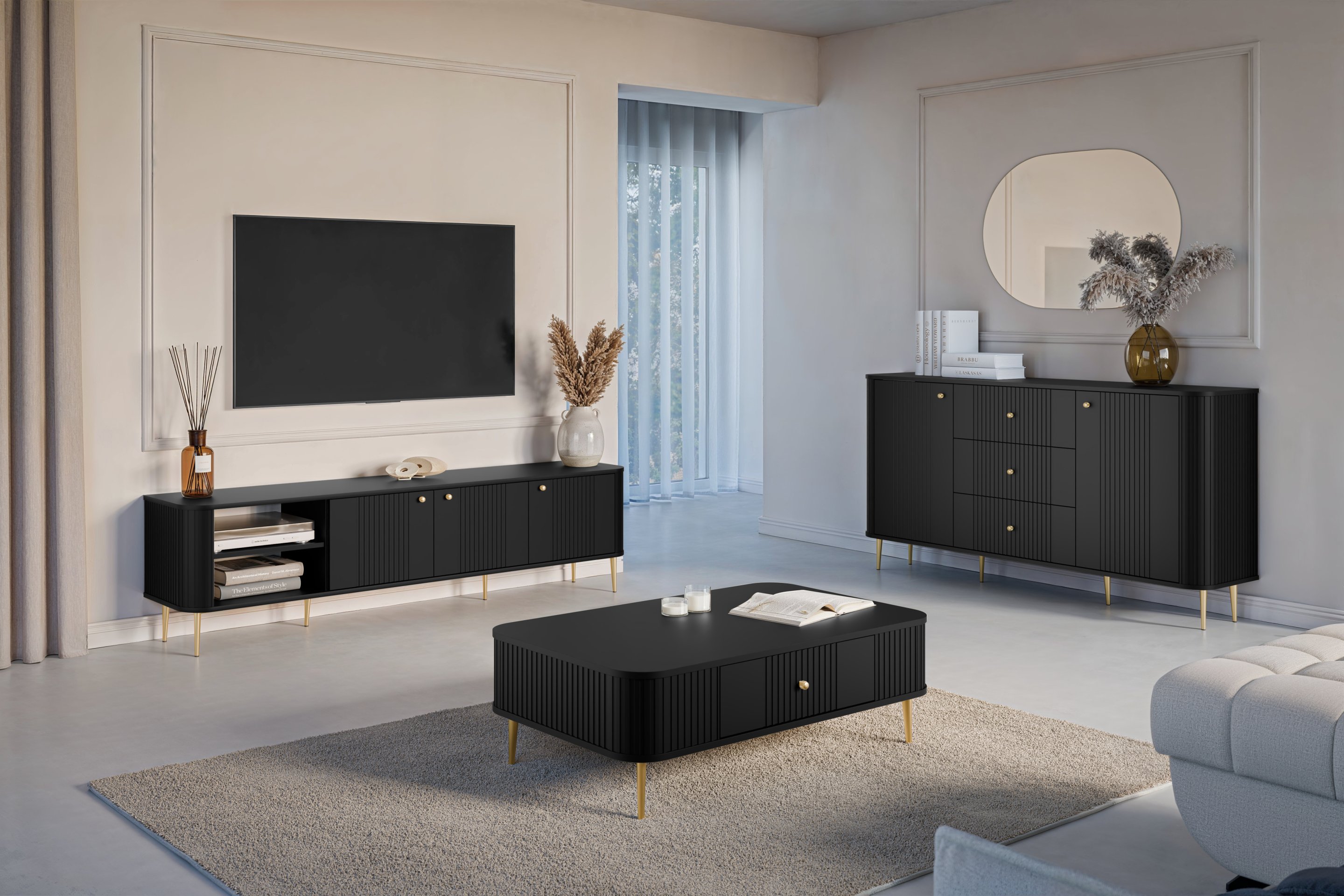 Predstavljamo vam savršeno rješenje za vaš dom – dnevni boravak i spavaća soba Vesper. Ova jedinstvena kombinacija namještaja spaja moderan dizajn i funkcionalnost, koja će vašem prostoru dodati dašak profinjene elegancije. S iznimno modernim crnim površinama i elegantnim zlatnim nogama, ovaj set je osmišljen tako da postane središte svakog dnevnog boravka ili spavaće sobe.