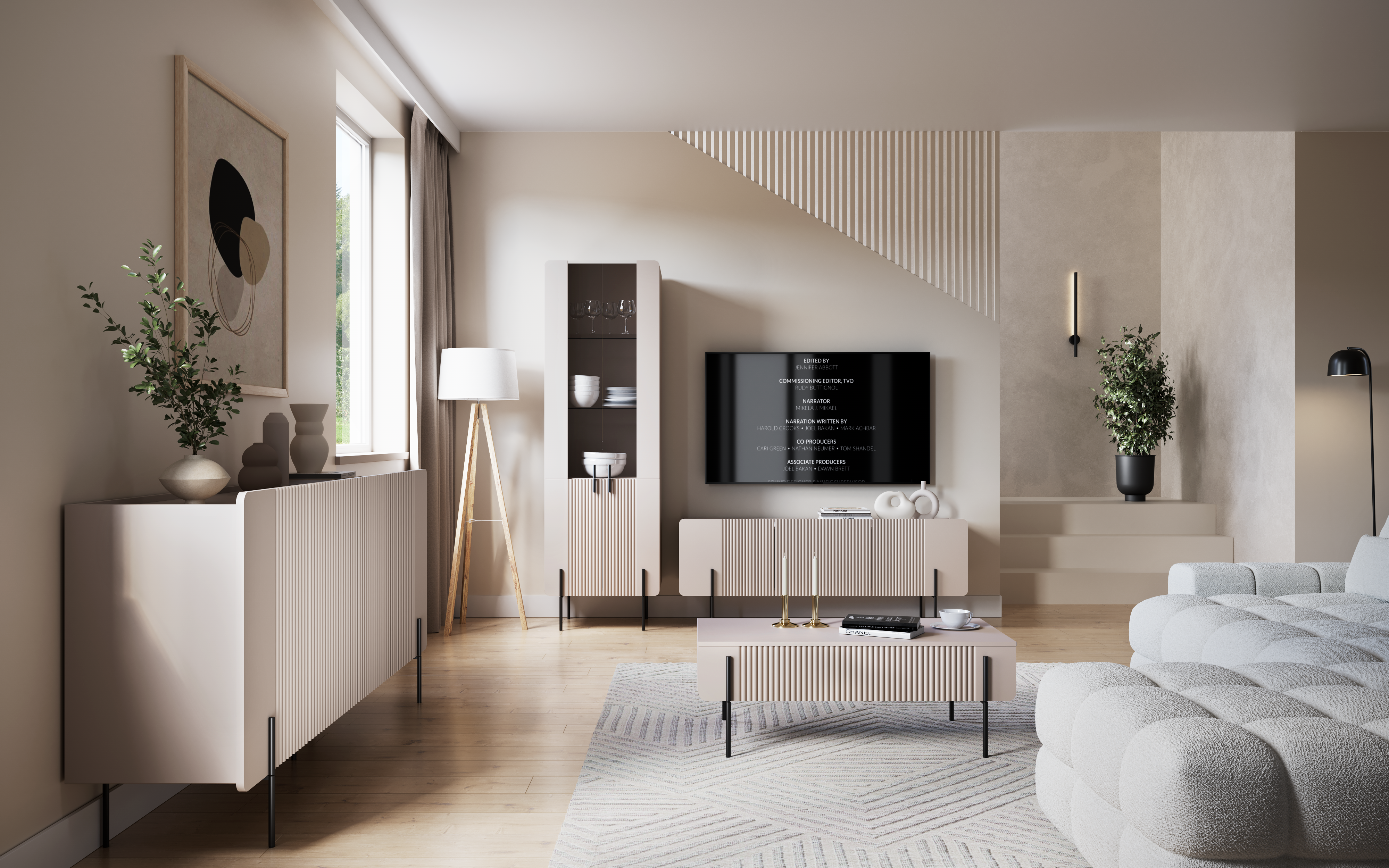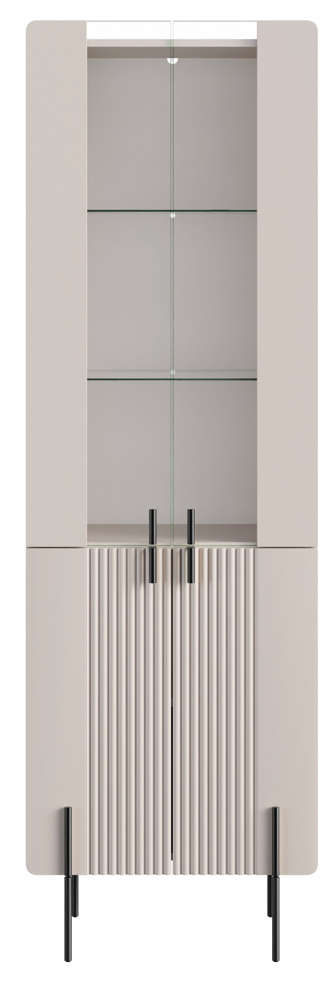 Noge vitrine izrađene su od metalnog okvira, koji je praškasto bojan radi otpornosti na ogrebotine i hrđu, te osigurava stabilnost s visinom od 17 cm. Ovaj promišljeni dizajn nogica omogućuje lakše čišćenje poda ispod vitrine i dodaje moderan dojam cijelom prostoru.