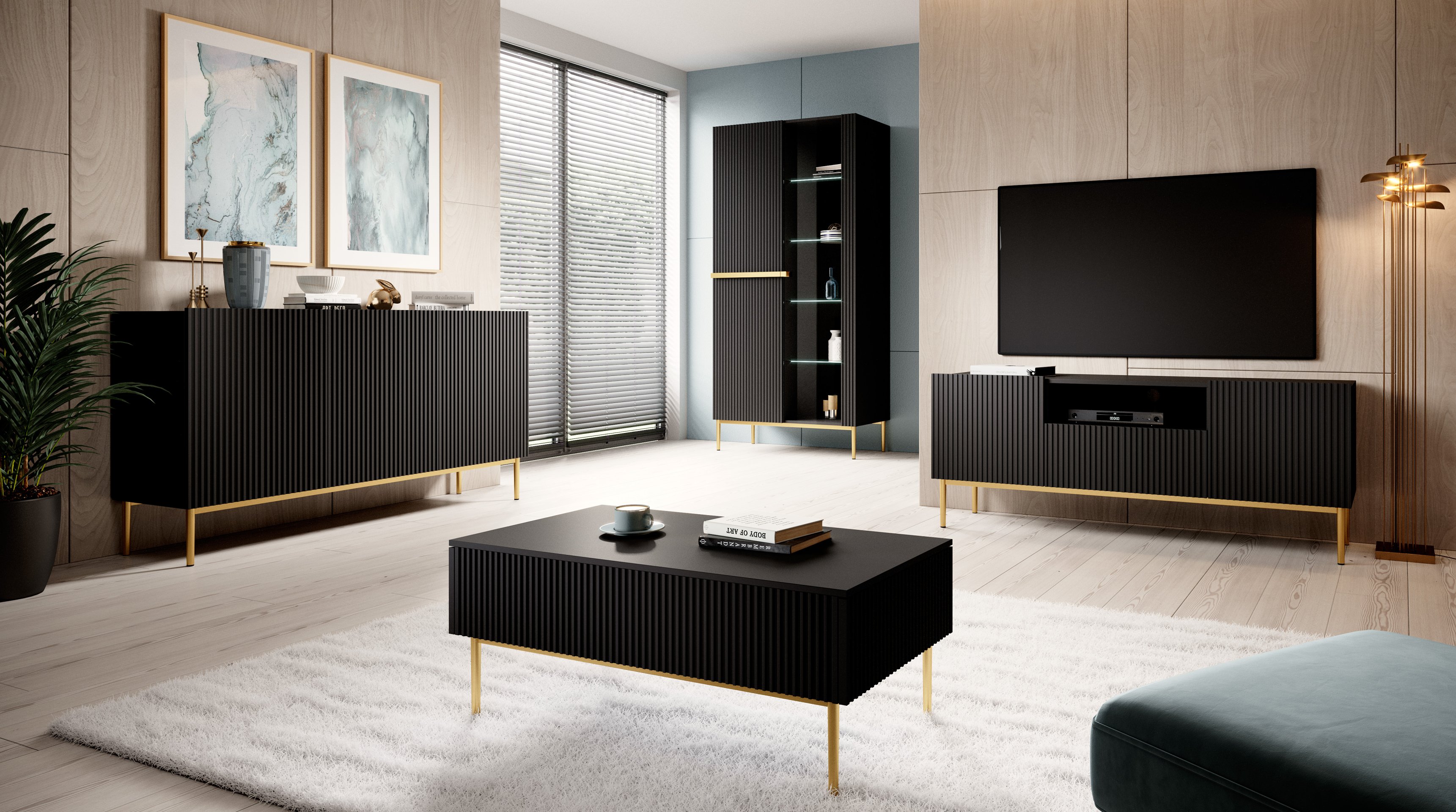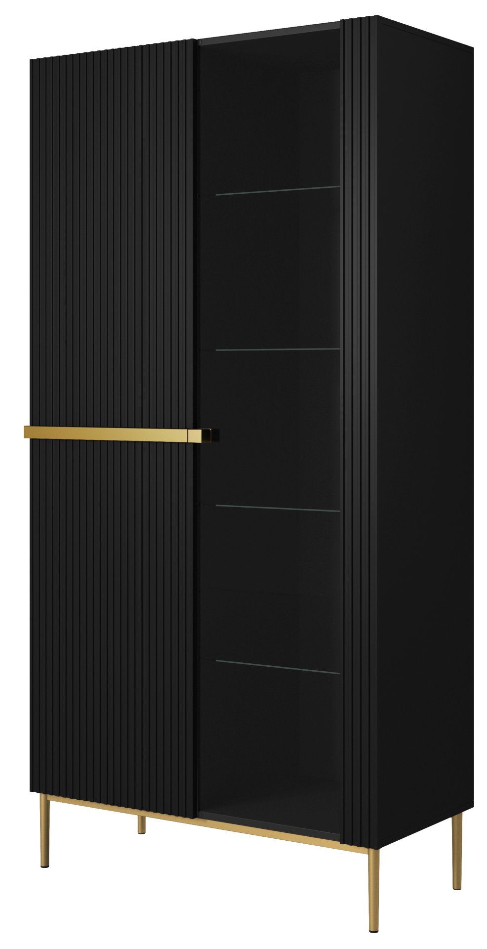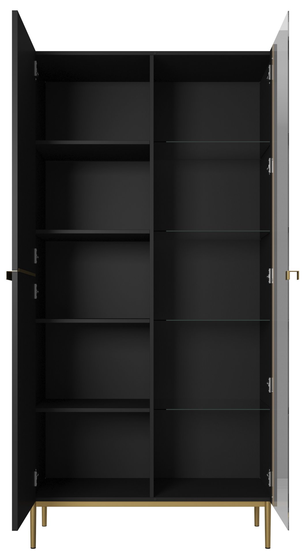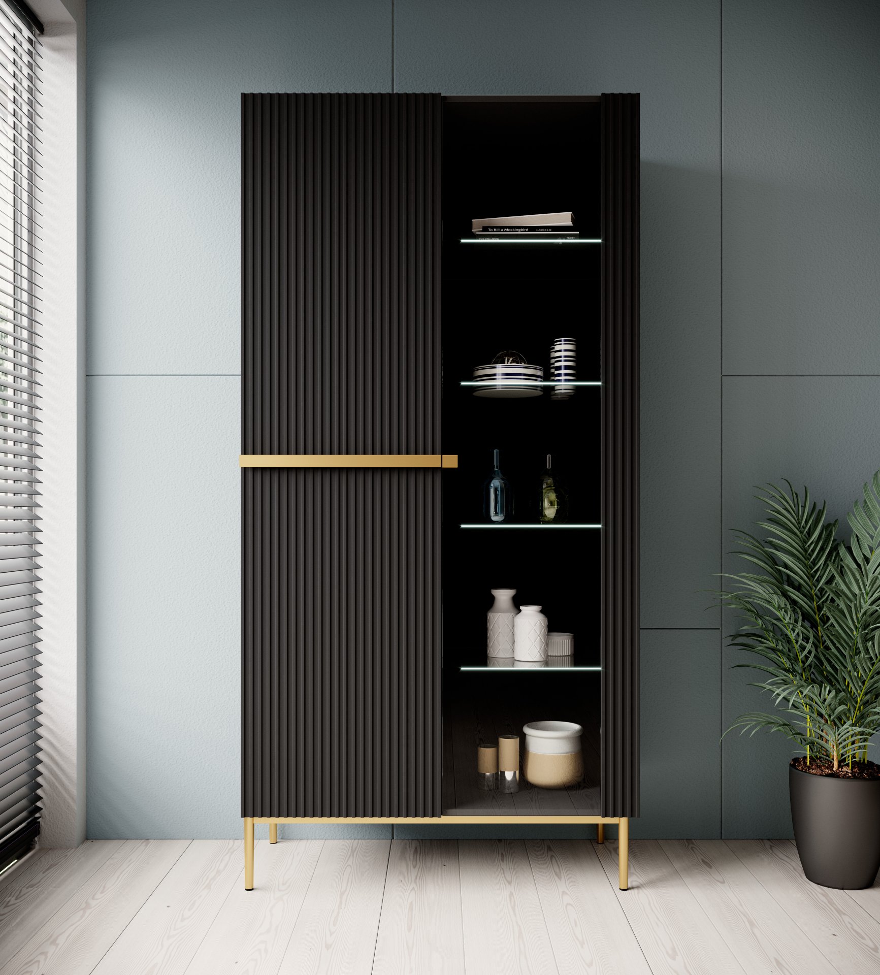 Za one koji žele dodatni dašak luksuza, dostupna je i opcija LED rasvjete koja će diskretno osvijetliti vaše omiljene predmete u vitrini. Crne ili zlatne metalne noge, obložene praškastom bojom, dodaju stabilnost i omogućuju jednostavno čišćenje prostora ispod vitrine. S visinom nogica od 20 cm, vitrina nudi elegantan izgled i praktičnost.