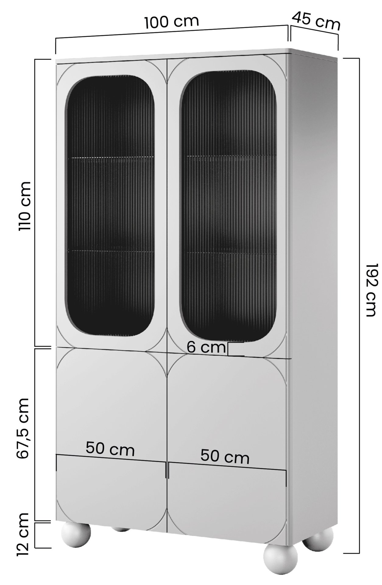 S dimenzijama 104x45x200 cm vitrina nudi obilje prostora za pohranu vaših omiljenih predmeta. Stražnja stranica od HDF ploče debljine 3 mm u crnoj boji dodaje stabilnost i estetski završetak. Metalne noge, praškasto obojene u crno, podižu vitrinU 20 cm od poda, što omogućuje lakše čišćenje i elegantan izgled.