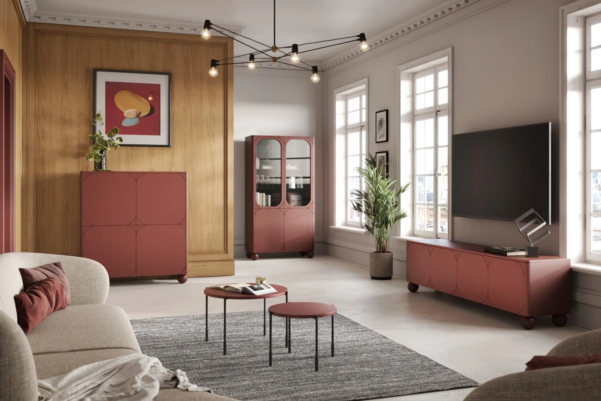 Predstavljamo vam vitrinu Sonatia 100 4D, savršenu kombinaciju elegancije i funkcionalnosti, koja će vašem domu dodati dašak profinjenosti. Ova zadivljujuća vitrina u burgundsko crvenoj boji dizajnirana je za sve koji cijene stil i kvalitetu. Sa svojim izvanrednim značajkama i promišljenom izradom, idealan je izbor za svaku modernu dnevnu sobu.