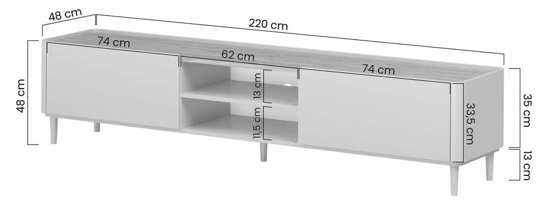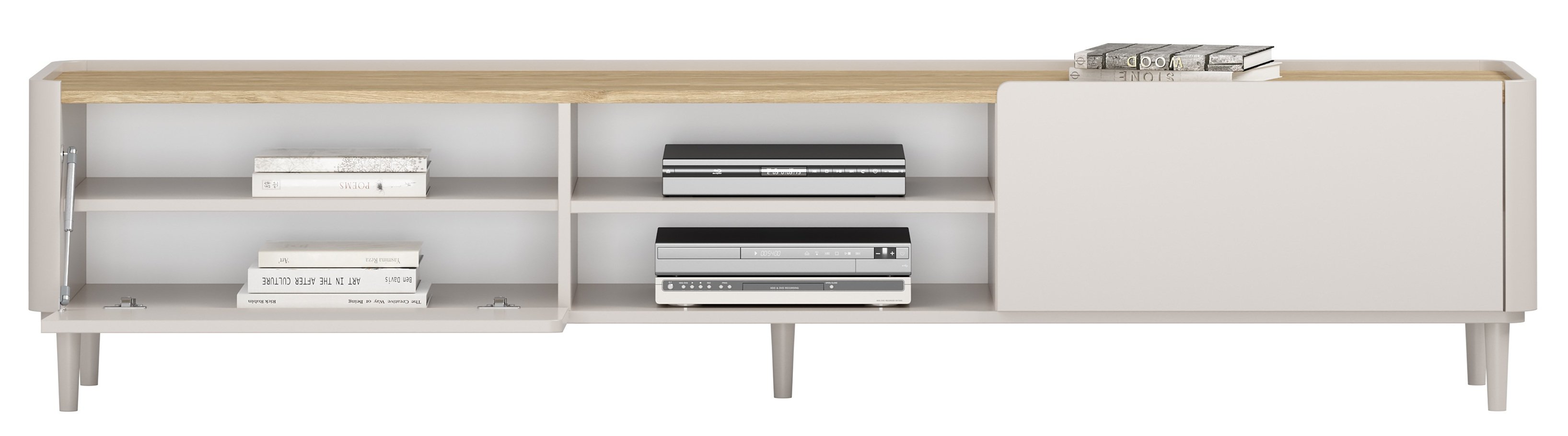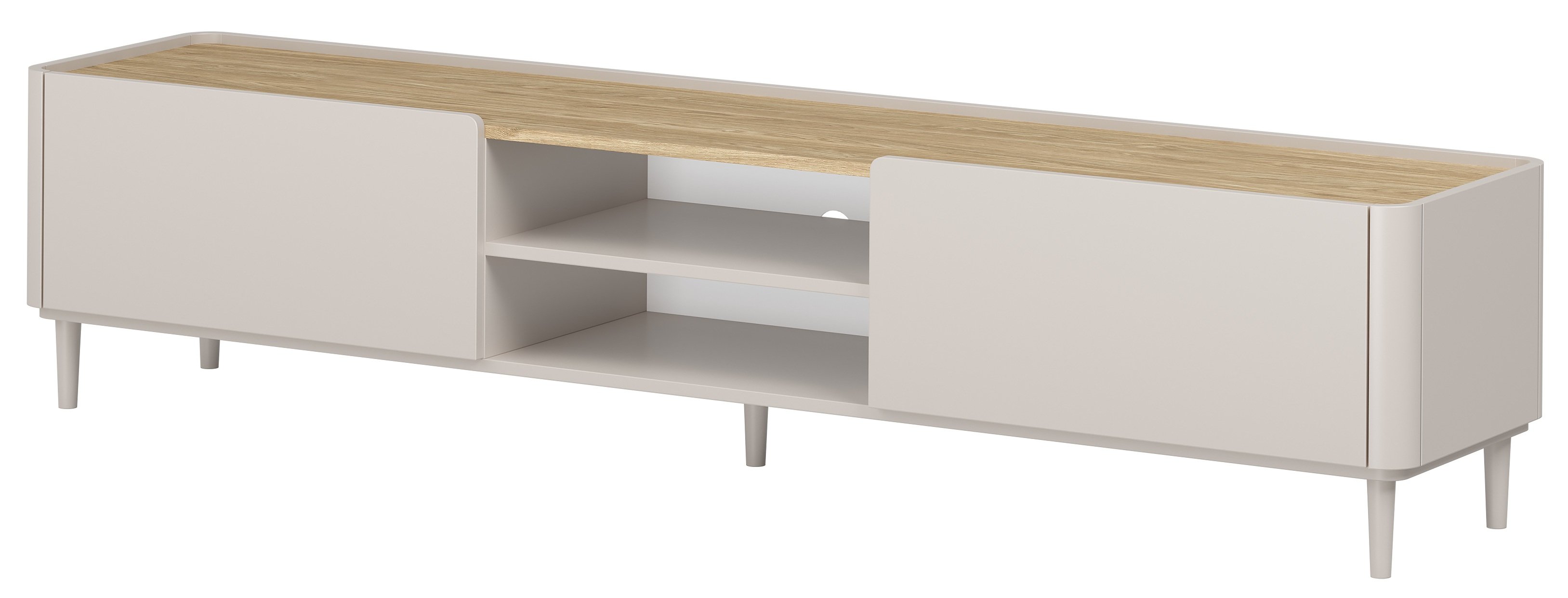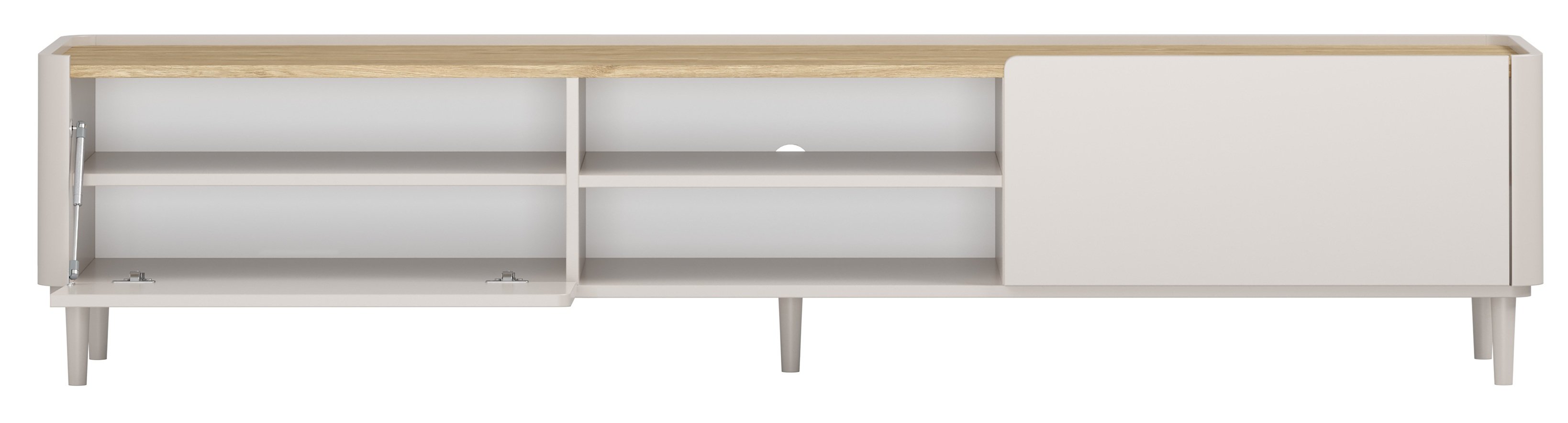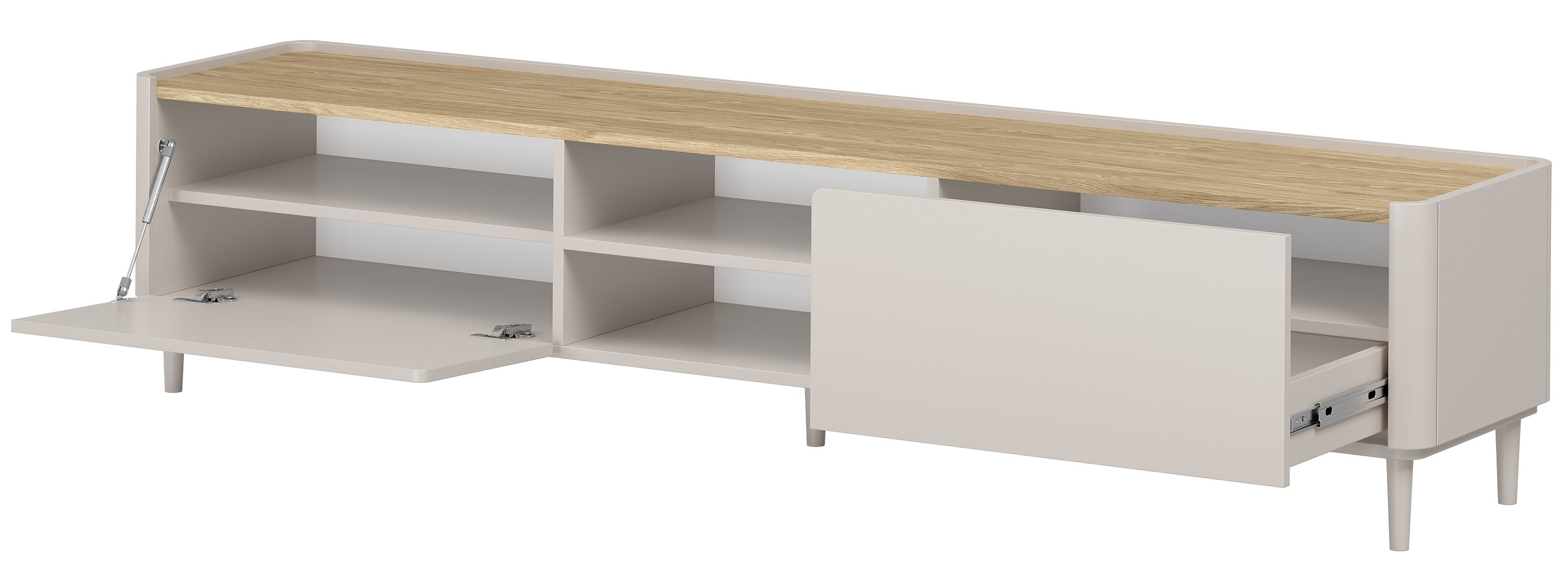 TV komoda Elivo 220 1K1SZ u boji kašmira s gornjom pločom u nijansi nauljenog hrasta savršen je izbor za sve koji cijene profinjenu estetiku i funkcionalnost. Njezine uravnotežene proporcije, dimenzije 220 x 48 x 48 cm, stvaraju prostran, ali vizualno lagan komad namještaja, prikladan za različite suvremene interijere. Kombinacija mat površine i prirodne teksture drva dodaje prostoru toplinu te osjećaj urednosti, koji naglašava minimalistički dizajn bez ručkica.