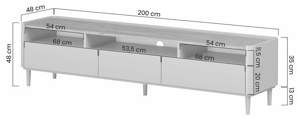 Osnova komode izrađena je od 18 mm debele oplemenjene iverice i MDF‑a, što osigurava stabilnost i dug vijek trajanja. Rubovi su obrađeni otpornim ABS materijalom, koji učinkovito štiti od udaraca i trošenja. Dodatna peta noga u sredini povećava stabilnost konstrukcije, osobito pri većem opterećenju, što je važno pri postavljanju suvremenih televizora i multimedijskih uređaja. Izrada u tvornici Bogart u Poljskoj potvrđuje kvalitetnu obradu i preciznost detalja.