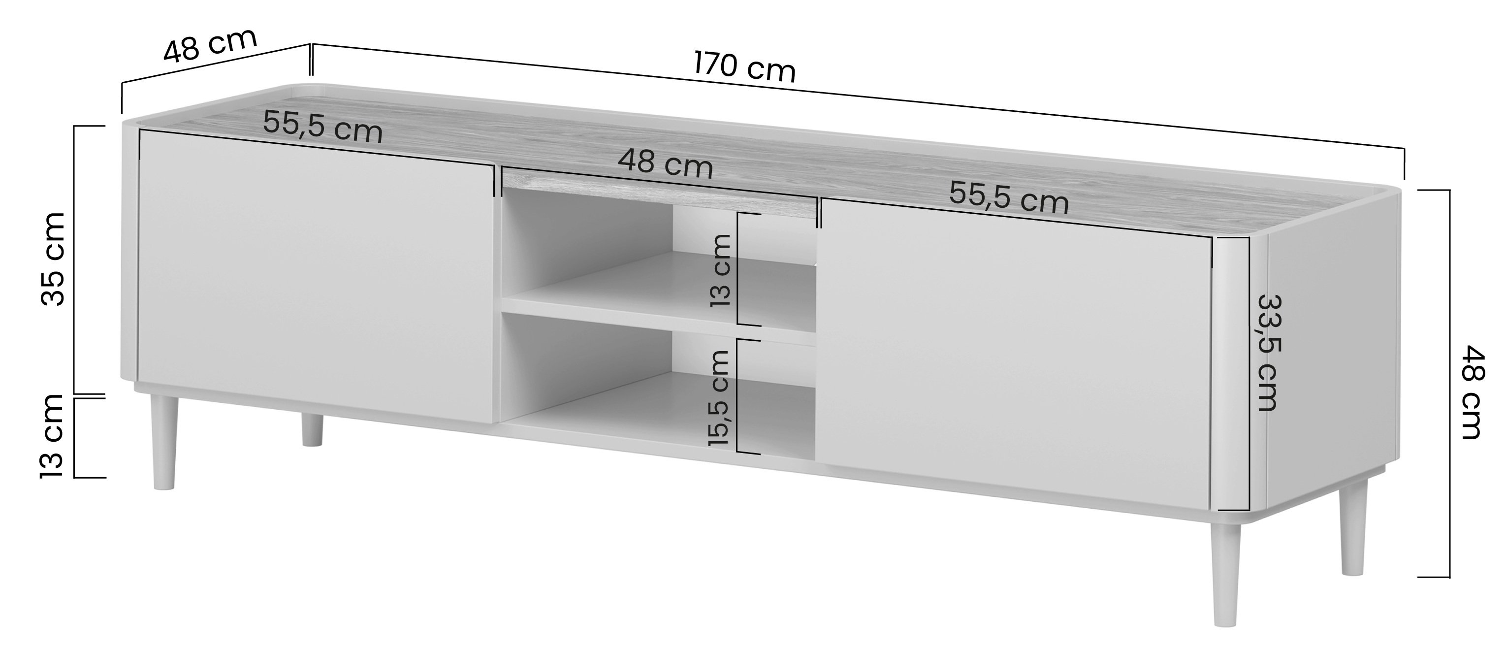 Vanjske mjere iznose 170 × 48 × 48 cm. Komoda je dizajnirana za optimalno iskorištavanje prostora u dnevnoj sobi ili multimedijskom kutku. Njezina duljina omogućuje postavljanje većih televizora, dok unutarnji raspored s jednim vratnim elementom (1K) i jednim ladicom (1SZ) nudi ravnotežu između otvorenih i zatvorenih površina za pohranu.