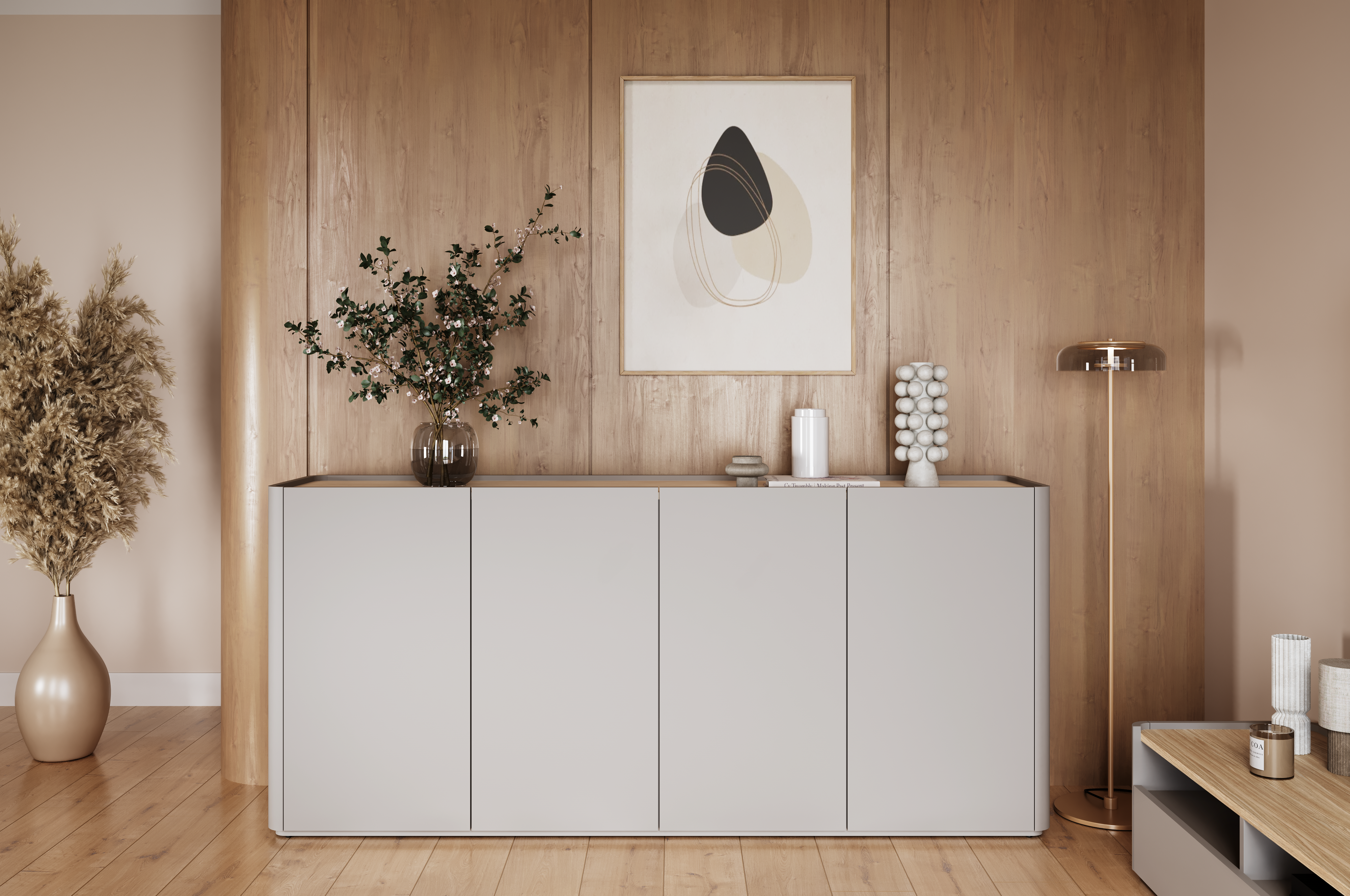Komoda Elivo 200 4D lijepo se slaže s drugim komadima namještaja u sličnim tonovima boja, posebno s elementima u hrastu, bijelim ili pješčanim nijansama. Idealna je za postavljanje uz zid dnevnog prostora, gdje se na gornjoj plohi mogu izložiti dekorativni dodaci, svjetiljka ili okviri sa fotografijama. Zahvaljujući neutralnim bojama i profinjenim materijalima, komoda se prilagođava različitim interijerima i stilovima, bez gubitka svog jedinstvenog identiteta.