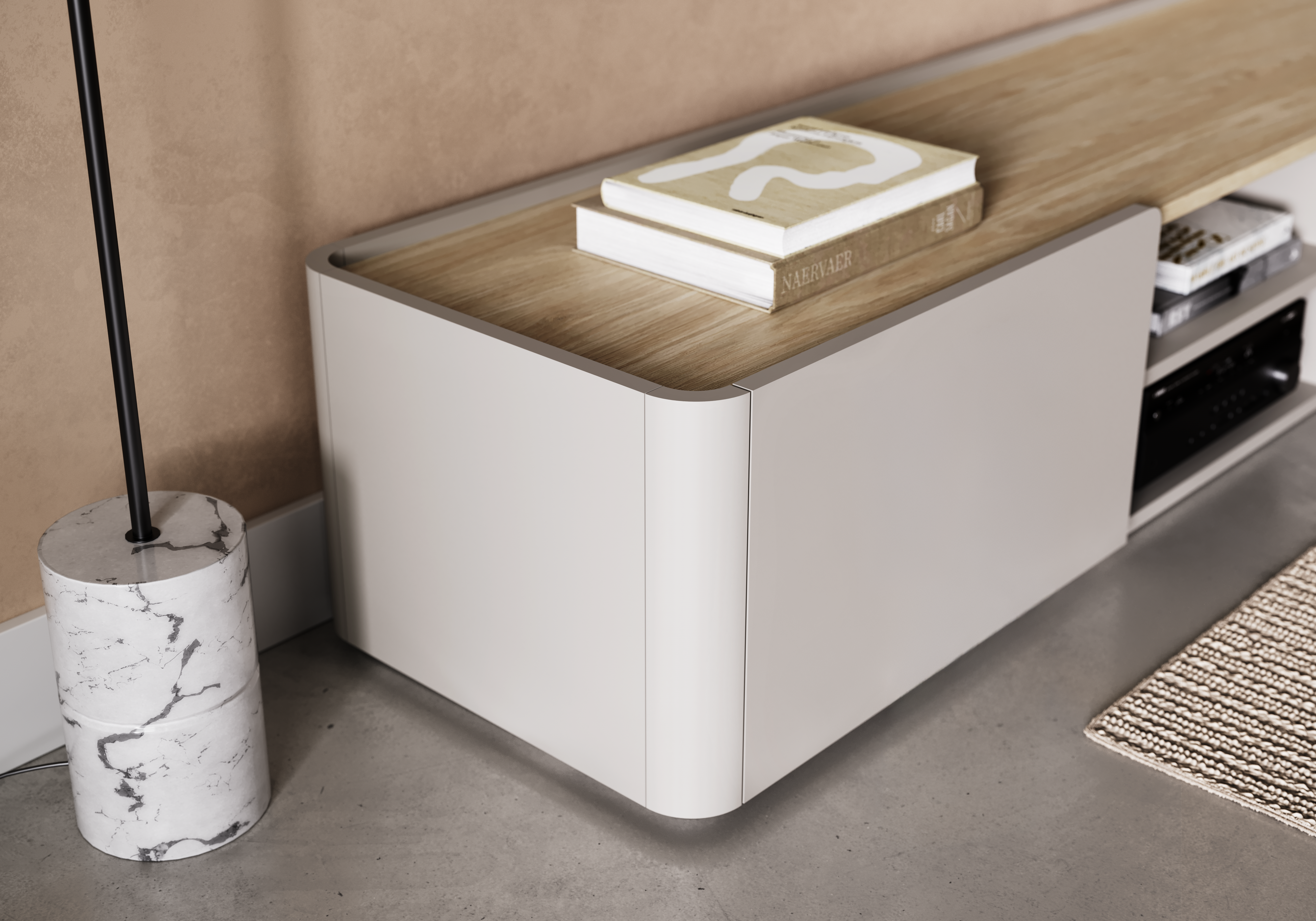 Komoda ima dvoja vrata s mekim zatvaranjem, što sprječava lupanje i produljuje vijek trajanja šarki. Odsutnost ručki pridonosi čistoj i suvremenoj liniji fronte, a istovremeno omogućuje jednostavno otvaranje laganim pritiskom. U unutrašnjosti se nalazi 12 pretinaca te dvije podesive police, koje se mogu prilagoditi ovisno o visini pohranjenih predmeta. Takav dizajn omogućuje uredno pohranjivanje posuđa, tekstila, dokumenata ili osobnih predmeta, ovisno o namjeni korištenja.