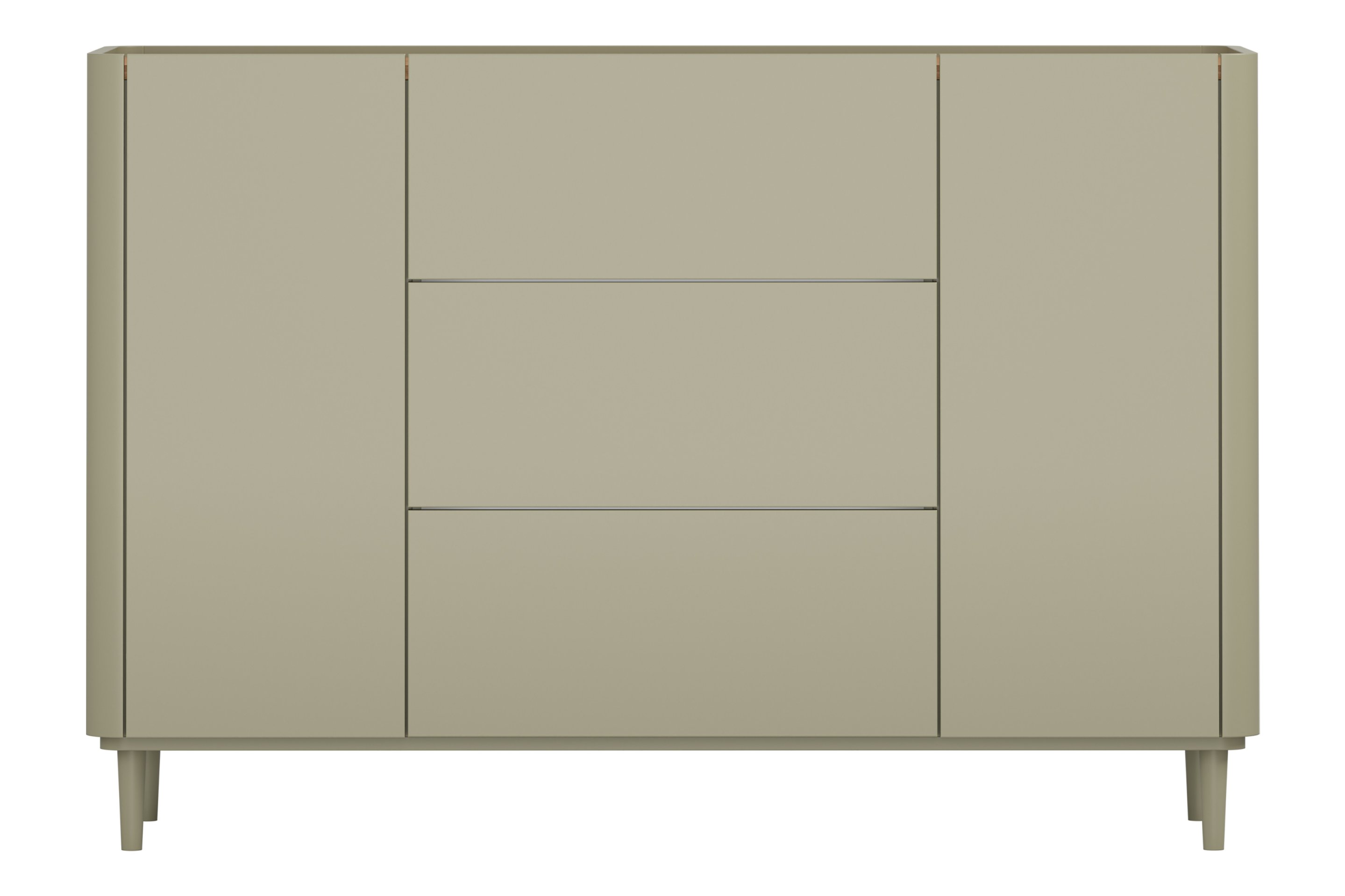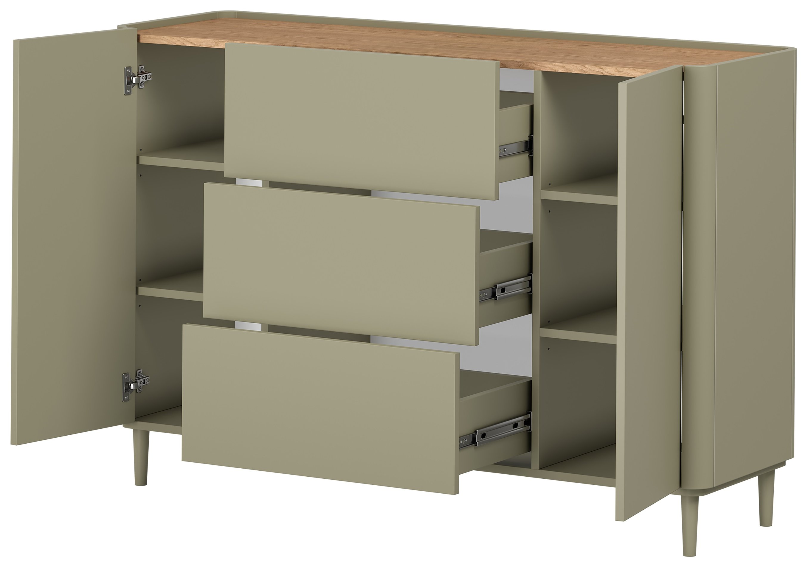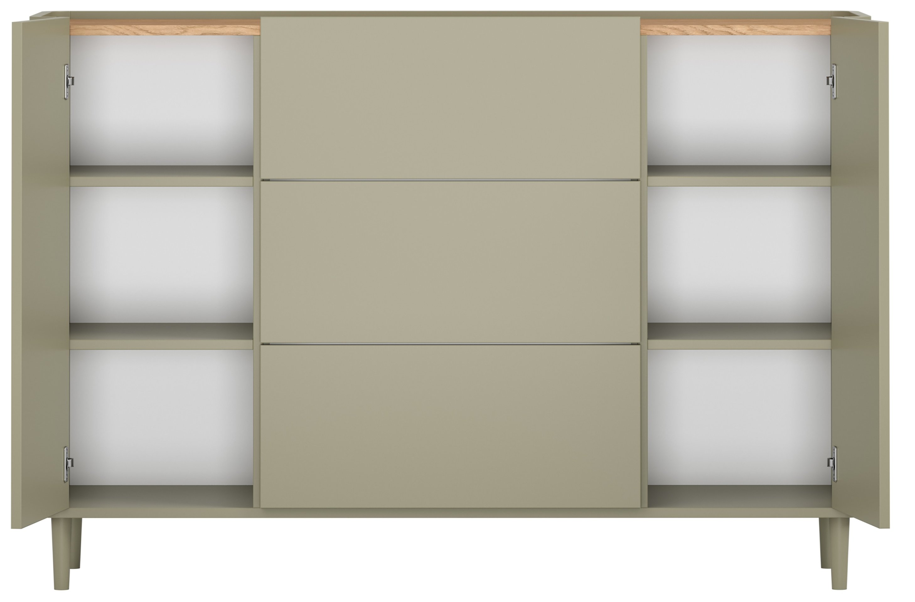 Prirodne nijanse eukaliptusa u kombinaciji s gornjom pločom u boji hrasta Baltic Dune privlače pažnju i u prostor unose ugodnu, suvremenu atmosferu. Vitke bukove noge dodaju lakoću, a zaobljeni rubovi fronti cijelom komadu daju dašak nježne elegancije. Takav dizajn osigurava da komoda ističe i u dnevnoj sobi, spavaćoj sobi, blagovaonici kao i u uredu.