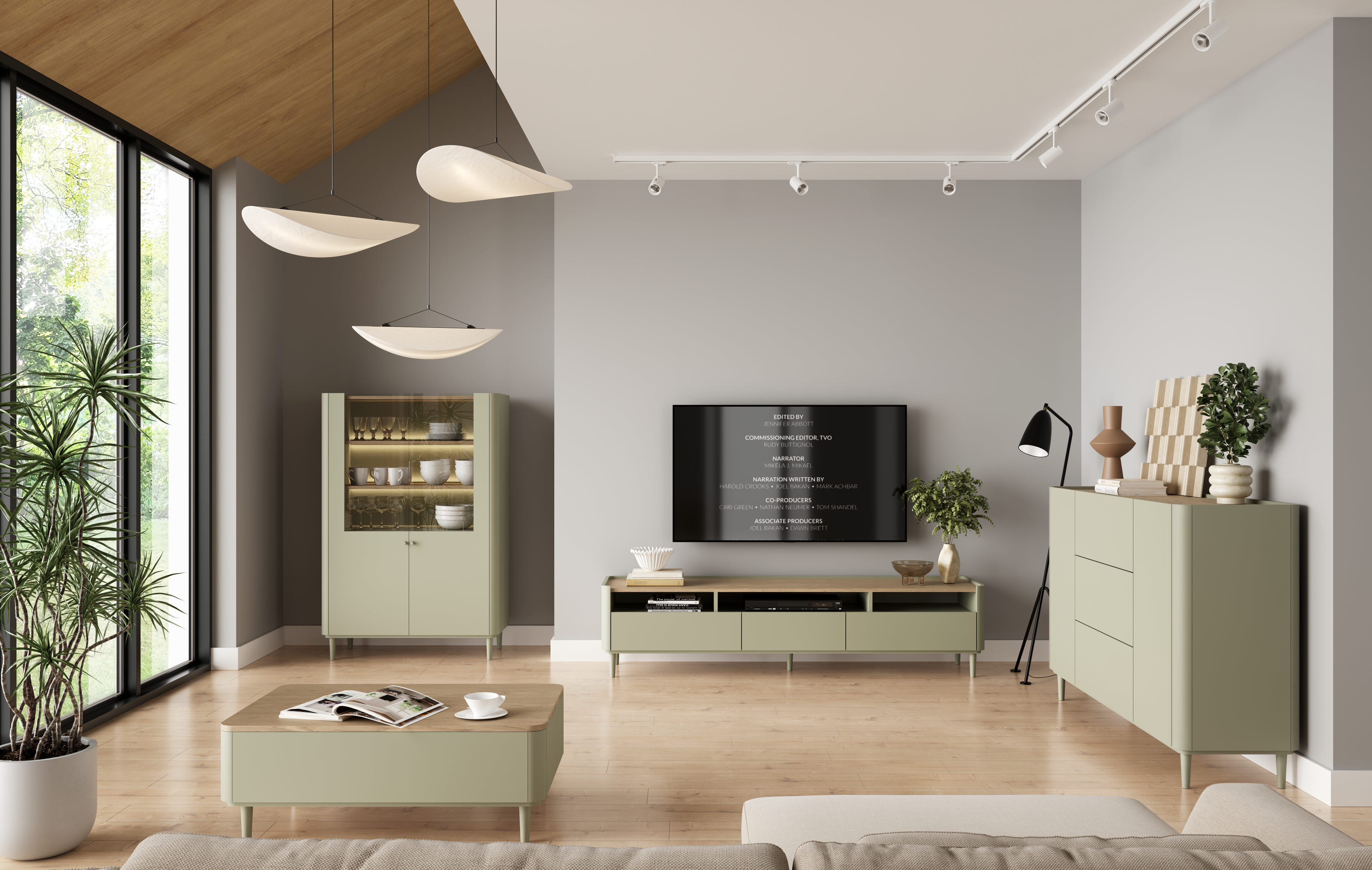 Topli tonovi eukaliptusa u kombinaciji sa svijetlim hrastom baltski dune stvaraju smirenu, prirodnu atmosferu. Ova se kombinacija boja izvrsno slaže sa svijetlim zidovima, drvenim podovima te dodacima u bež, sivim ili zelenkastim nijansama. Komoda se harmonično uklapa i u prostrane dnevne sobe i u manje prostore, jer njezine vitke noge i uravnoteženi proporcije održavaju osjećaj prozračnosti. Zbog neutralnog kolorističkog rješenja lijepo se nadopunjuje i s drugim komadima iz kolekcije Elivo ili s kontrastnim, suvremenim elementima.