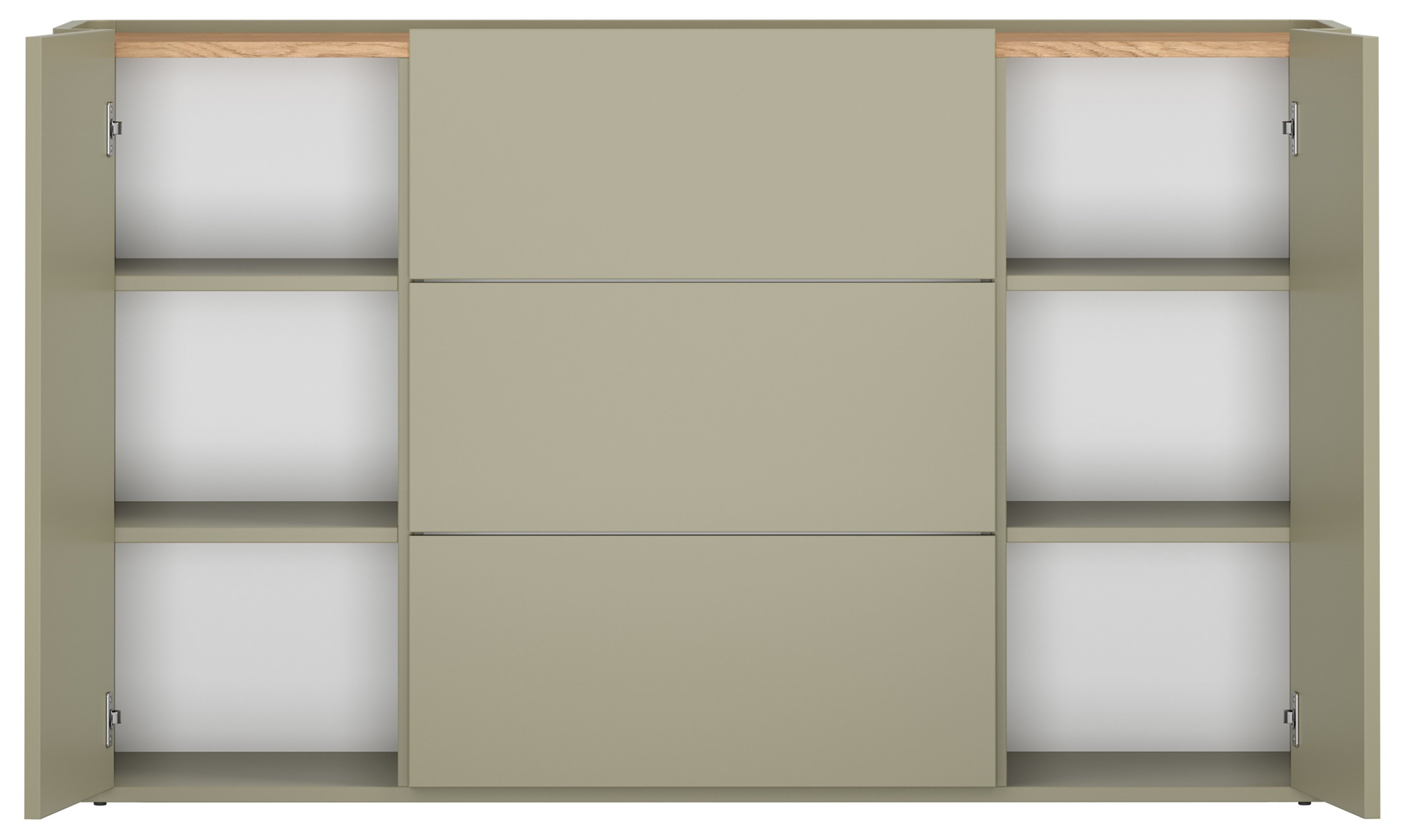Kombinacija boje eukaliptus i hrasta baltski dune omogućuje široke mogućnosti kombiniranja s drugim komadima namještaja. Komoda Elivo 150 2D3SZ lijepo se slaže s neutralnim tonovima zidova ili podova, a također nadopunjuje moderne interijere u kojima prevladavaju prirodni materijali i čiste linije. Zbog svog uravnoteženog dizajna može stajati samostalno ili kao dio većeg namještajskog sastava iz iste serije. Njezina kombinacija boja prikladna je i za svjetlije i za tamnije prostore, jer stvara osjećaj topline i ravnoteže.