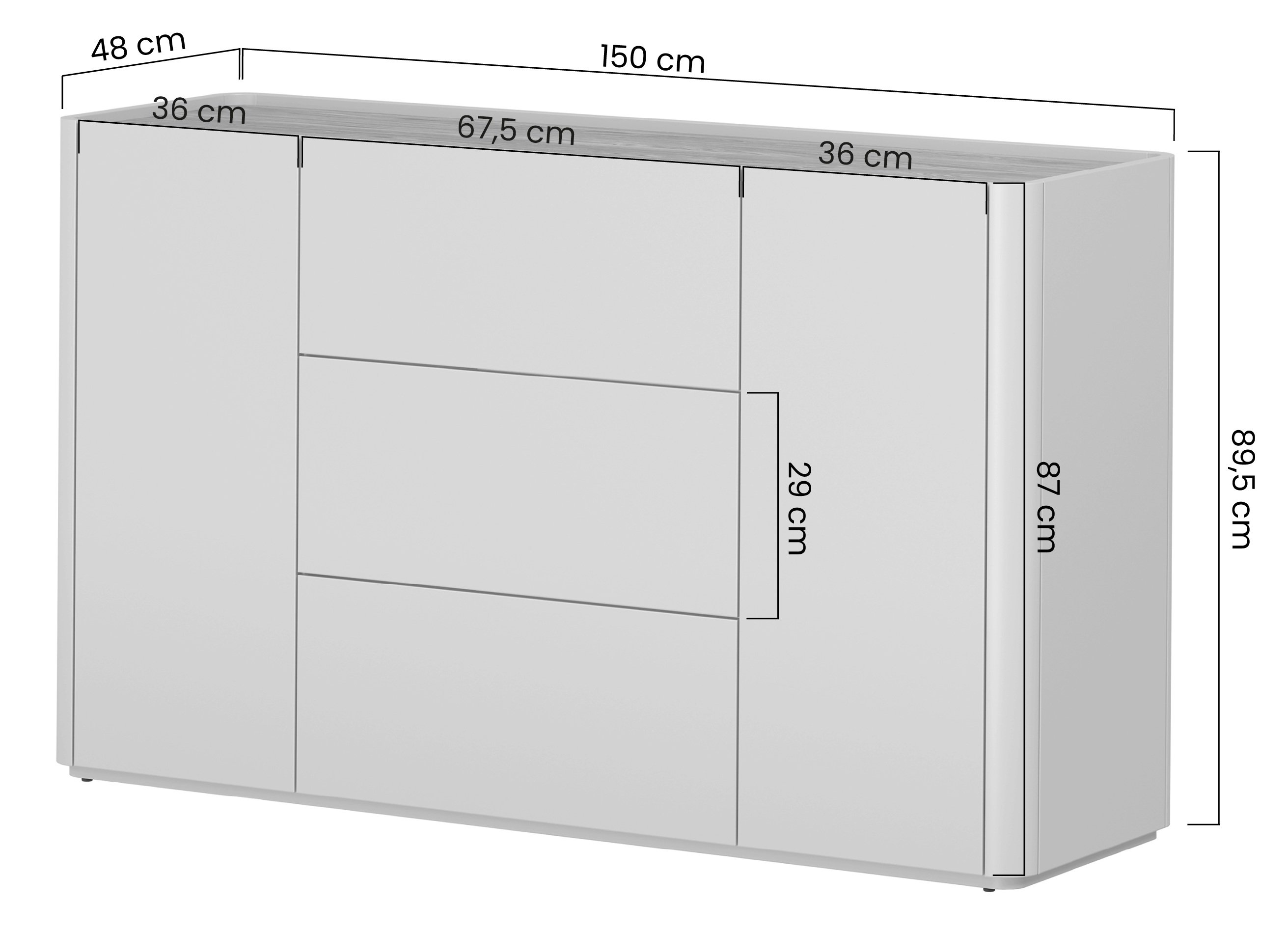 Ova elegantna komoda spaja moderan dizajn, funkcionalnost i kvalitetnu izradu. Izrađena je od izdržljivih MDF ploča debljine 18 mm te melaminskih površina koje osiguravaju otpornost na habanje i jednostavno čišćenje. Površina u boji eukaliptusa s gornjom pločom u nijansi baltičkog dune hrasta donosi prirodan izgled i toplinu u svaki prostor. Komoda se sa svojom širinom 150 cm, dubinom 48 cm i visinom 89,5 cm lijepo uklapa u dnevne sobe, spavaće sobe ili hodnike, gdje je potrebna dodatna površina za odlaganje bez kompromisa po pitanju estetike.