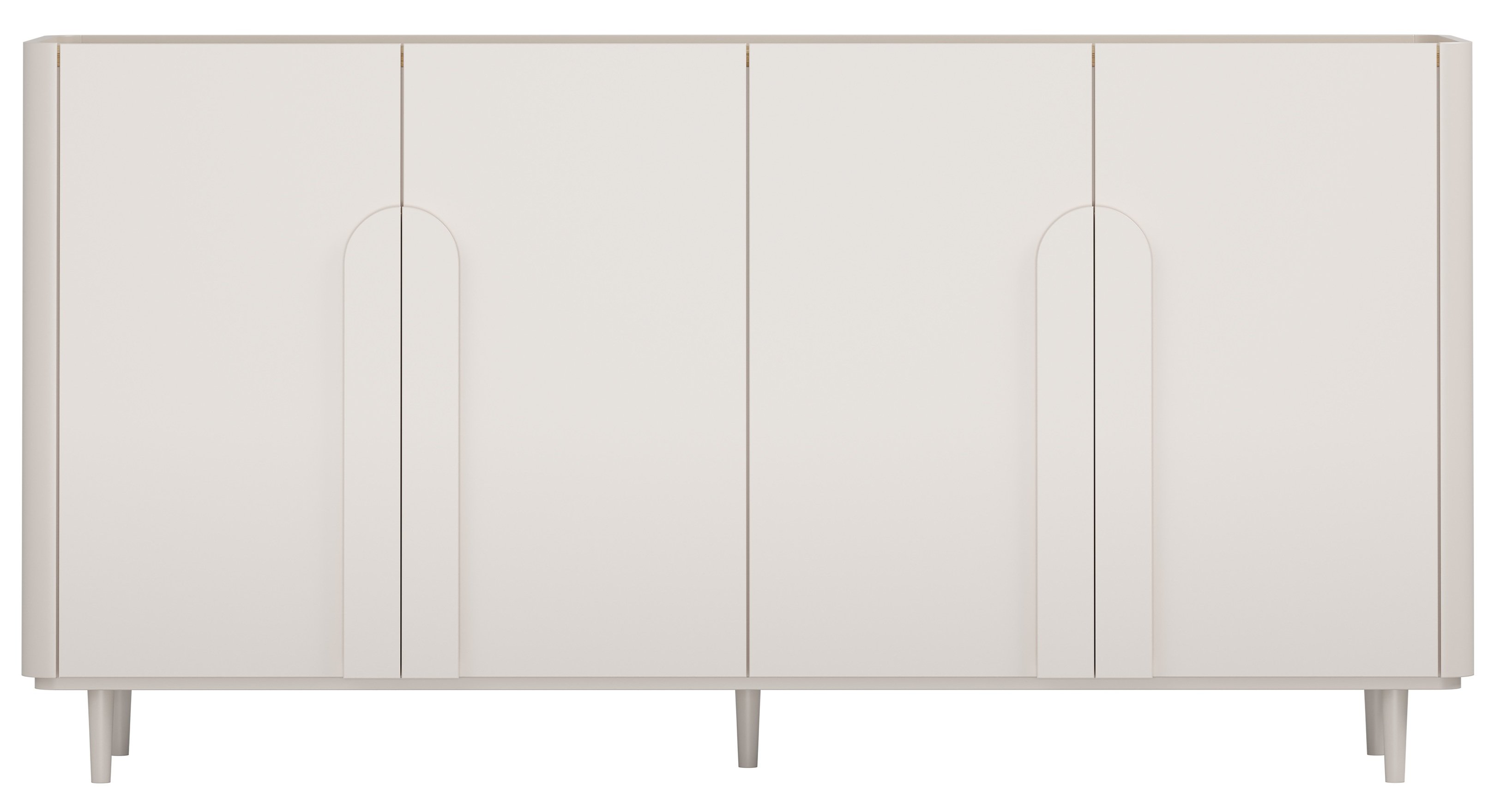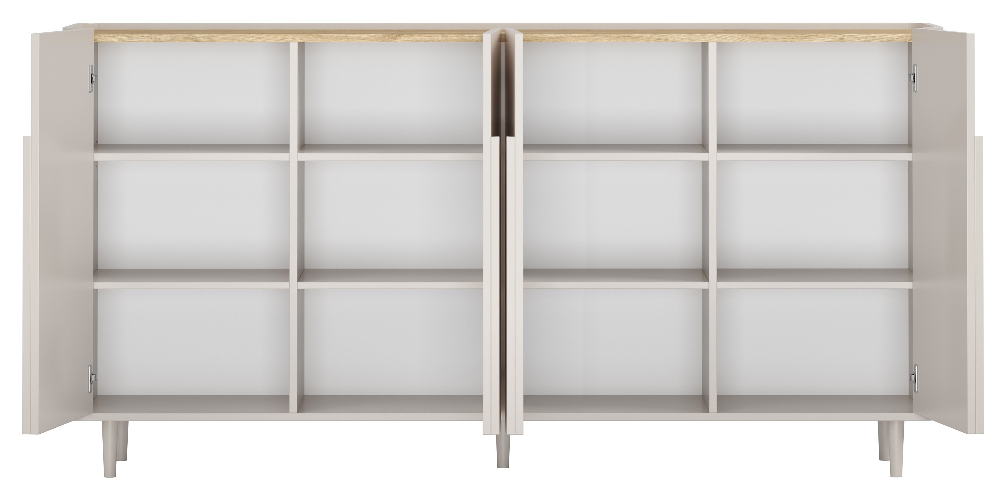 Komoda Amilio 200 4D dizajnirana je s mišlju na praktičnost. U unutrašnjosti skriva osam podesivih polica koje je moguće prilagoditi na tri razine. To omogućuje da prostor uredite prema svojim potrebama – bilo za pohranu dokumenata, tekstila, posuđa ili dekorativnih predmeta. Četiri vrata opremljena su mehanizmom za meko zatvaranje, što sprječava lupanje i povećava udobnost pri uporabi. Takvo rješenje posebno je prikladno za mirno kućno okruženje, gdje je tiho djelovanje važno za svakodnevnu udobnost.