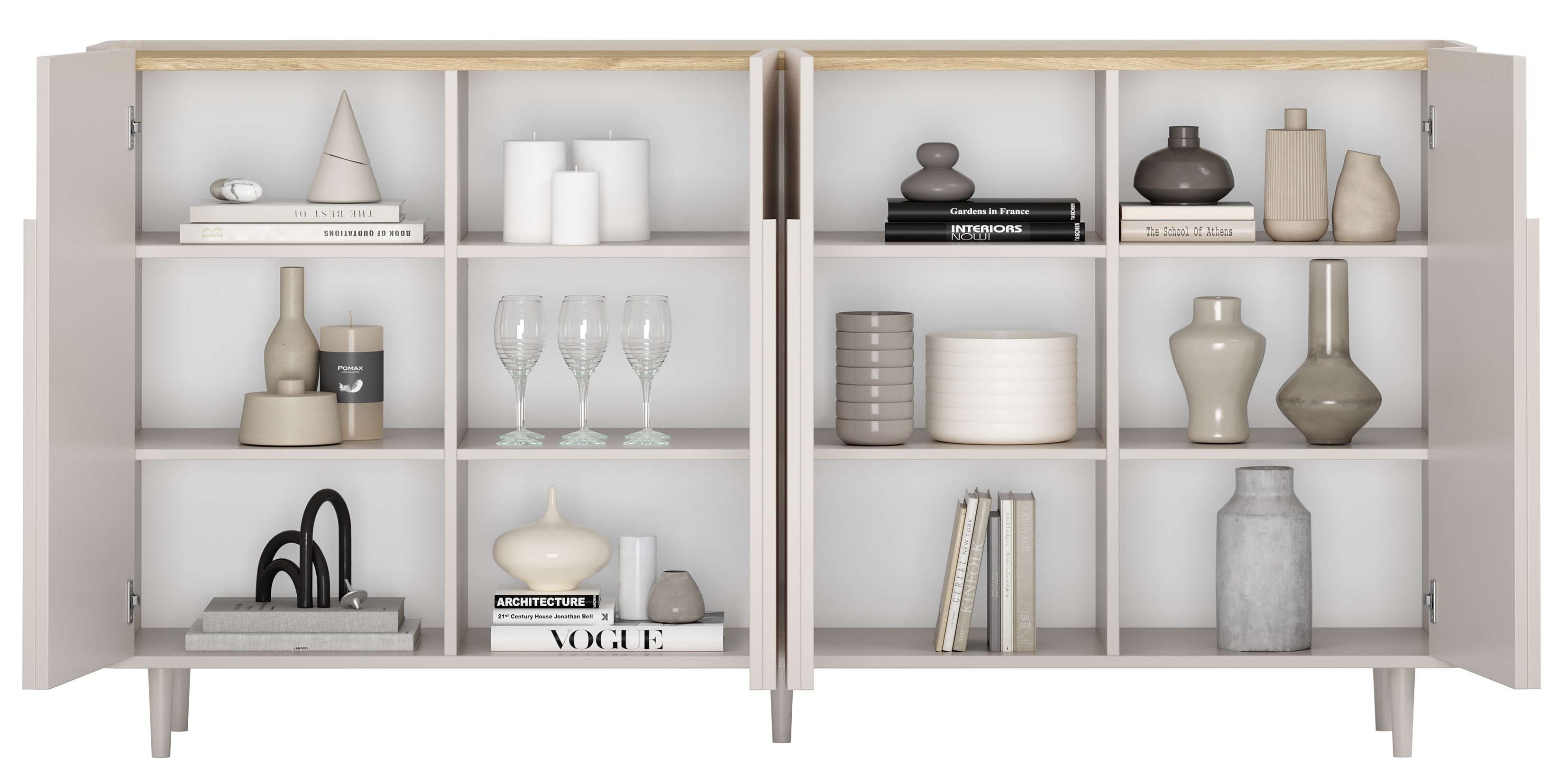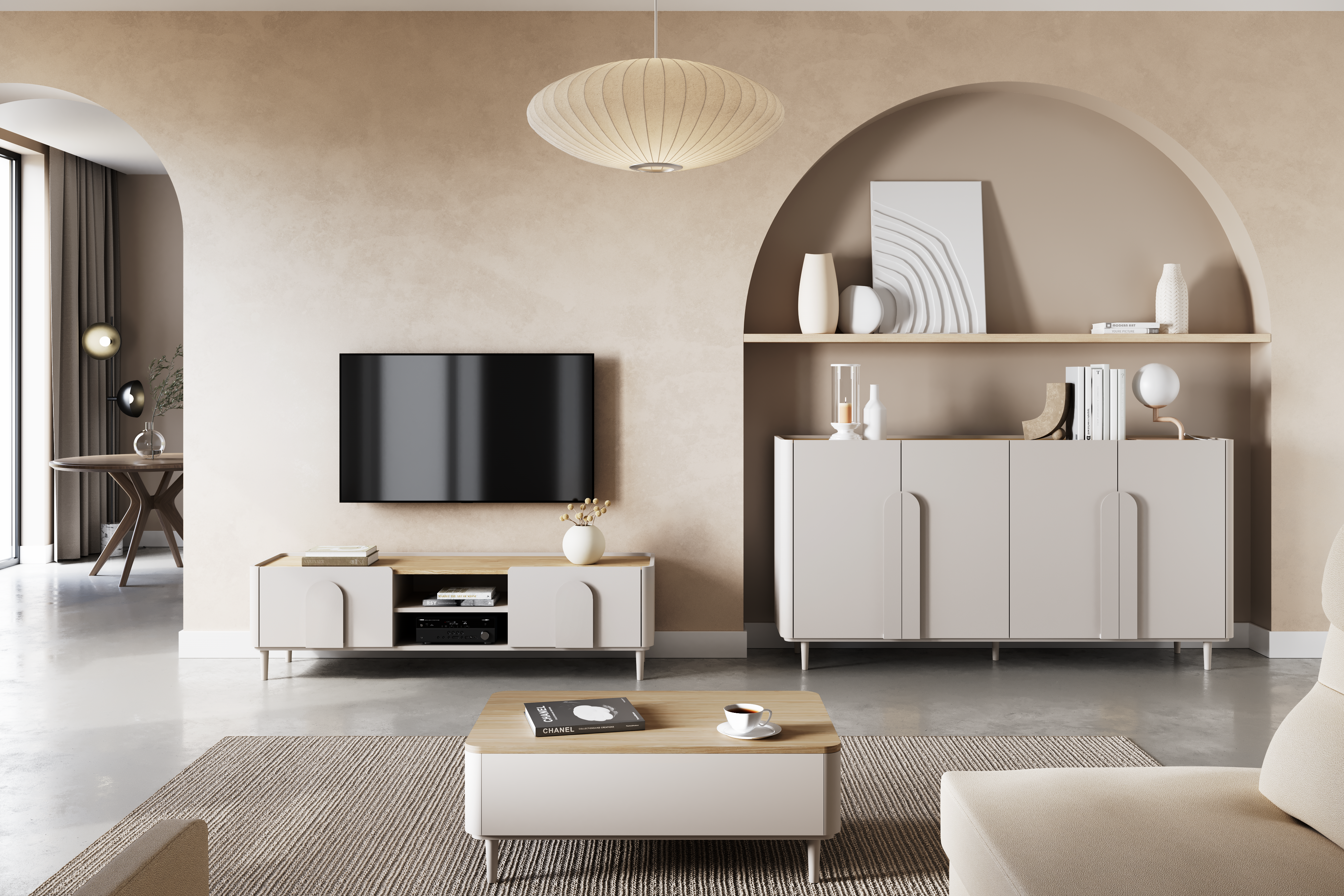Komoda Amilio 200 4D marke Bogart je profinjen komad namještaja koji spaja eleganciju kašmira s prirodnom toplinom nauljenog hrasta. Njezina uravnotežena kombinacija boja stvara harmoničan kontrast koji se savršeno uklapa u suvremene i klasične unutarnje stilove. Dizajnirana je tako da nudi mnogo prostora za pohranu, a istovremeno zadržava laganu, minimalističku estetiku. Komoda je prikladna za dnevni boravak, spavaću sobu, blagovaonicu ili kućni ured, gdje postaje praktičan i dekorativan element prostora.