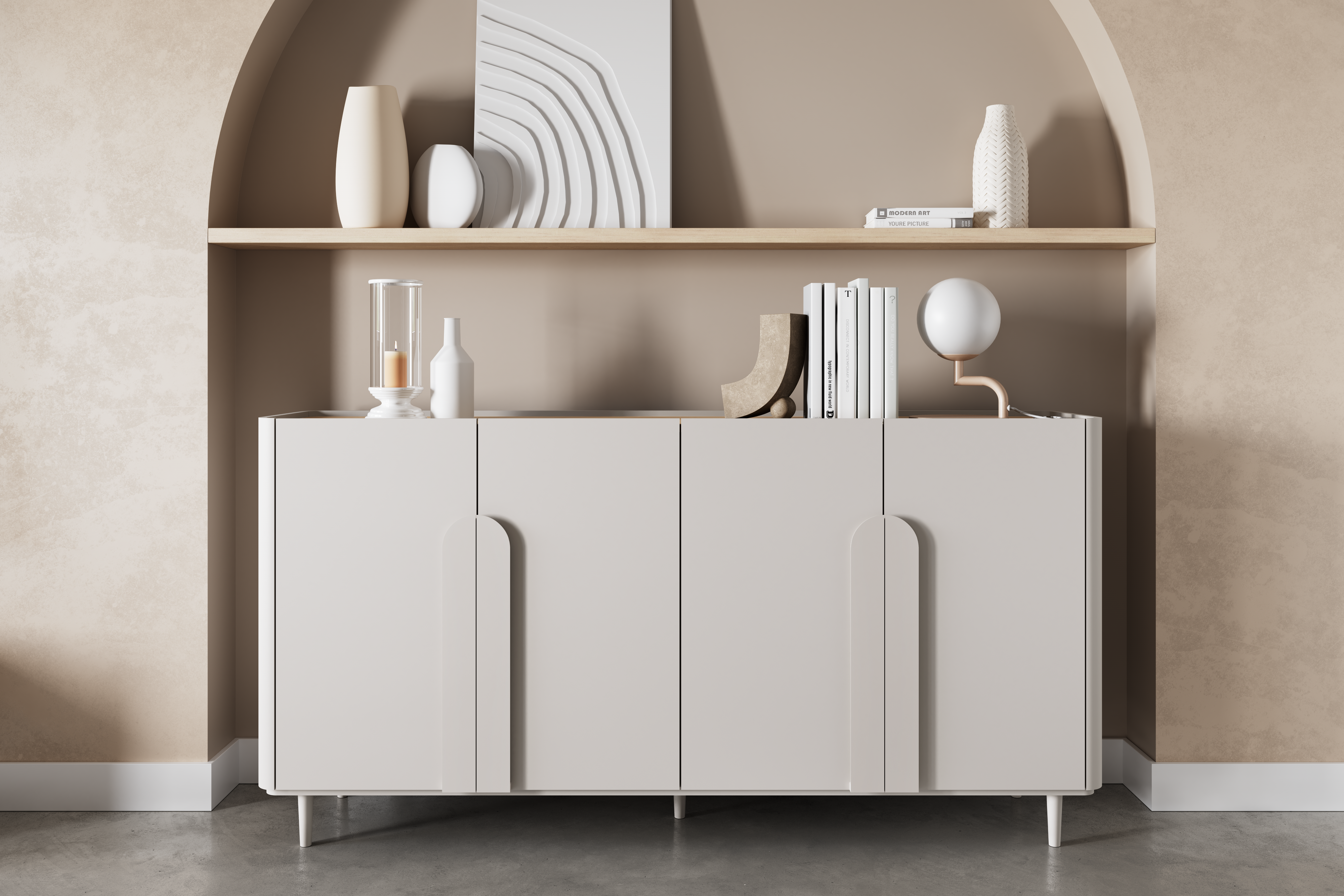 Stil komode opisan je kao moderna klasika s dodirom skandinavske i minimalističke estetike. Zahvaljujući svojoj smirenoj paleti boja i čistim linijama, lako se uklapa u različite unutarnje koncepte. U modernom prostoru nadopunjuje svijetle površine i metalne dodatke, dok se u skandinavskom slaže s prirodnim materijalima, svijetlim drvom i tekstilom u sivim ili bež tonovima. U minimalistički oblikovanim interijerima djeluje kao elegantan naglasak koji ne preuzima pozornost, već je suptilno nadopunjuje.