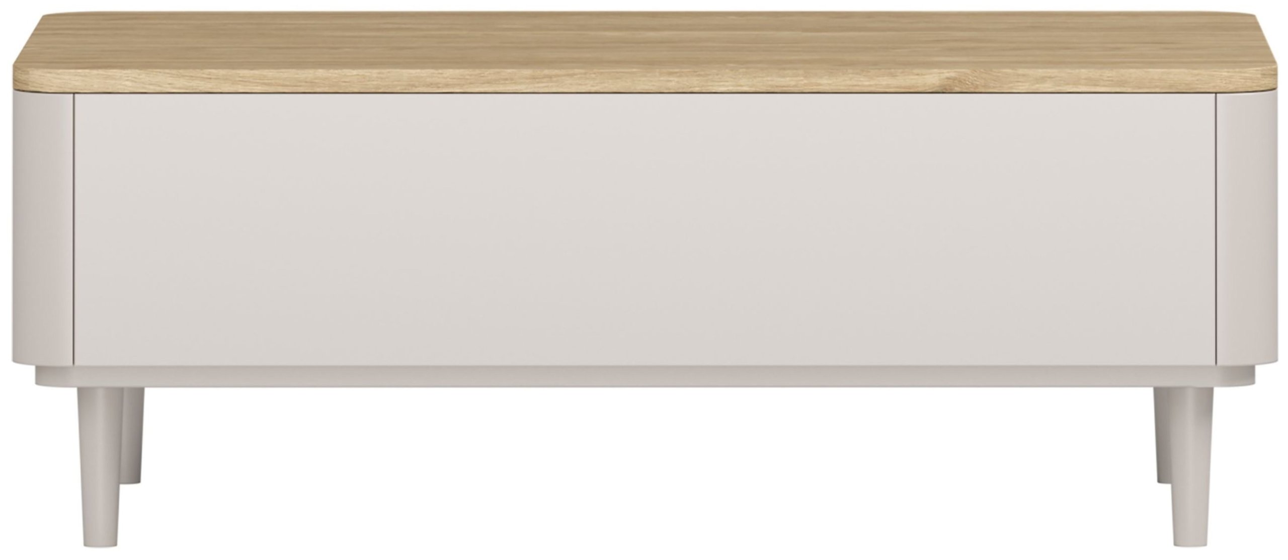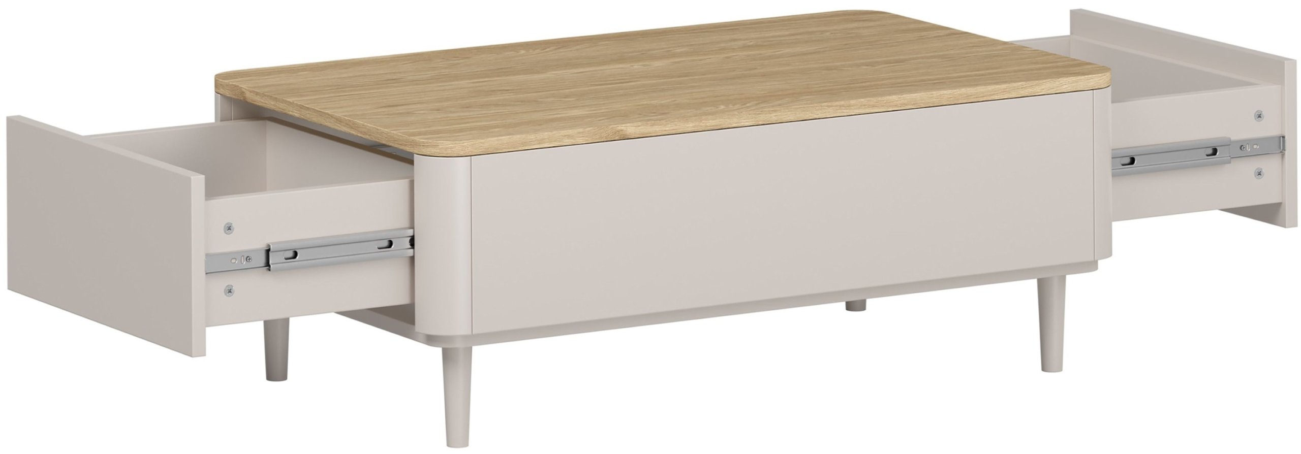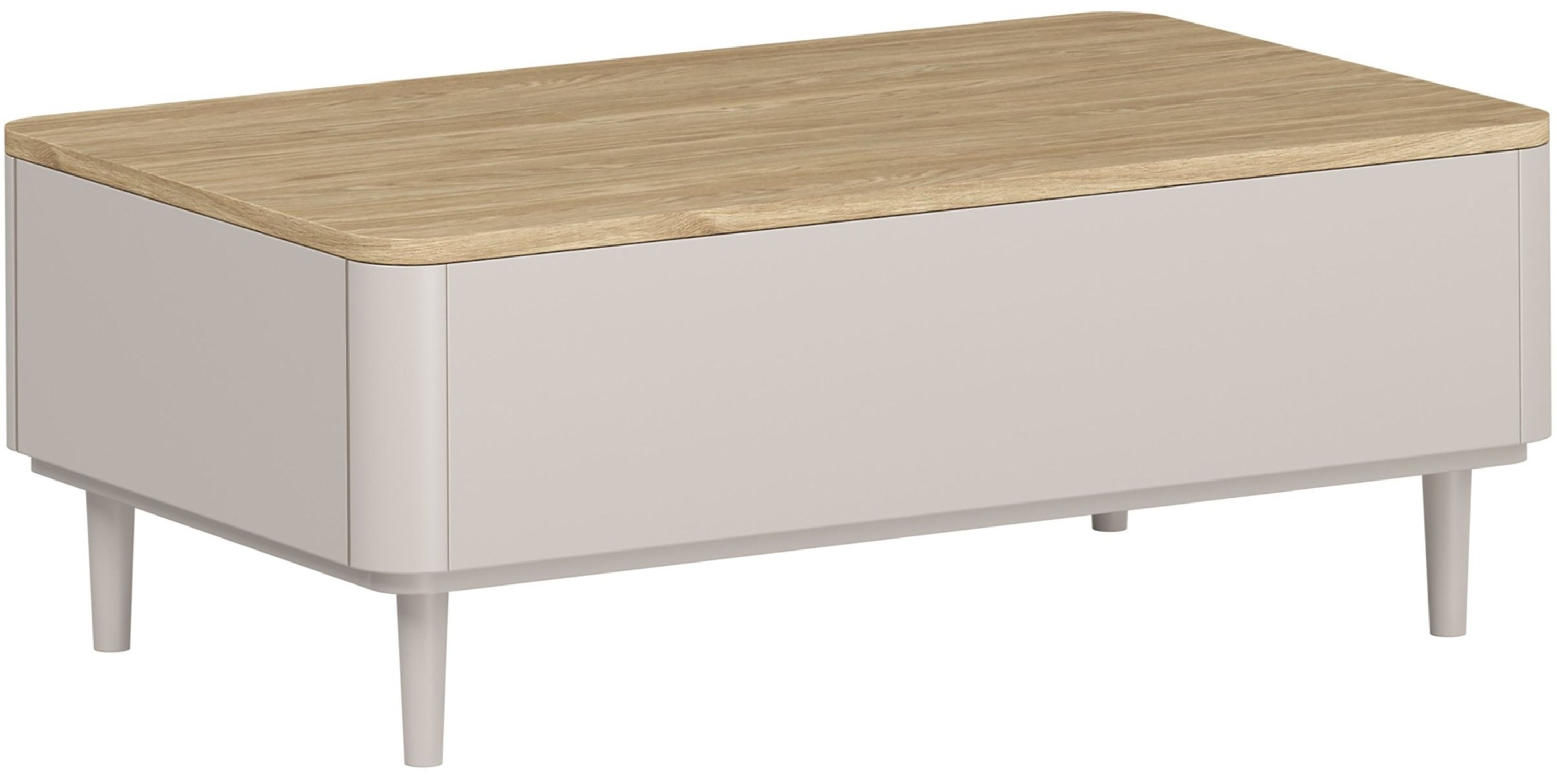 Površina u nijansi kašmira savršeno se slaže s gornjom pločom u uljenom hrastu, što stvara ugodan kontrast i osjećaj prirodne topline. Kombinacija nježnog mat kašmira i toplog hrastovog tona lijepo se uklapa u suvremene, skandinavske i minimalističke interijere. Zbog univerzalne palete boja, stolić Amilio lako se povezuje s raznim nijansama podova, tekstila i drugih komada namještaja. Noge od bukovog drva visine 13 cm usklađene su u nijansi kašmira, što doprinosi jedinstvenom izgledu i osjećaju lakoće.